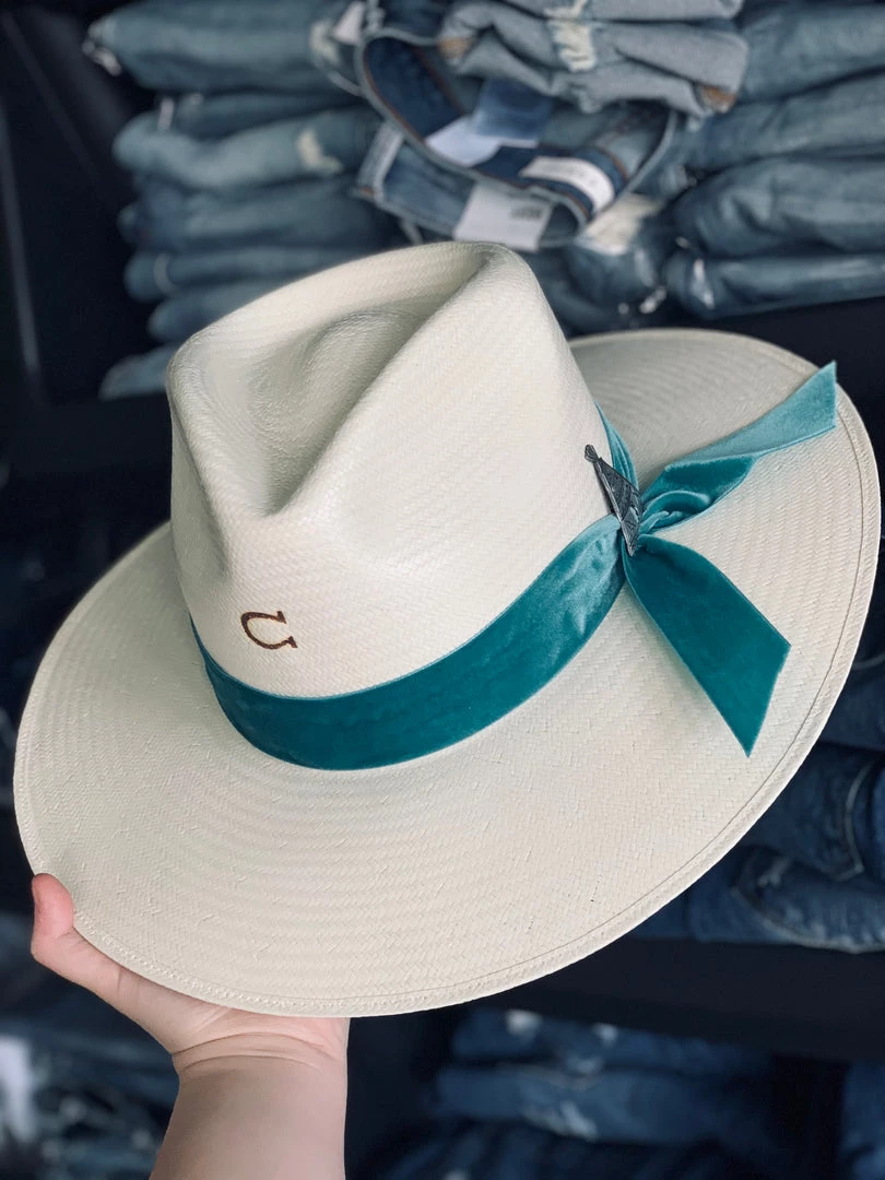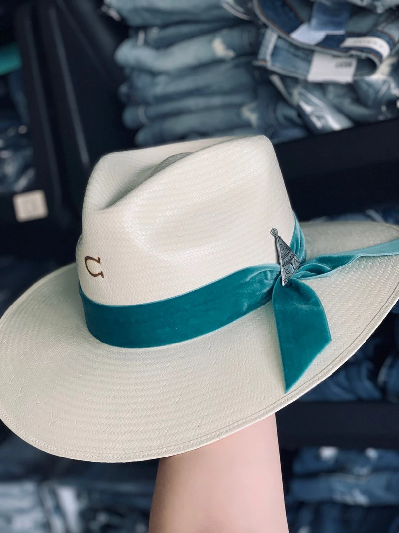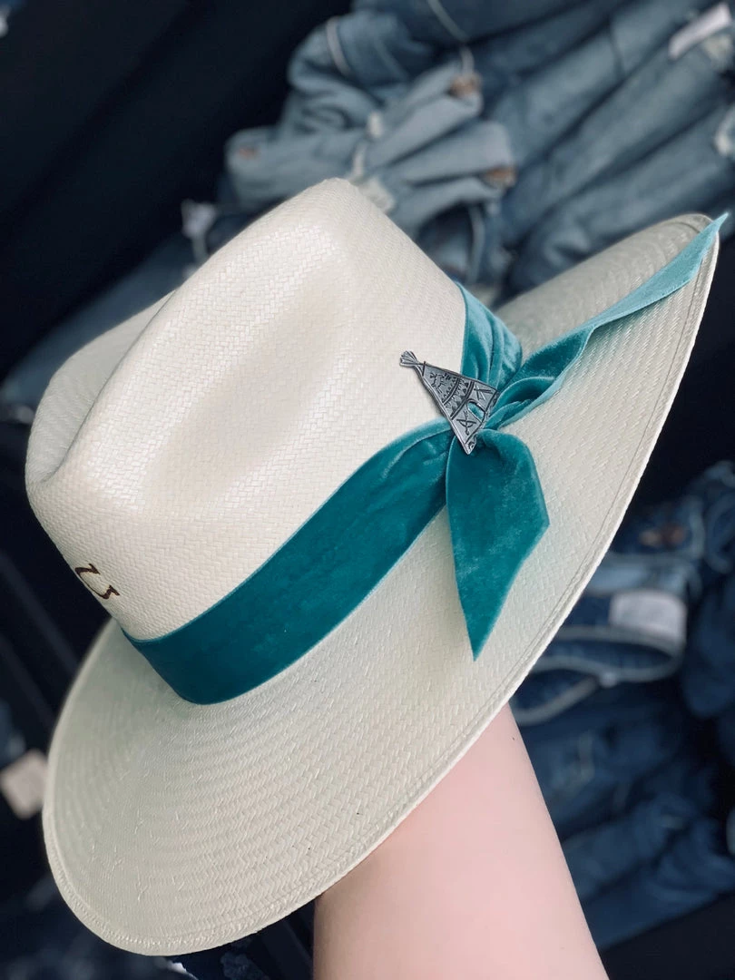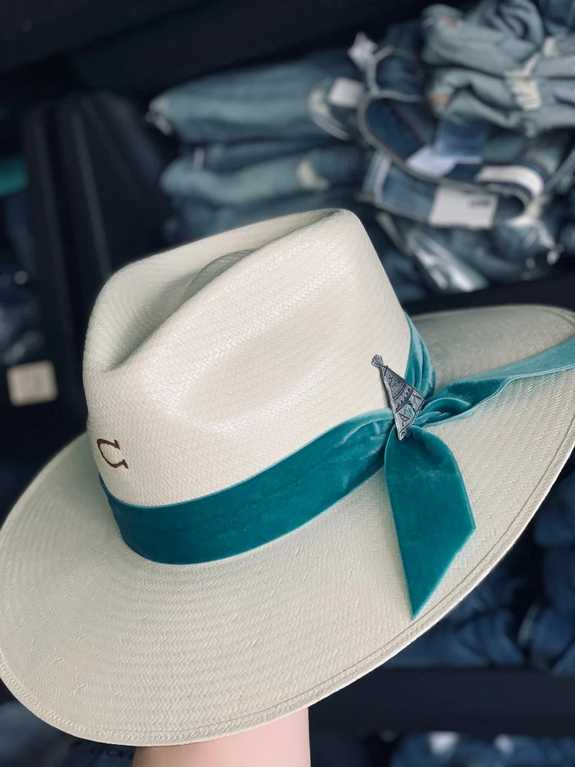 Gorgeous natural colored straw Charlie1 horse structured hat. Straw hat features a 3 1/2″ Brim, with a velvet turquoise hat band and a beautiful engraved matte silver western aztec teepee pendent that makes for an ideal accessory in every woman’s travel wardrobe. Hat has a traditional pinch front crease with a branded C logo. Hat is super light weight and comfortable. This hat adds a whimsical charm to any babes western flair! The ready to hit the road look is carefree and goes well with both western and urban cowgirl looks.