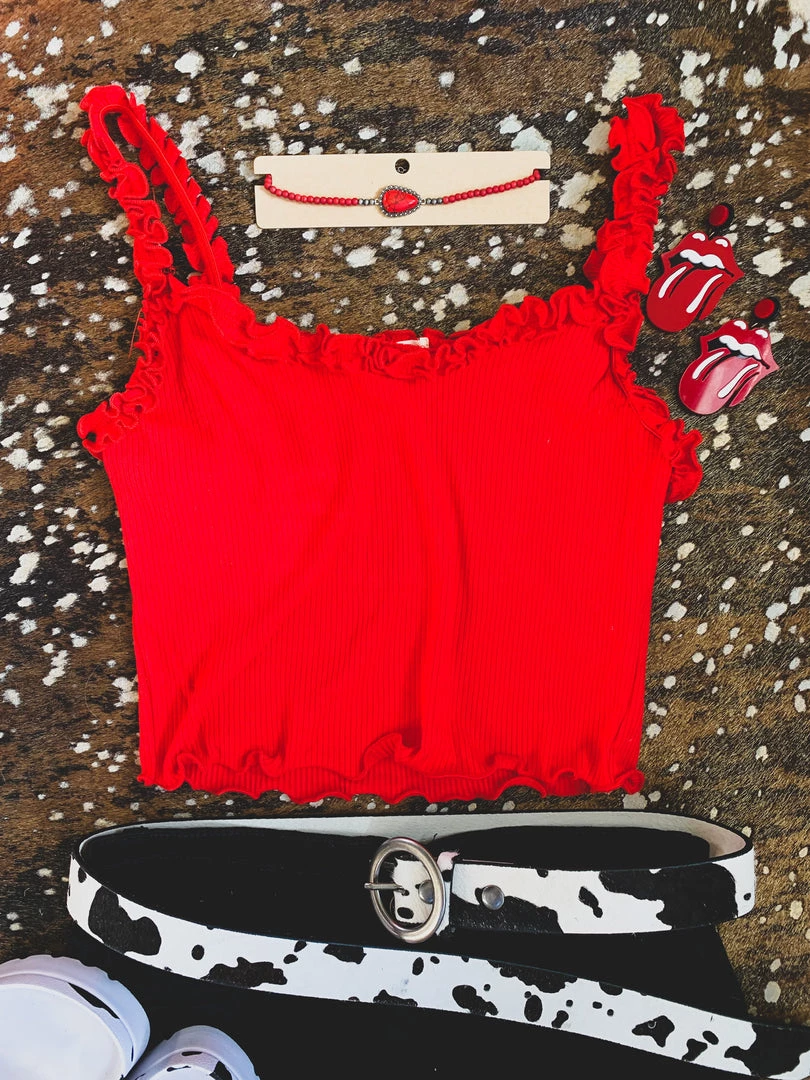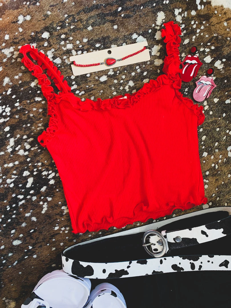 Red ribbed crop top features lettuce frill trim on the neckline and throughout the cami straps. Top is stretchy and fitted. Totally retro and perfect to pair with vintage bell bottoms or pants. Add a denim jacket for the Fall.Â