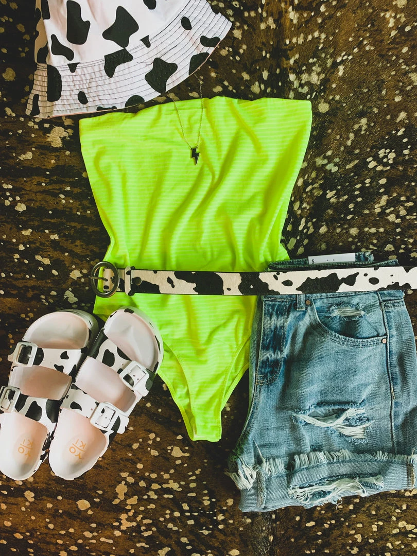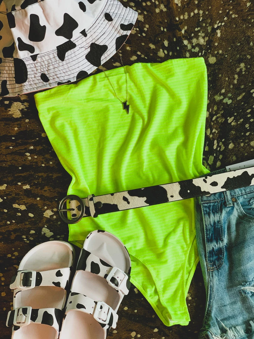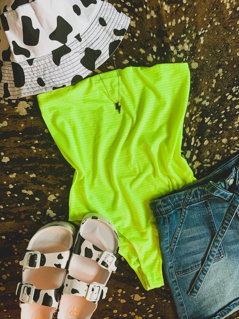 Neon and white horizontal stripe tube bodysuit has us GW gals obsessed. Tube bodysuit features horizontal neon and white stripes, button snap closure, and an elastic tube top hem for easy slip on and comfort. Bodysuit features stretch and material is breathable and soft. Pair with your favorite denim bell bottoms, shorts or even throw on a denim jacket for Fall.