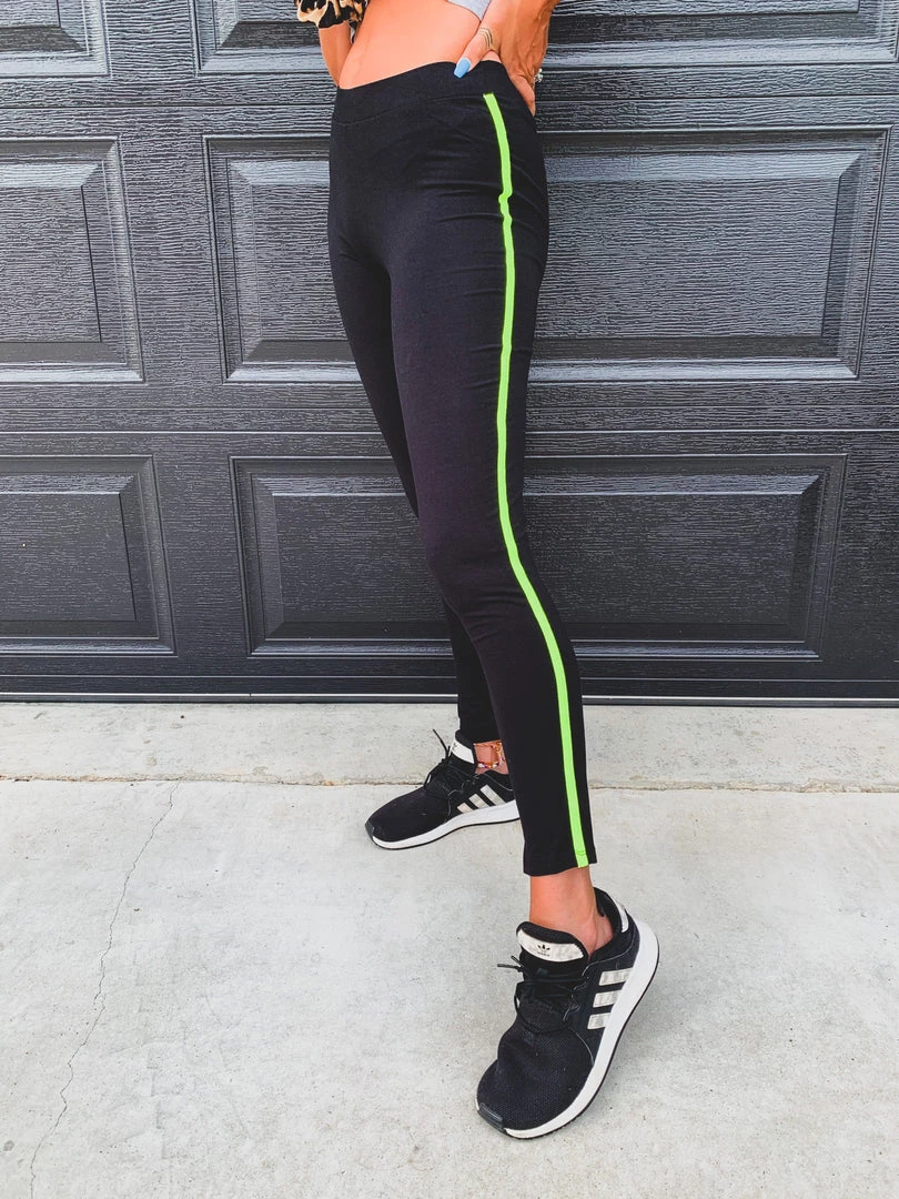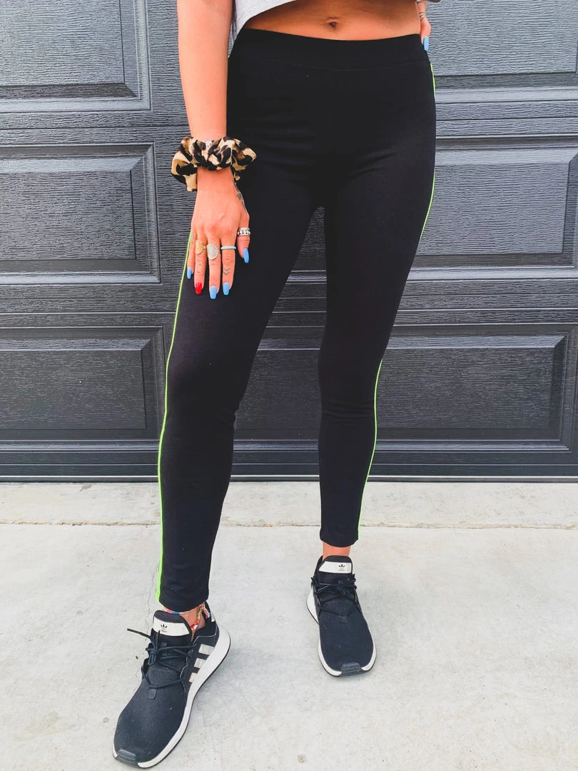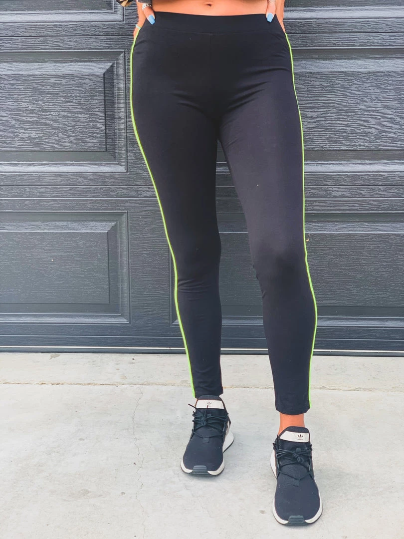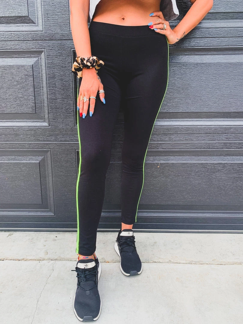 Super soft black leggings with a bright neon yellow stripe down each side. Leggings feature a high waist with a smooth stretchy waistband, super soft and stretchy material, chic neon yellow stripe on each side of the leggings. Perfect to pair with your favorite bodysuits, crop tops, and graphic tees.Â