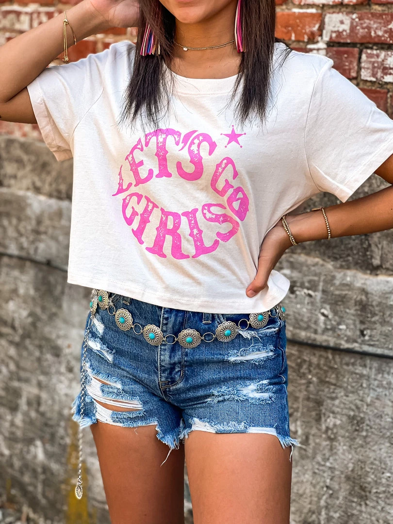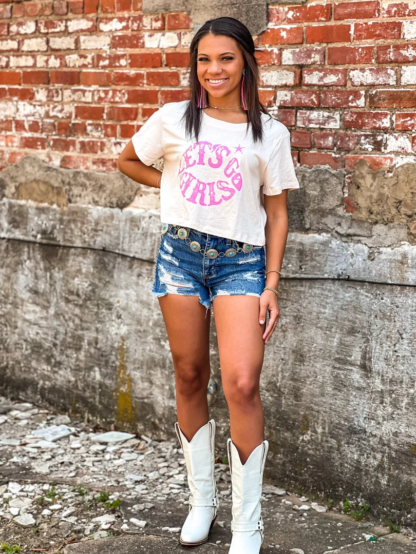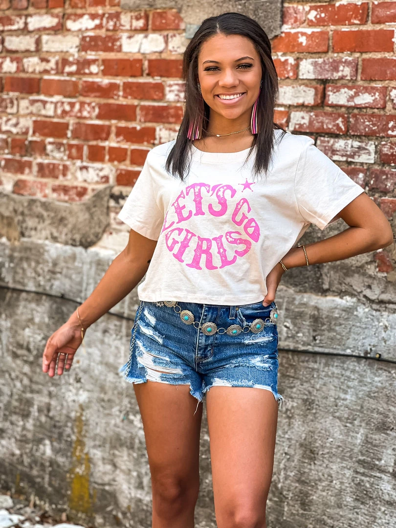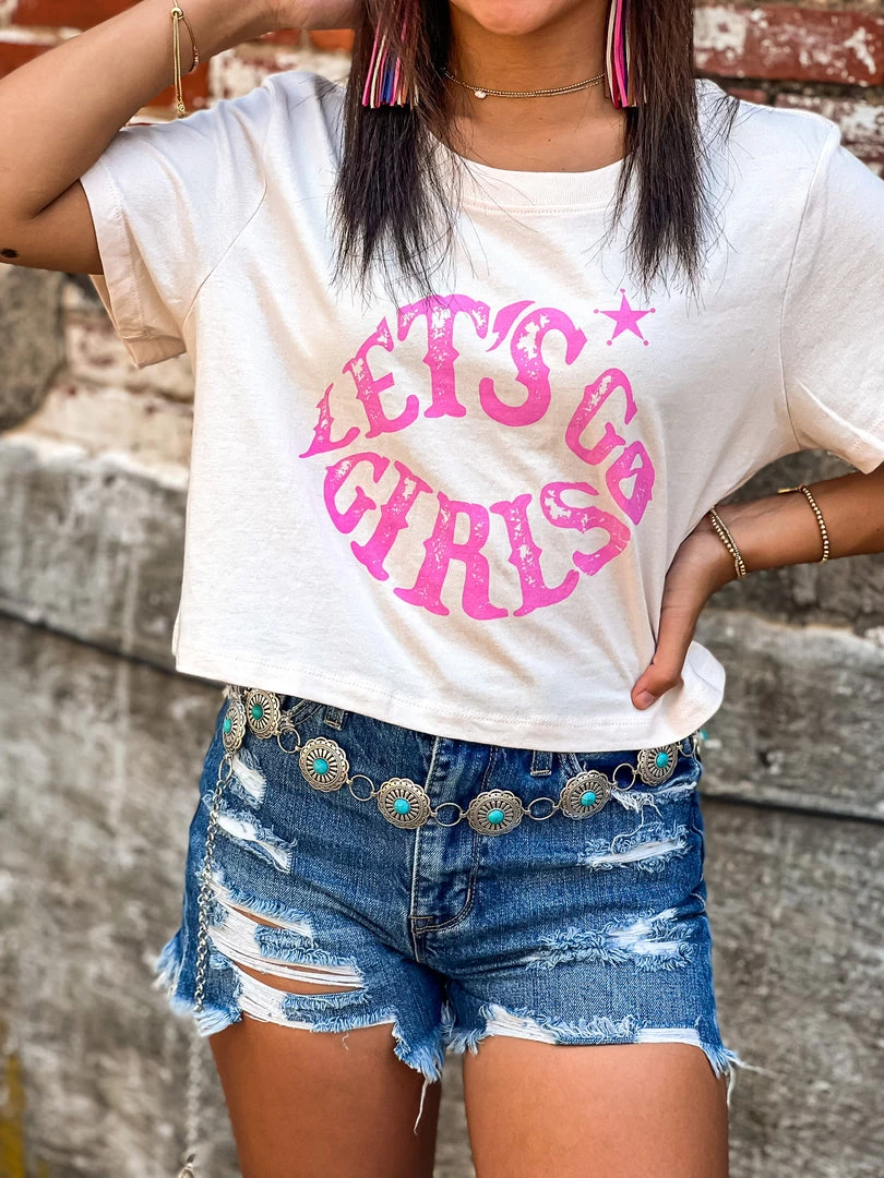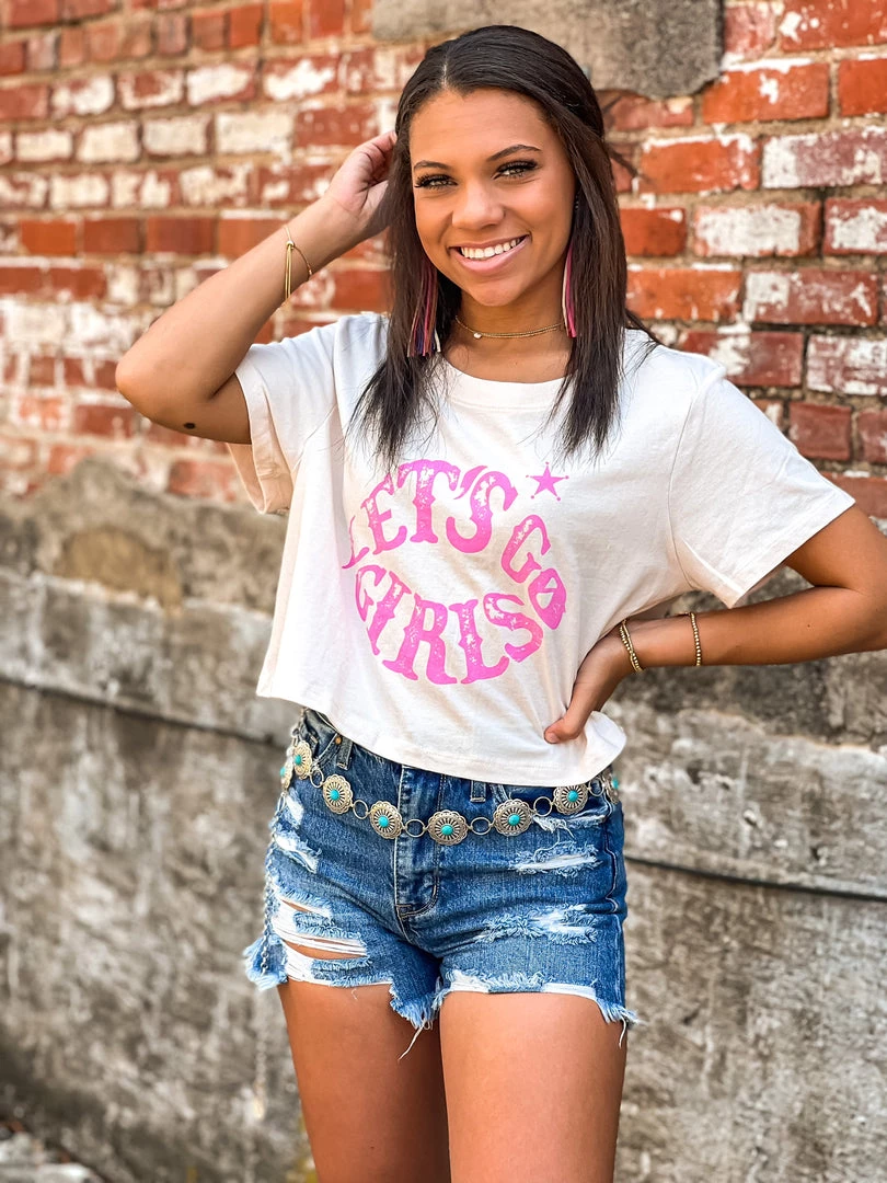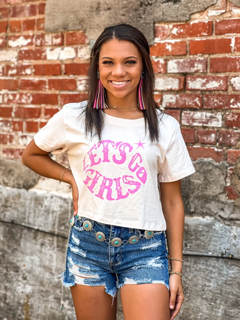 - Western “Let’s Go Girls” quote on a cropped super light pink graphic tee