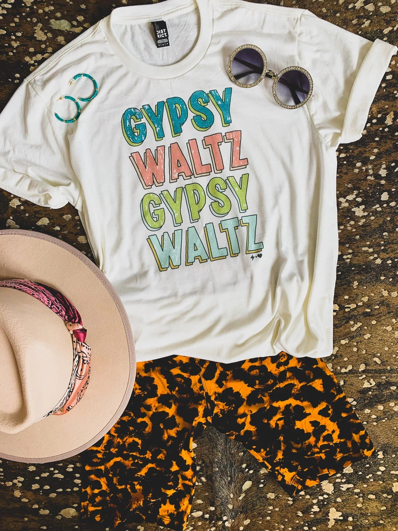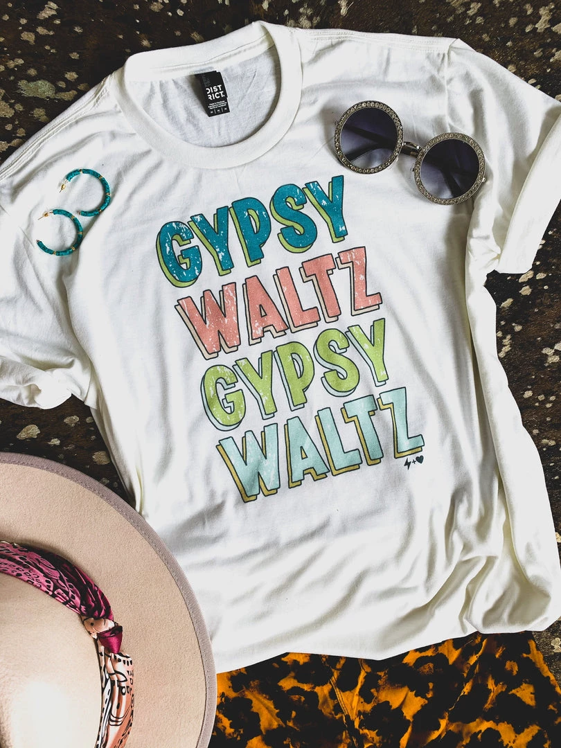 Cream colored Gypsy Waltz logo graphic tee is perfect for all our gals! Tee features ” GYPSY WALTZ GYPSY WALTZ” in colorful vintage distressed letters. Tee is SUPER SOFT!