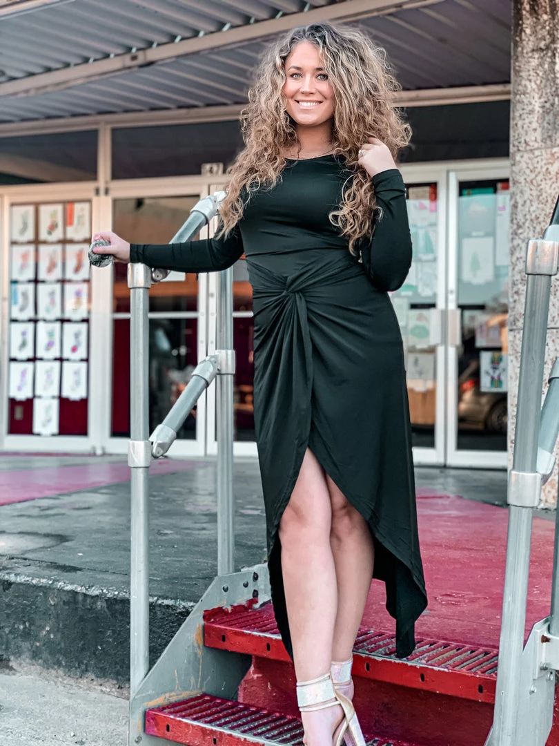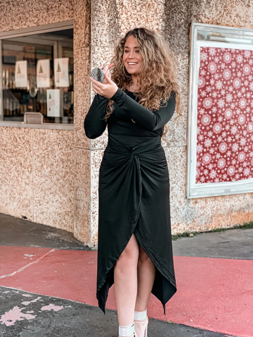 Black fitted dress is not only classy but gives you that extra SASS too! Features a fitted style with a defined silhouette while highlighting all your beautiful curves, a round neckline and long fitted sleeves, twisted from my design stomach detail, back zipper closure, and an inner lining. This dress is finished with a flowy skirt for a gorgeous and classic outline. Pair with our Pearland Hoops and Marble Fall Heels for the complete Sassy and Classy look!