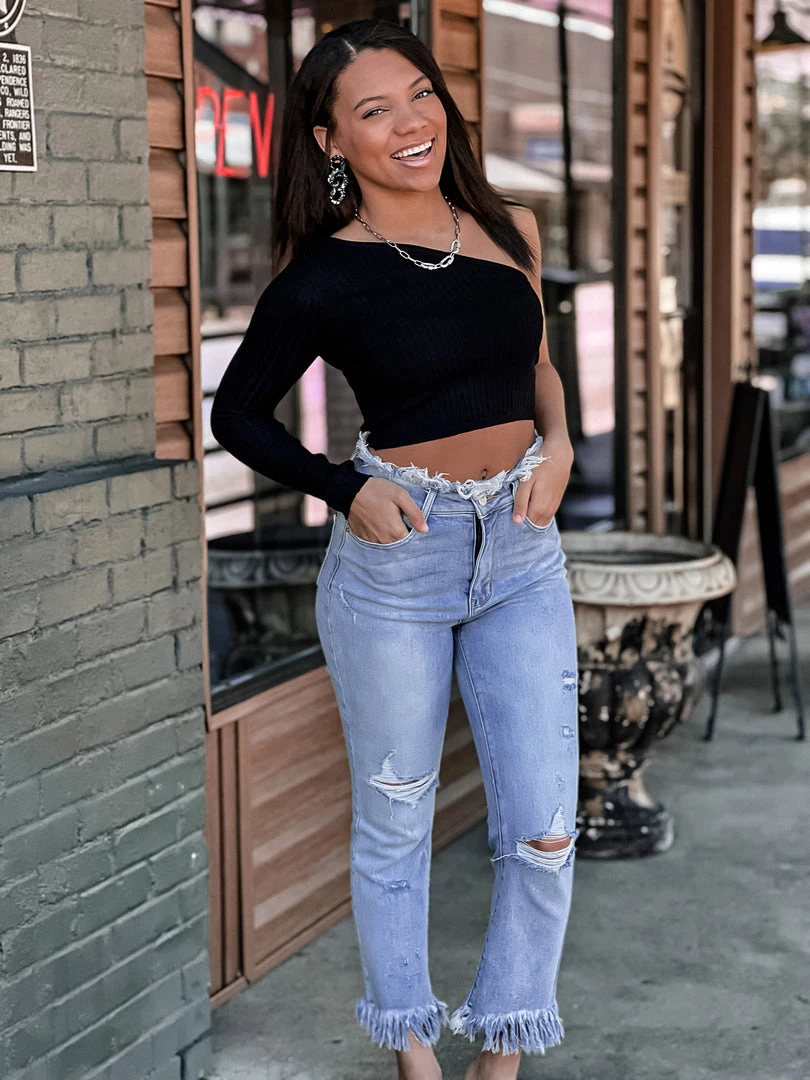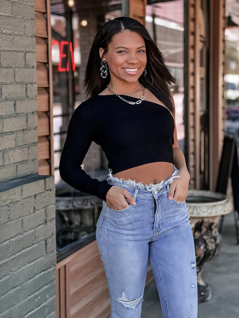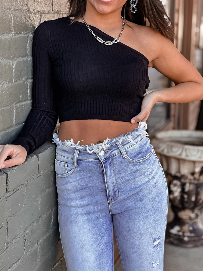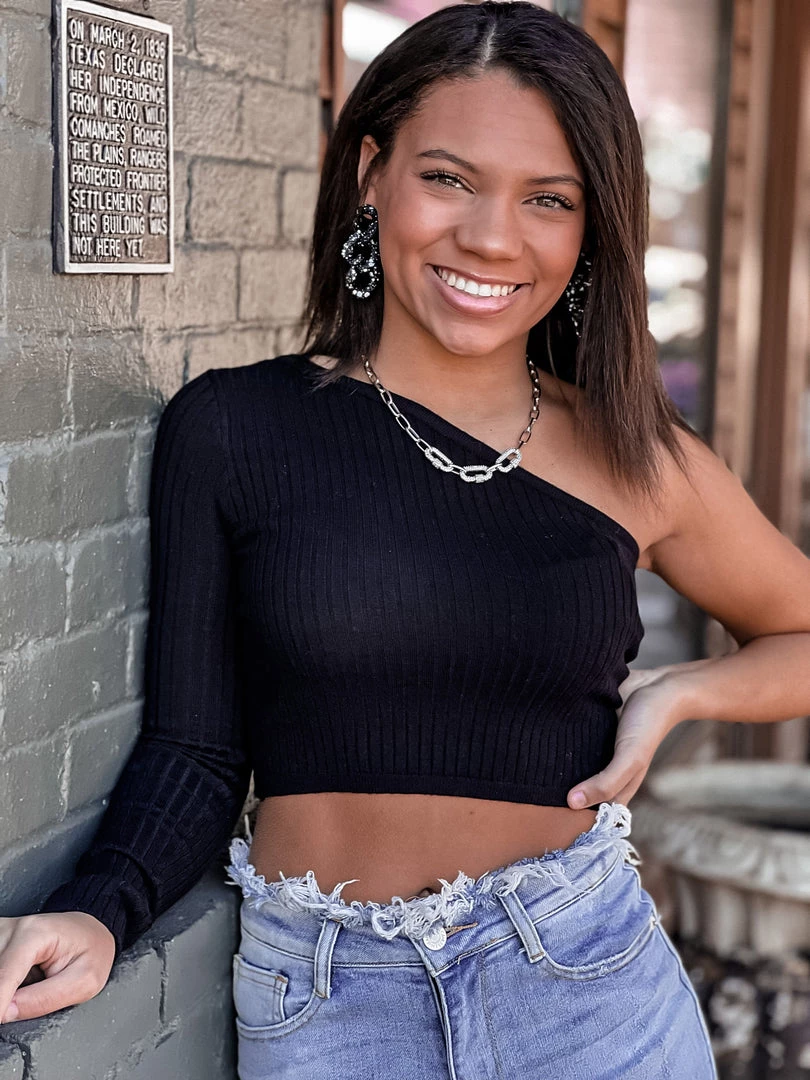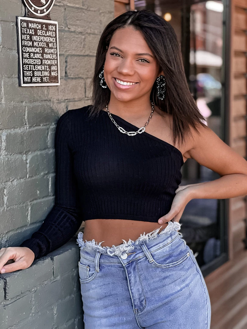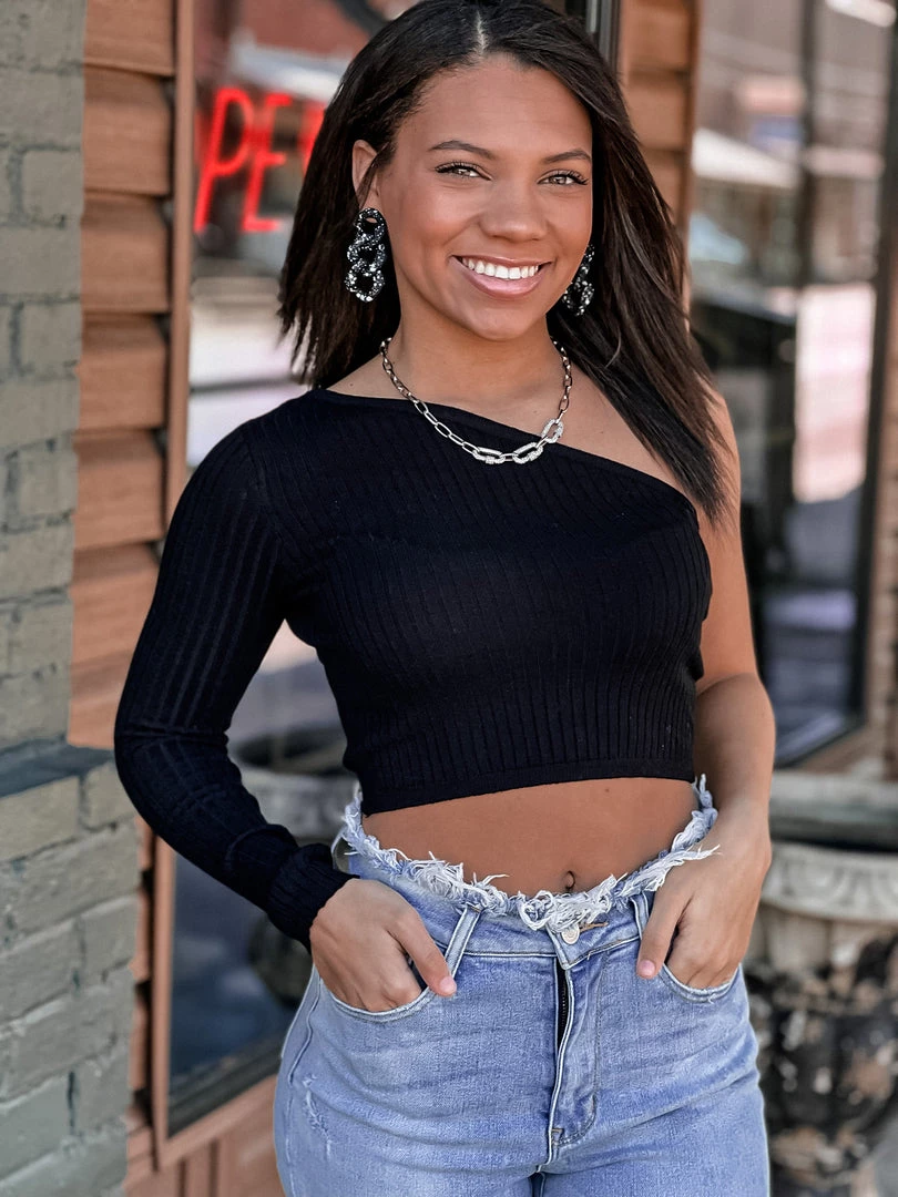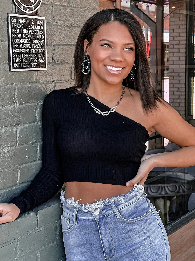 - Cute one shoulder neckline that supports a fitted long sleeve and figure hugging bodice