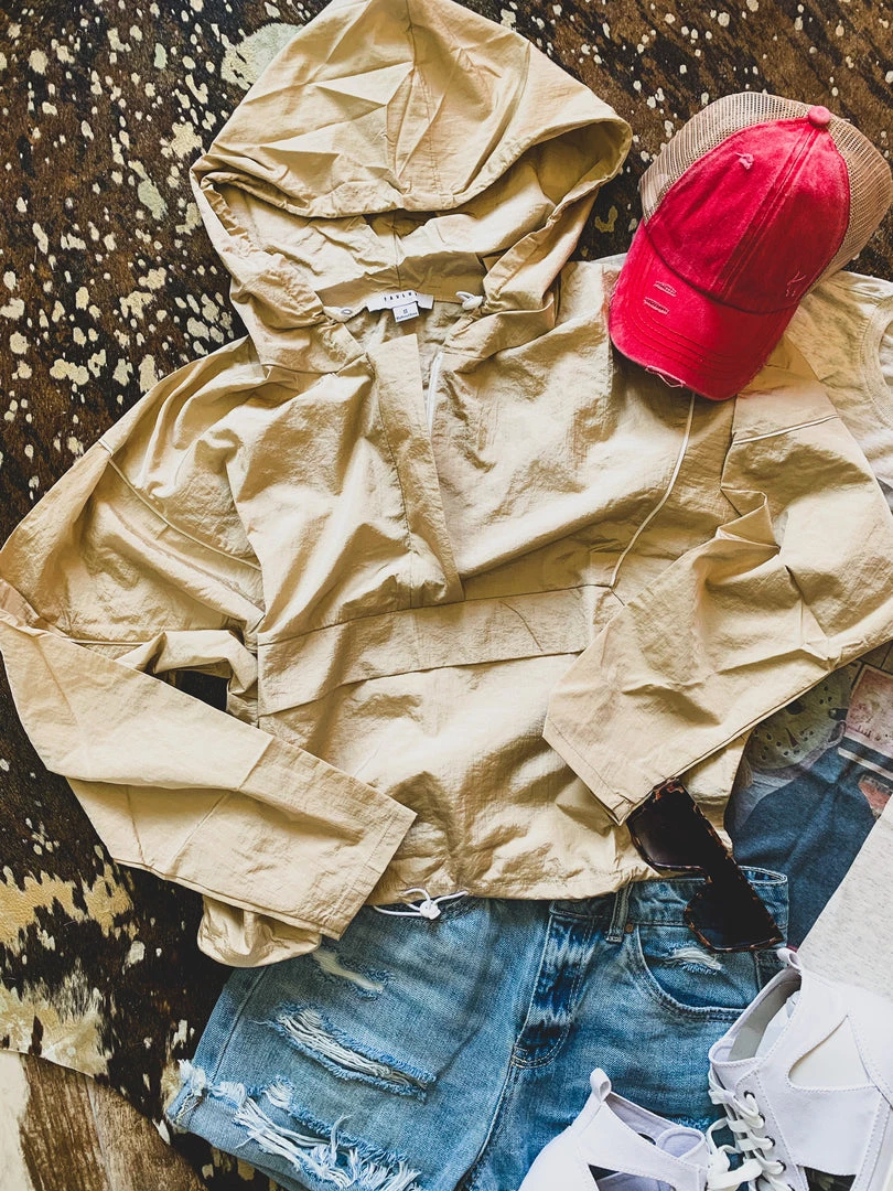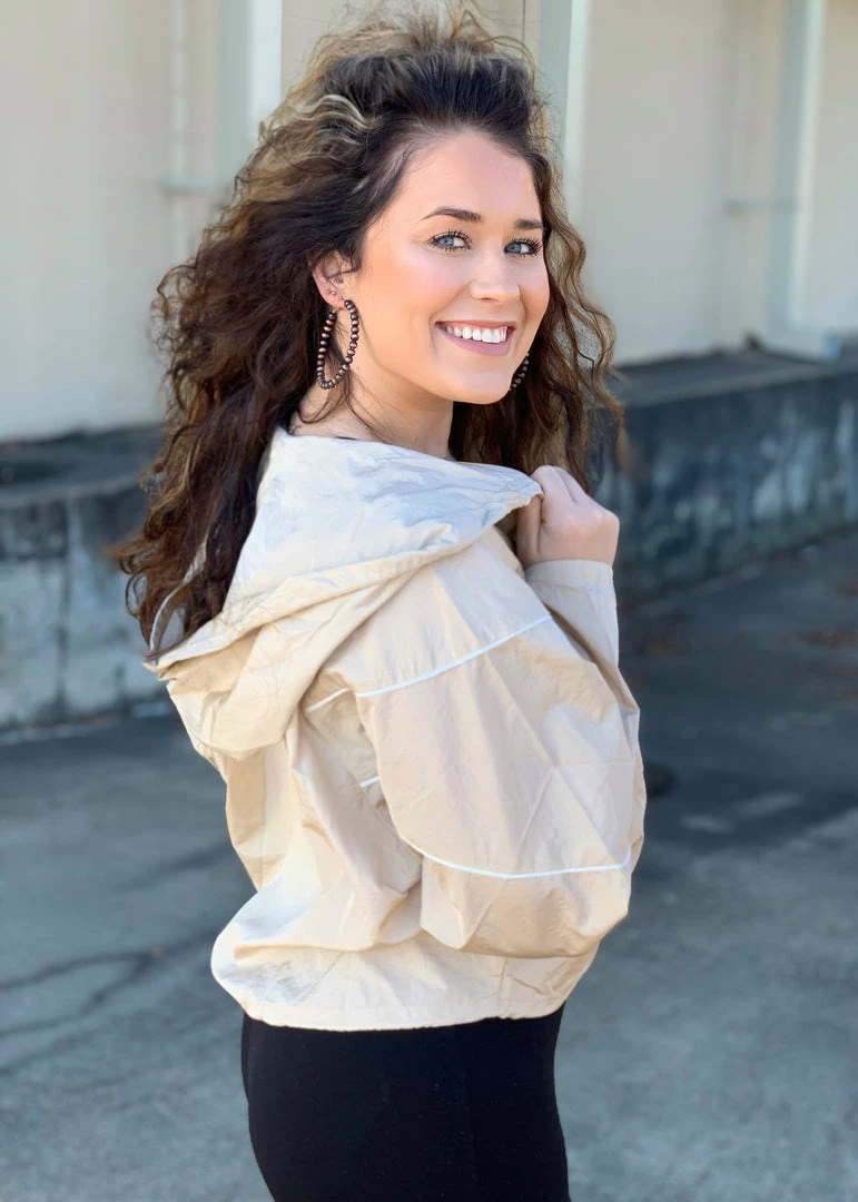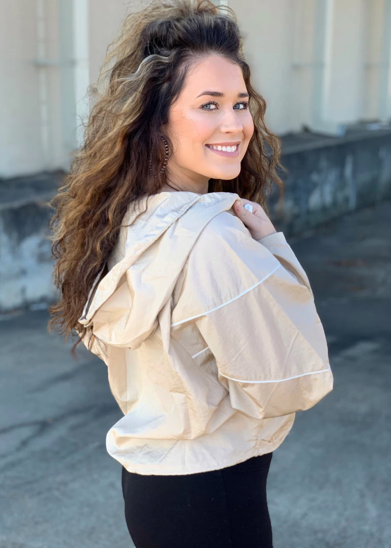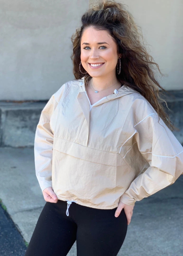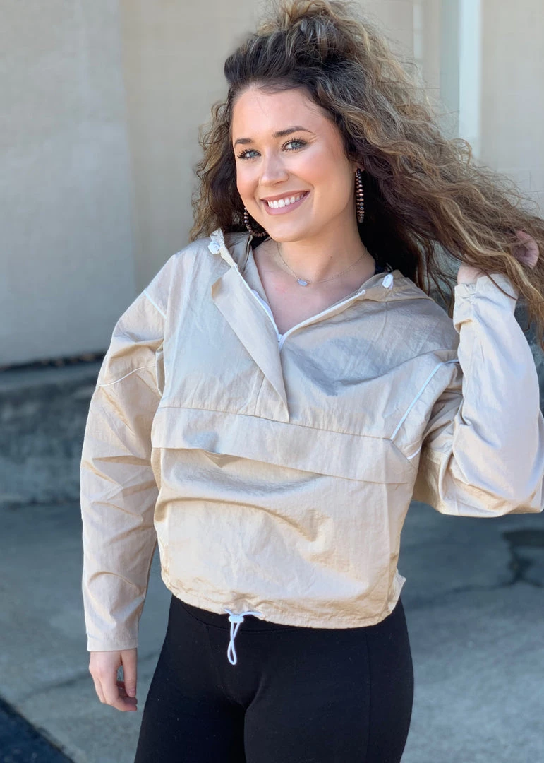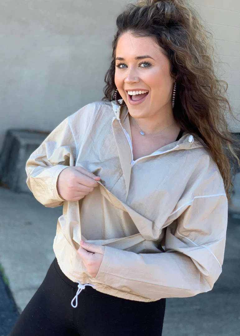 Taupe colored pullover is giving us all the wind breaker feels. Pullover is a half zip, with a big front pocket, is hooded with elastic strings to pull and adjust to your desire. Also has elastic pull string at the waist to adjust to your liking. White design on the sleeves. Super cute to pair with leggings! Can be worn year round. Super light weight.Â