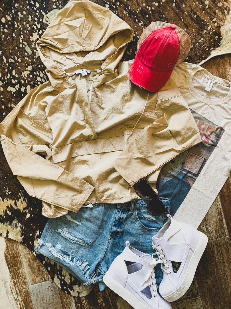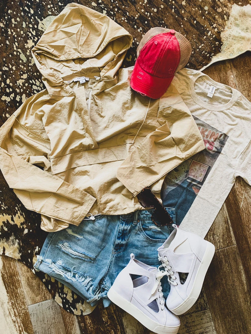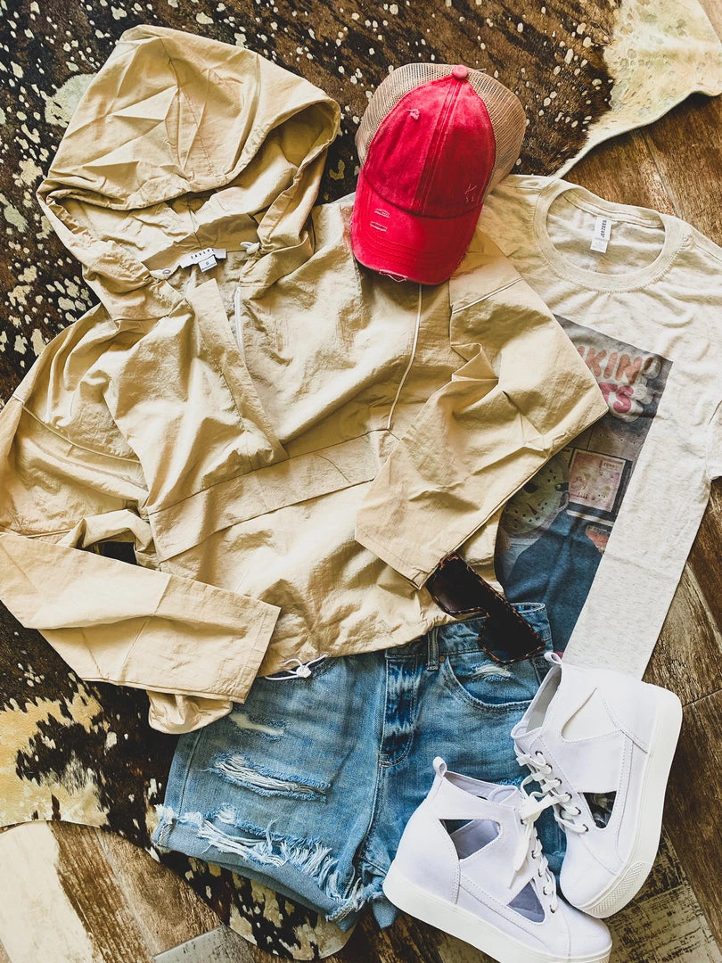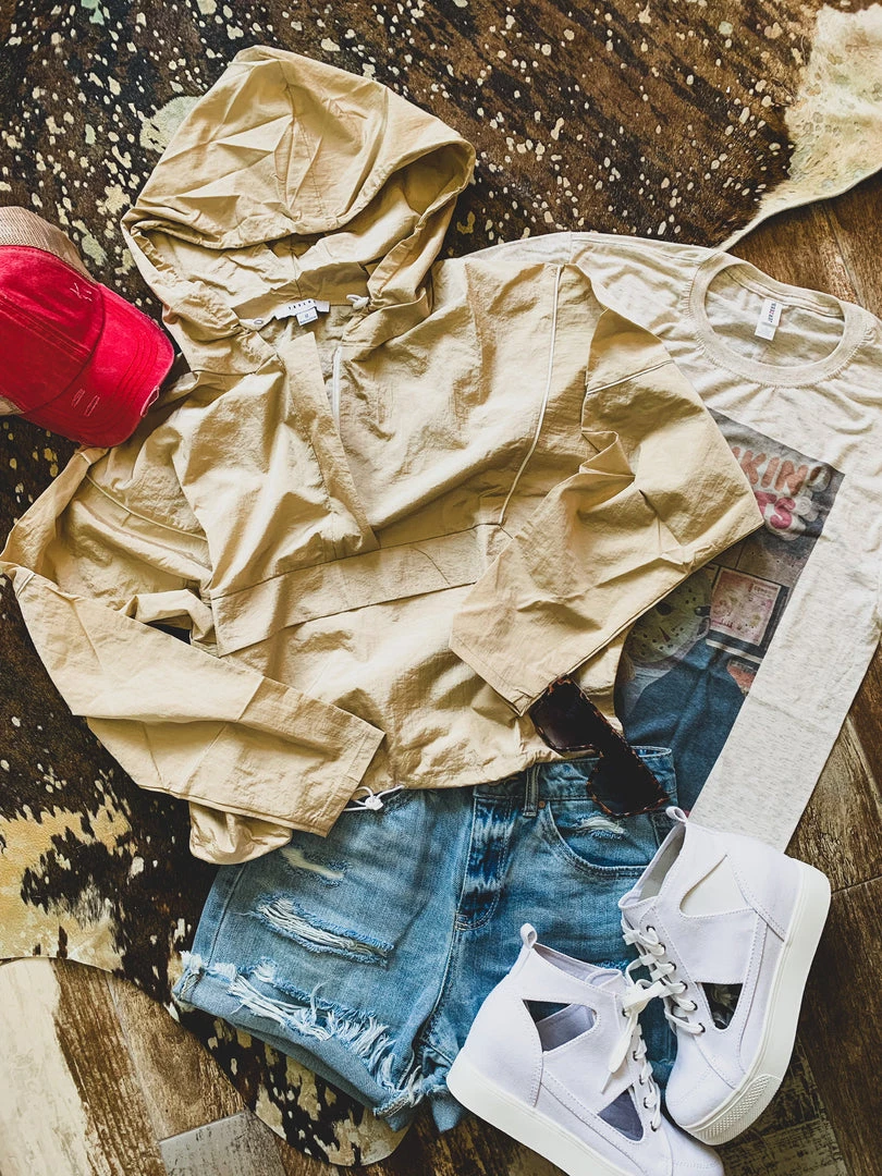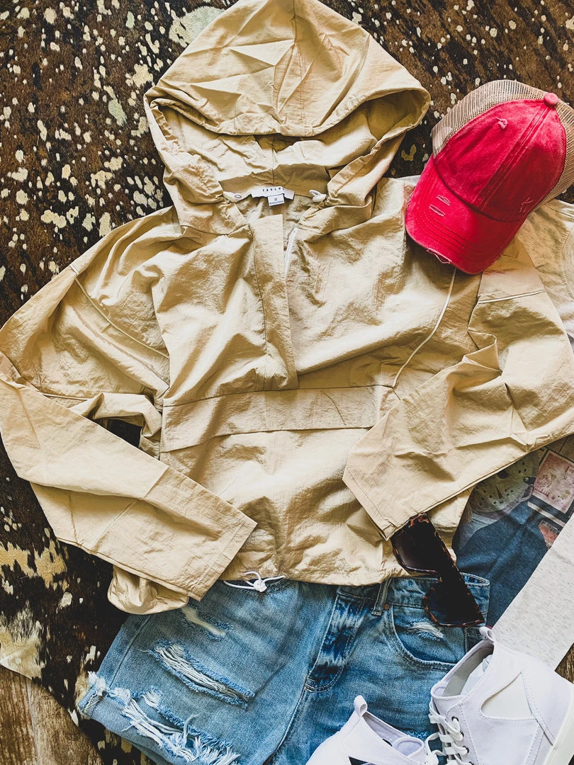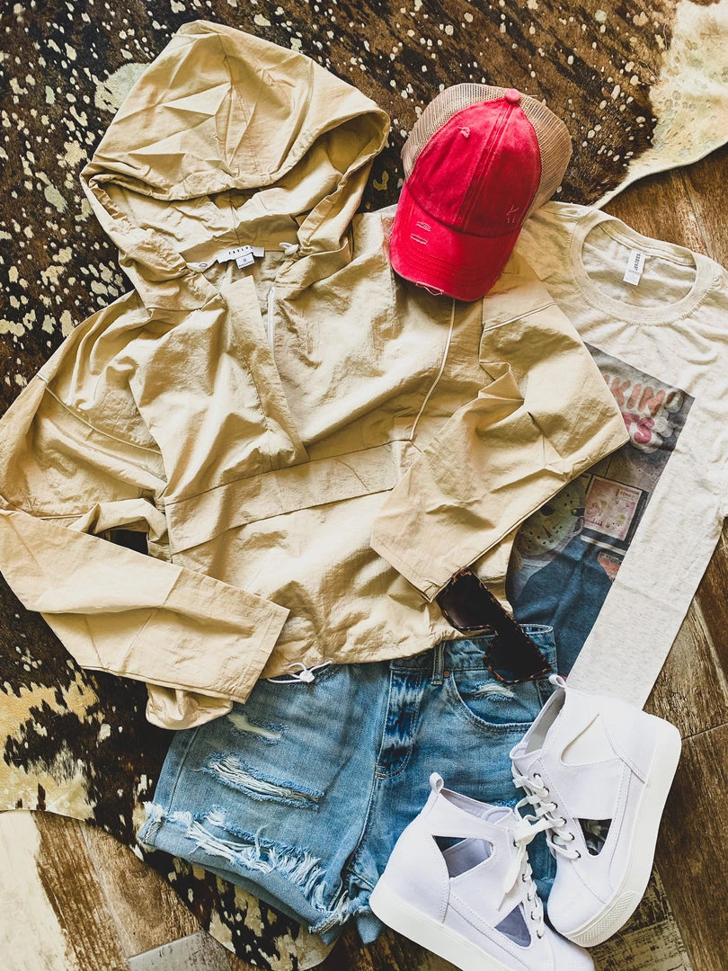 Taupe colored pullover is giving us all the wind breaker feels. Pullover is a half zip, with a big front pocket, is hooded with elastic strings to pull and adjust to your desire. Also has elastic pull string at the waist to adjust to your liking. White design on the sleeves. Super cute to pair with leggings! Can be worn year round. Super light weight.Â