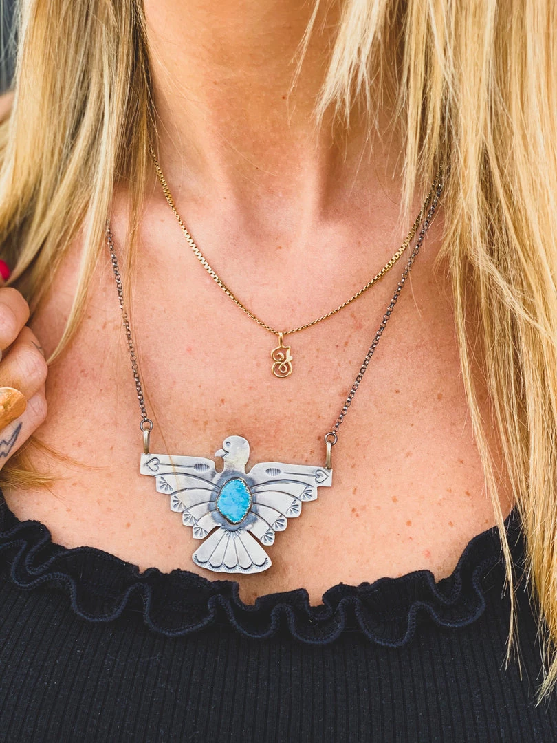 Beautiful navajo handmade Tim Yazzie stamped thunderbird turquoise stone necklace. Thunderbird features a centered authentic SS Kingman bezel turquoise stone. Each stone will vary in shape, color, and size due to the genuine nature of the stones. Metal is beautifully hand stamped with so much detail.