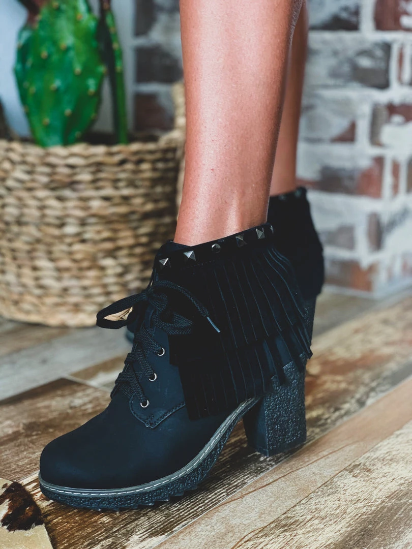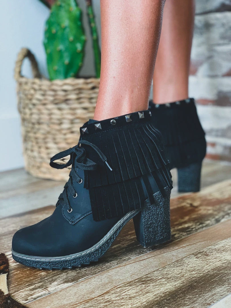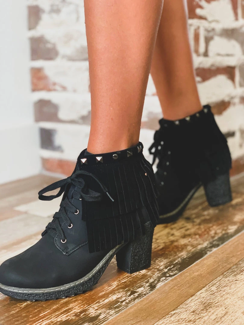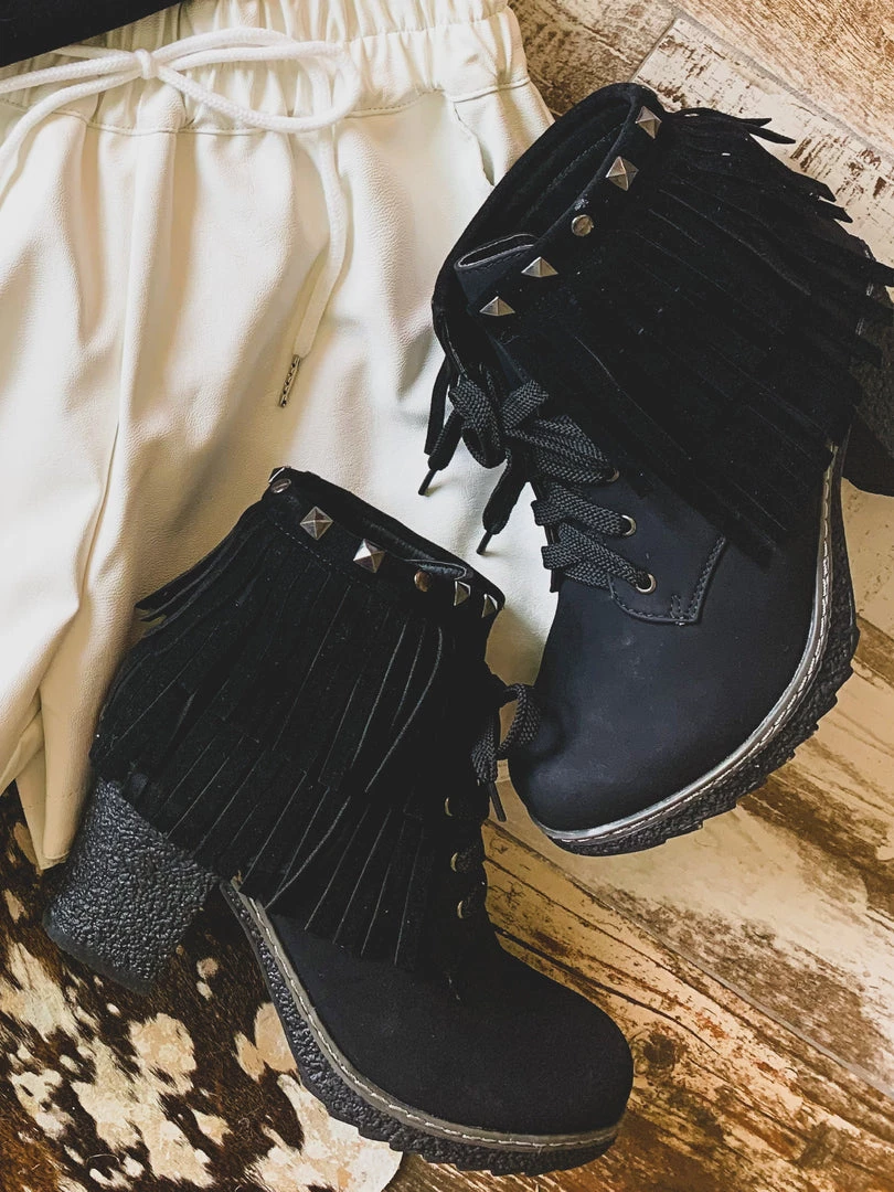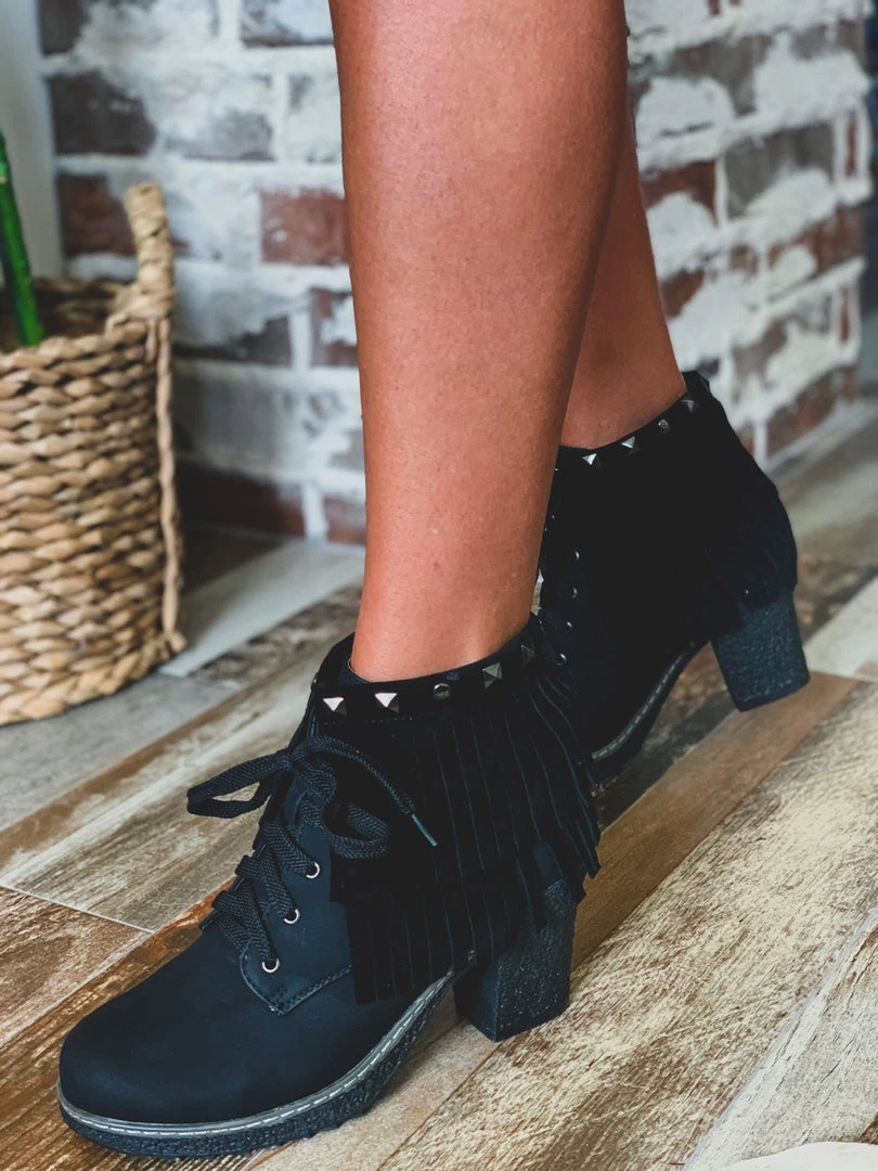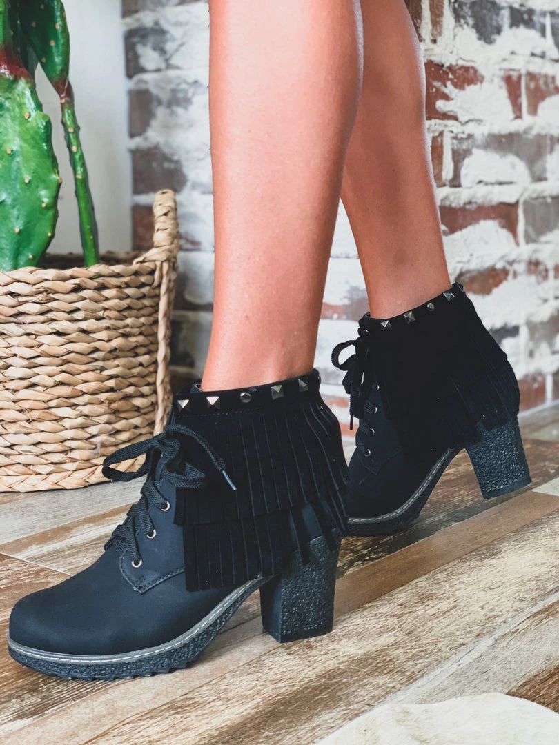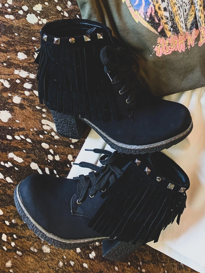 Black lace up bootie is a year round MUST HAVE! Shoe features front lace up closure, a rubber slight platform sole, a rubber heel, two layers of black fringe, and gun metal round and pyramid stud detail around the ankle of the bootie. Perfect transitioning shoe from Summer to Fall and into Winter!