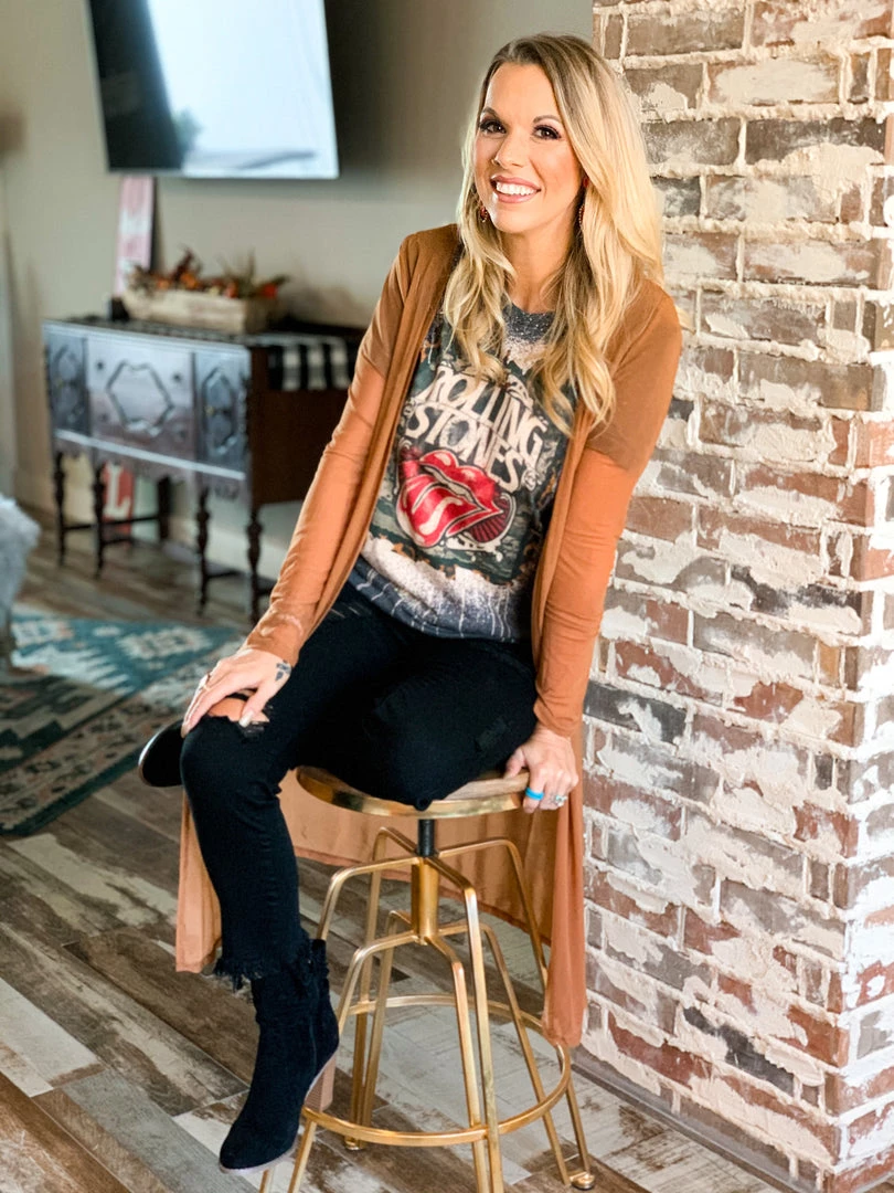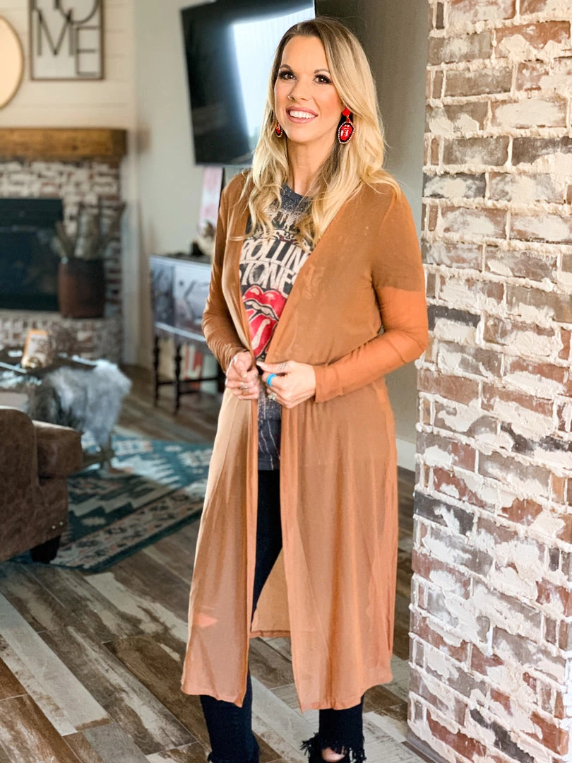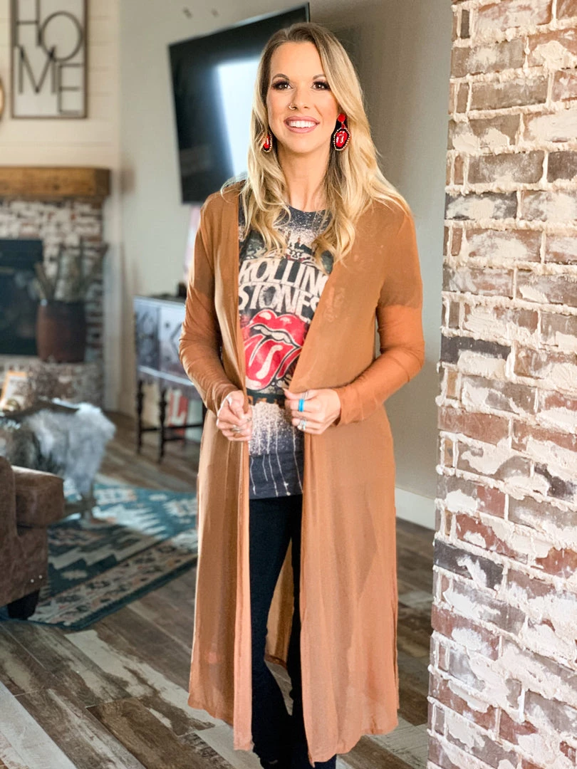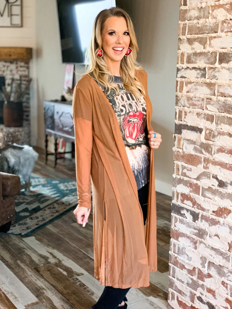 Brown sheer mesh long sleeve light weight duster. Duster has fitted sleeves and each side features a slit. Duster is very light weight and goes perfect over all your outfits. Pair over all your graphic tees and dresses for the Fall.