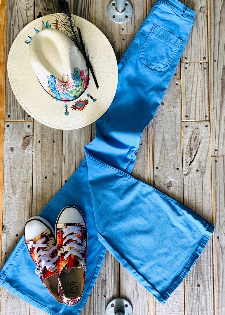 MAGIC BELL BOTTOMS! A staple piece here at Gypsy Waltz! Retro blue denim bell bottoms are the perfect statement piece. Bells feature two back pockets, front button and zipper, and a smooth waistband. Bells are stretchy and very comfortable. Pair with all the cutest graphic tees for the perfect look!