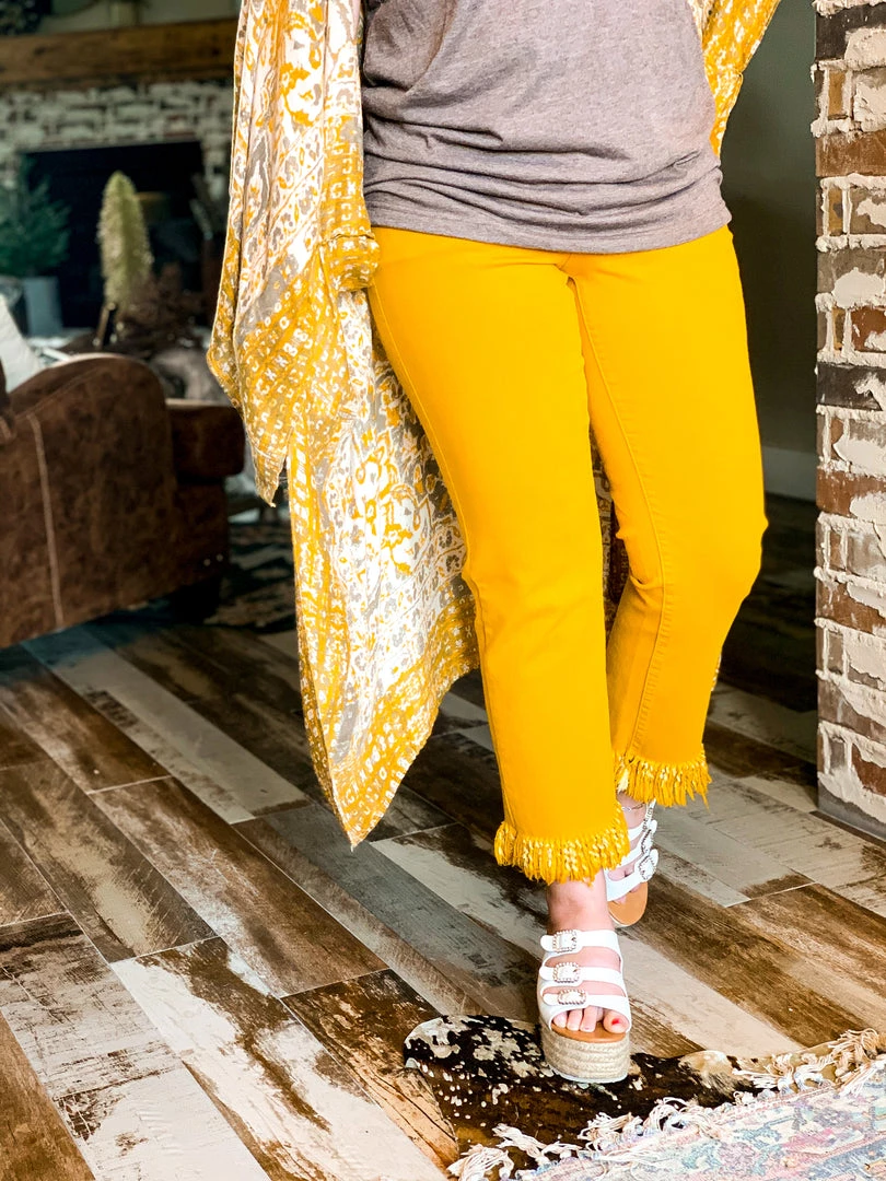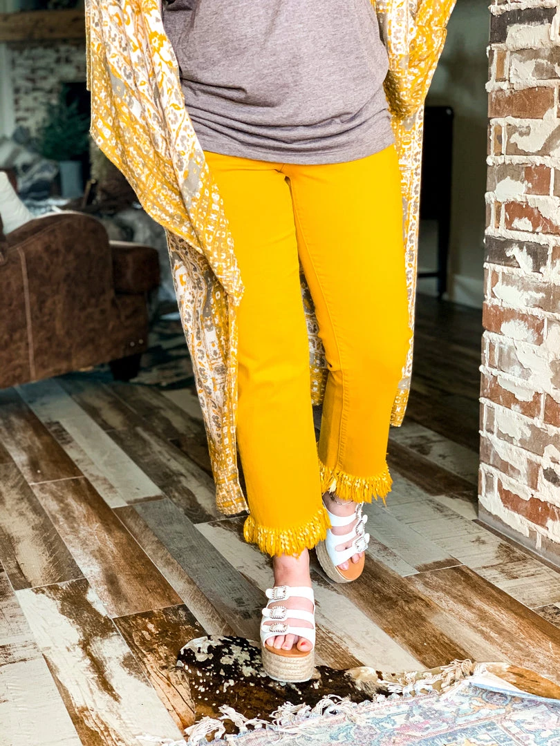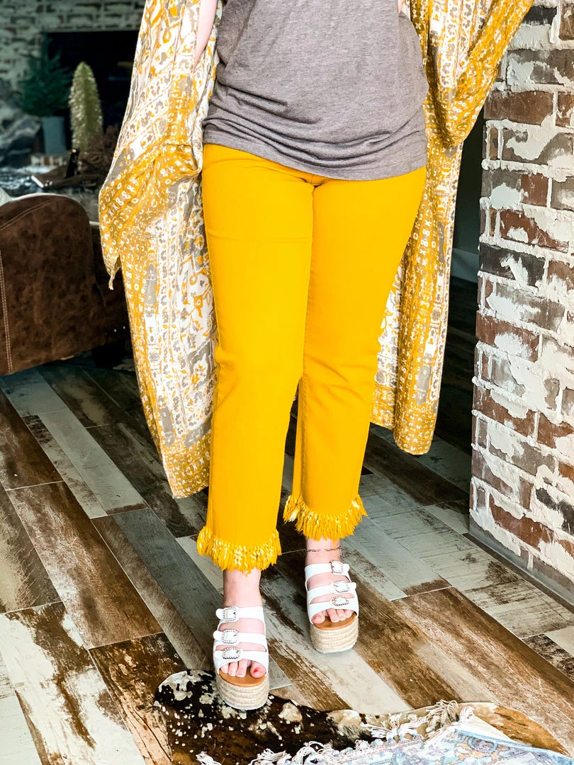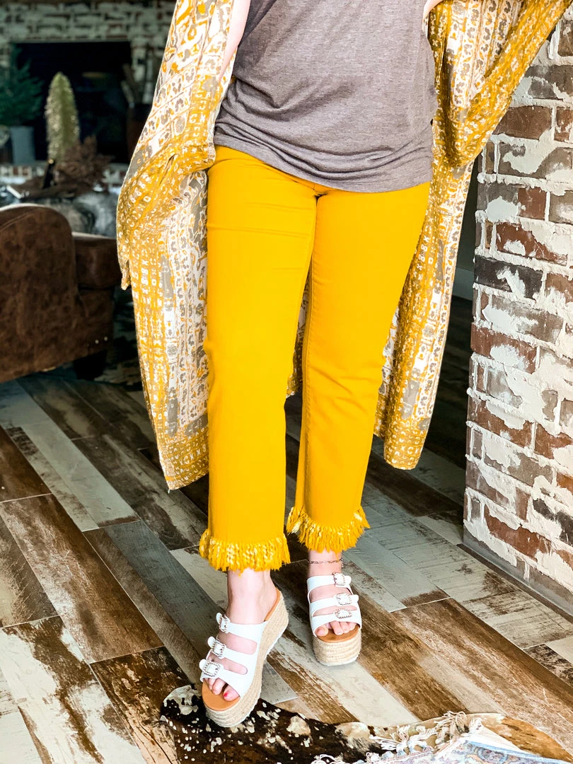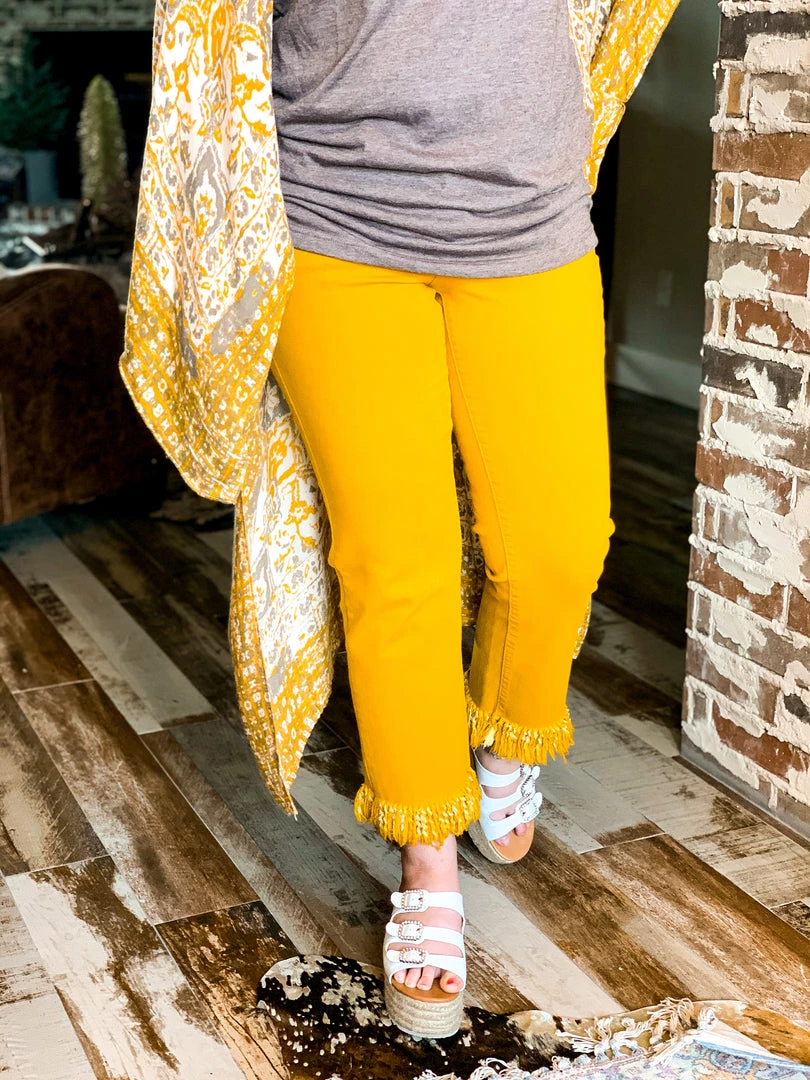 MUSTARD mid-rise denim boyfriend fit pants have so much personality. Pants feature traditional button and zipper closure, two front pockets, and two back pockets. Jeans are a boyfriend fit and are stretchy. Jeans feature a raw frayed hem which just adds the perfect detail. So perfect for all your Fall, Christmas, NFR events.