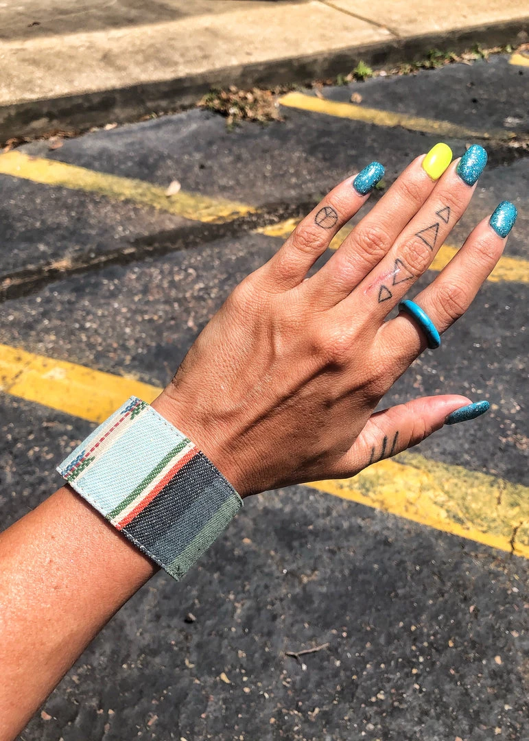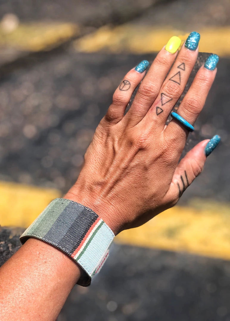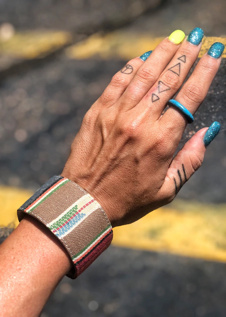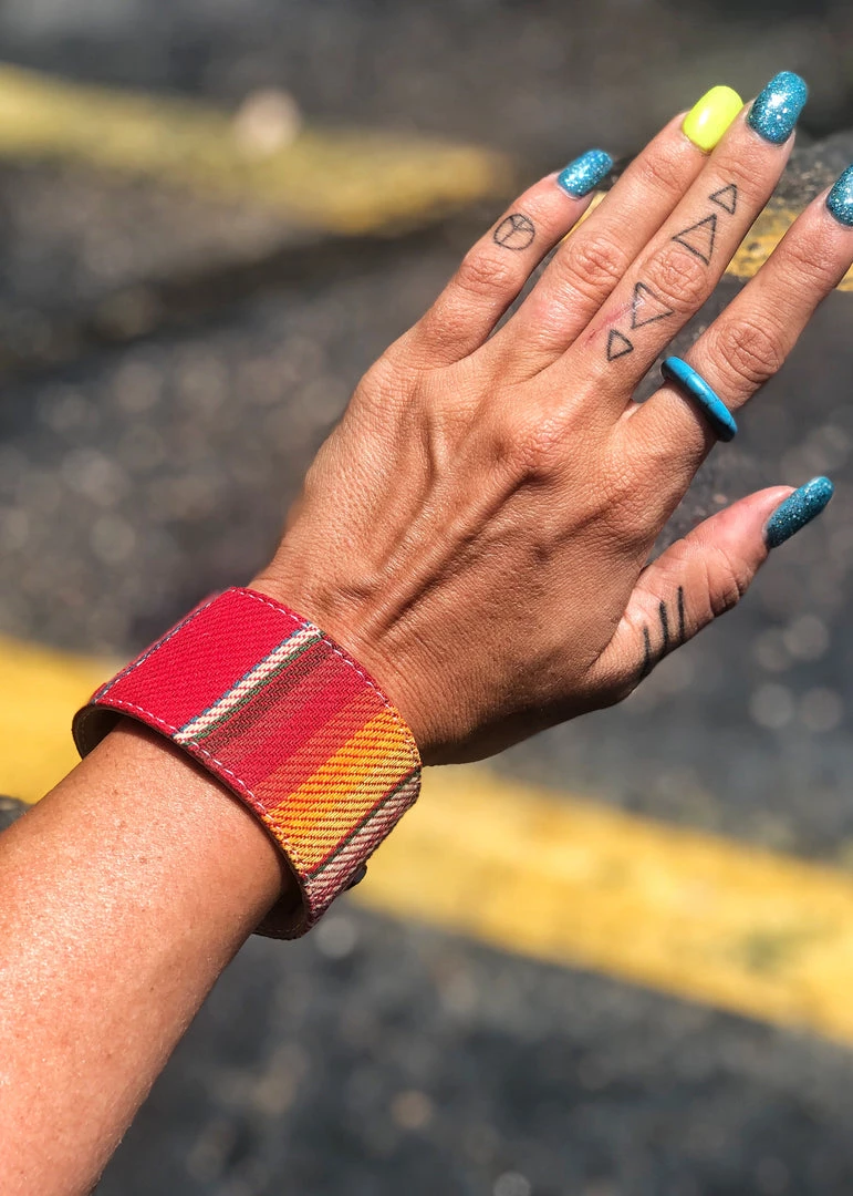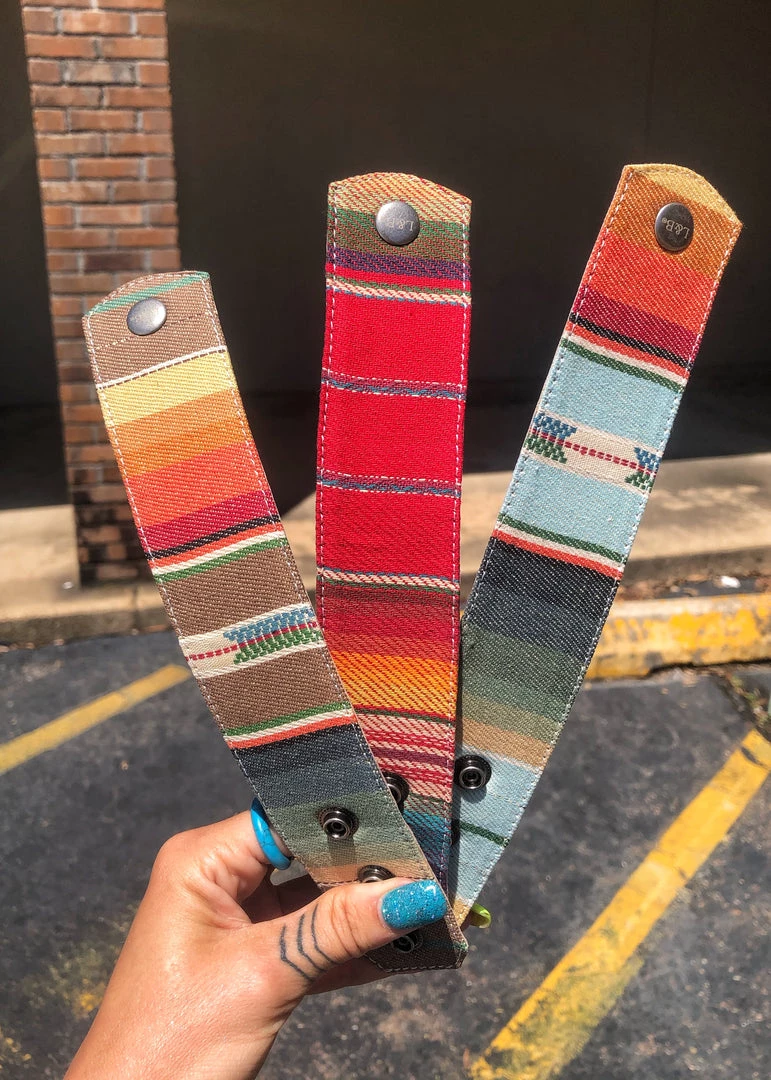 Mint, red, or mocha serape cuff bracelet with double snap closure.
