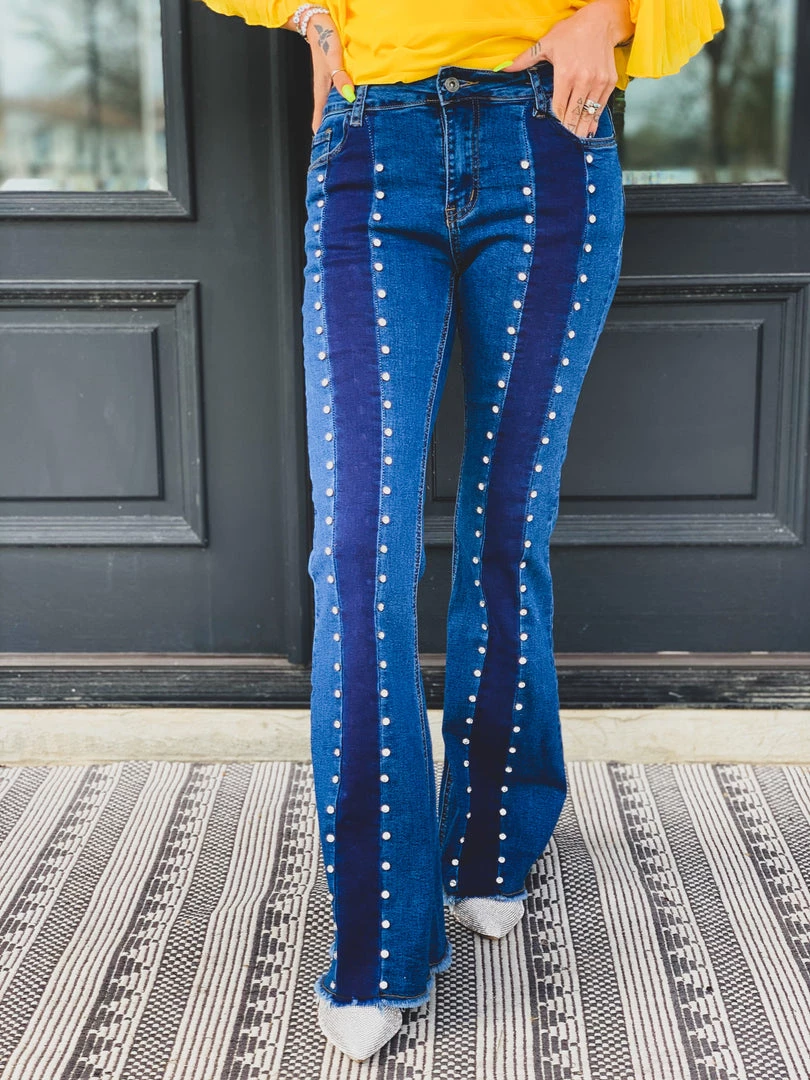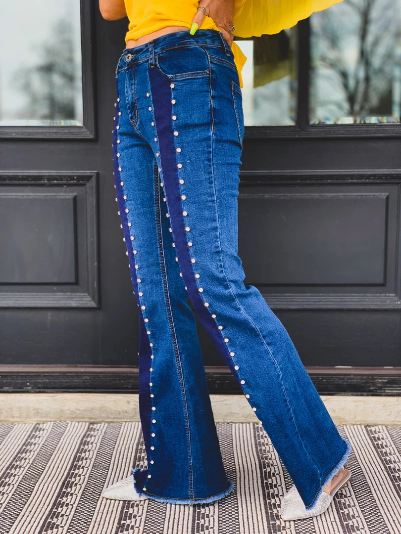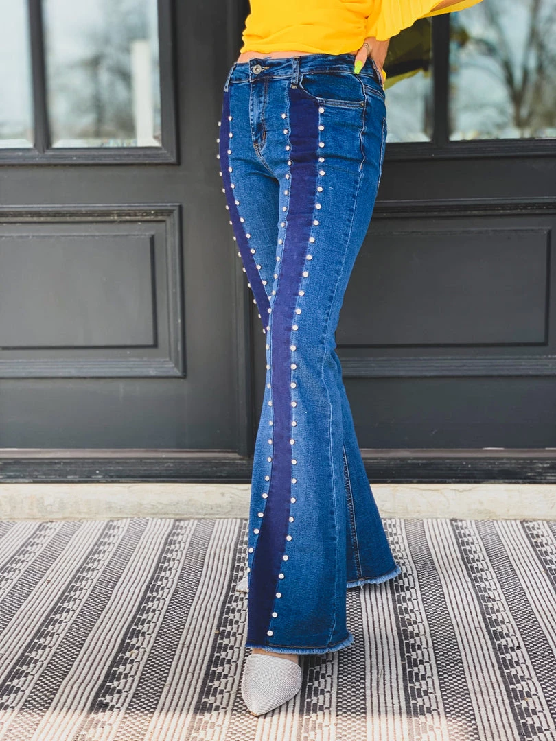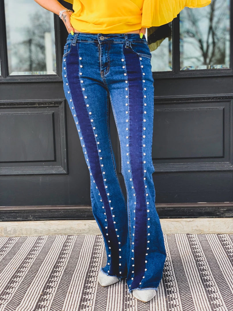 Dark wash denim two toned bell bottoms are perfect for all our glamorous Gypsy Waltz babes. Bells features two vertical rows of rhinestone detail, rhinestones start from front pockets all the way down to the hem, two tone denim, lots of stretch, and a slightly frayed raw cut hem. Pants feature the traditional button and zipper closure. So cute with all your crop tops and bodysuits!