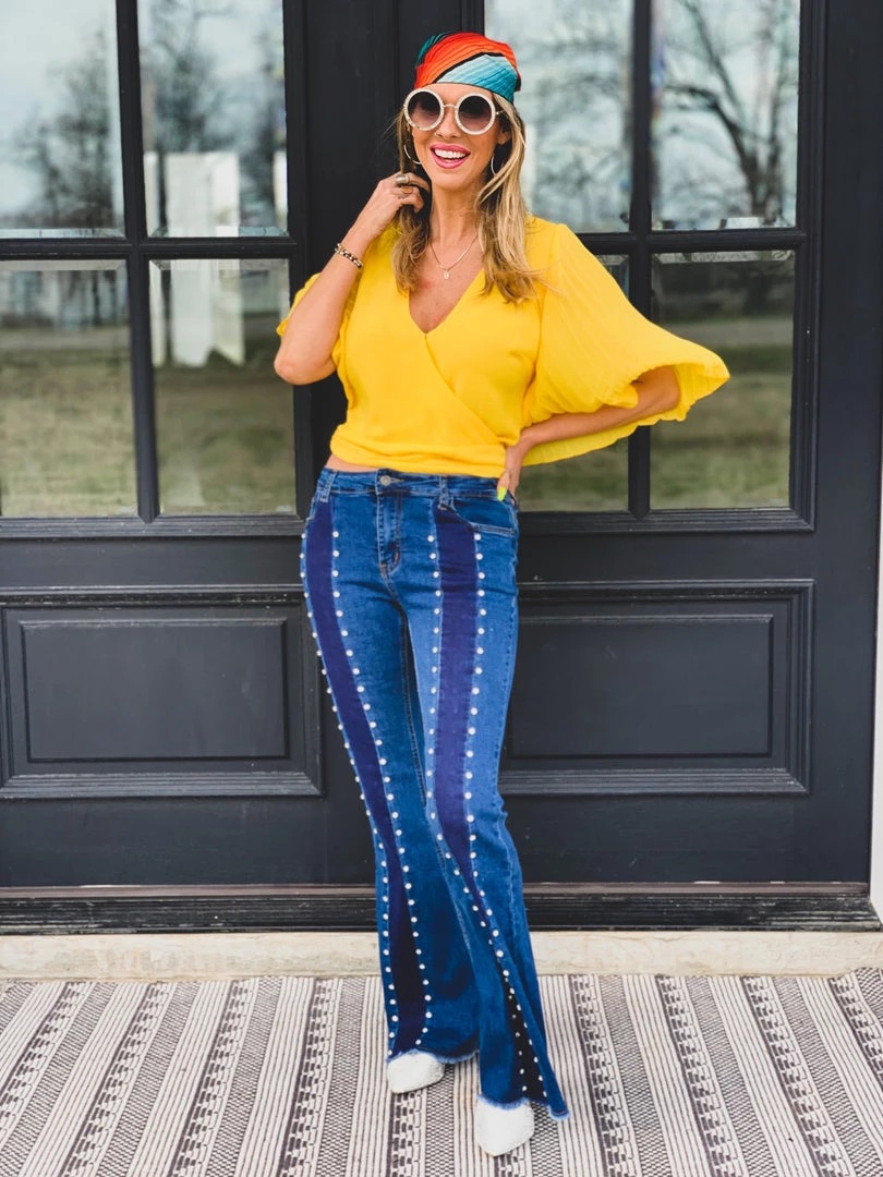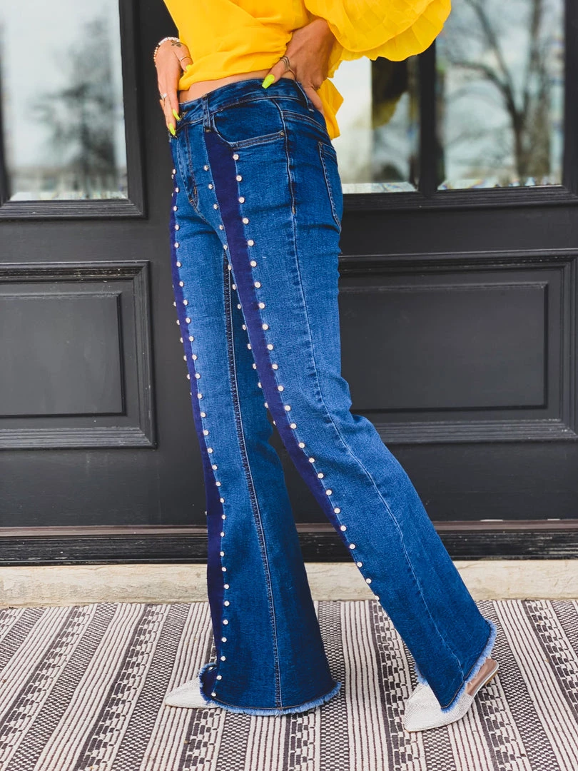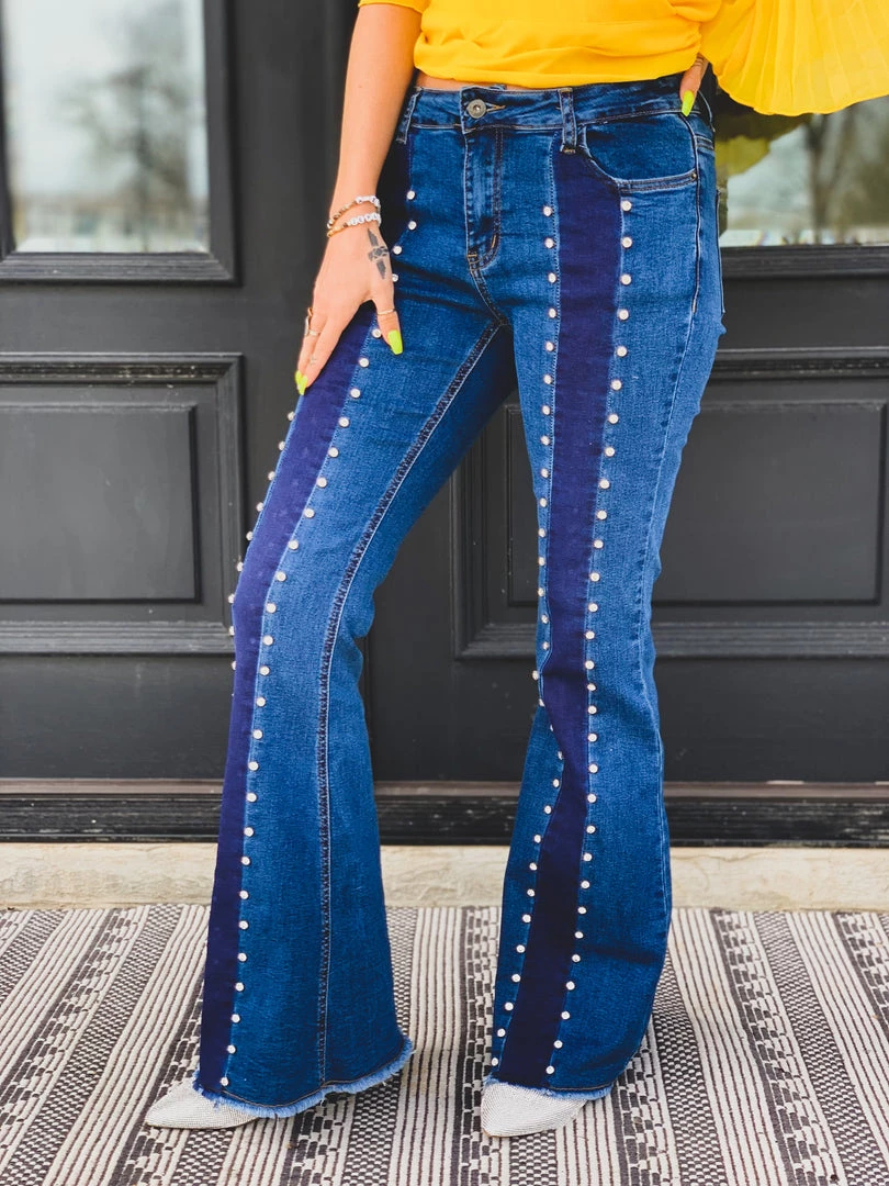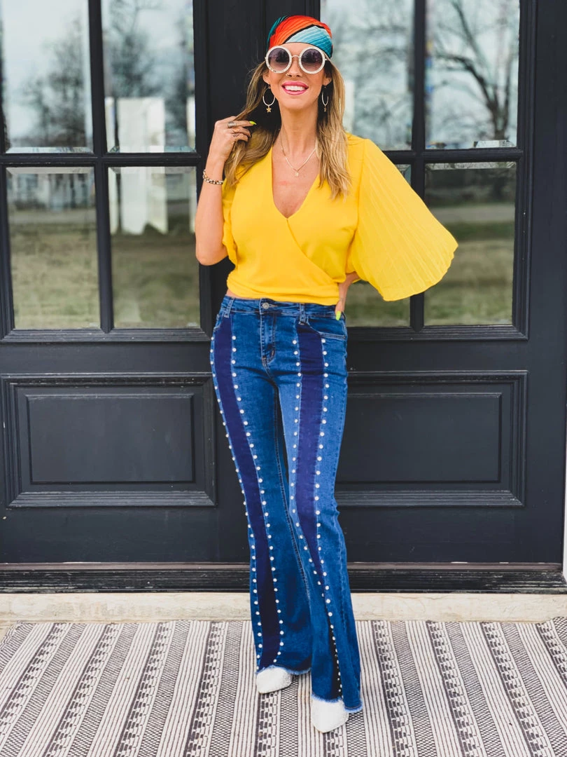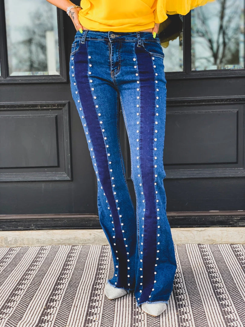 Dark wash denim two toned bell bottoms are perfect for all our glamorous Gypsy Waltz babes. Bells features two vertical rows of rhinestone detail, rhinestones start from front pockets all the way down to the hem, two tone denim, lots of stretch, and a slightly frayed raw cut hem. Pants feature the traditional button and zipper closure. So cute with all your crop tops and bodysuits!