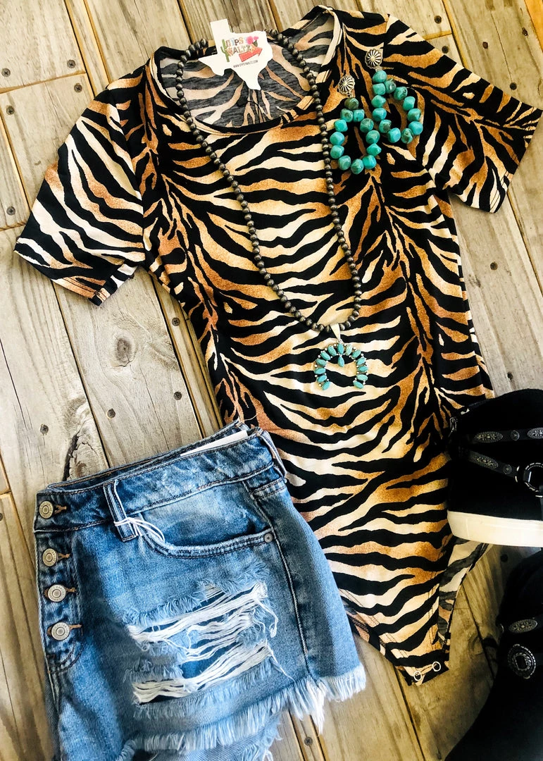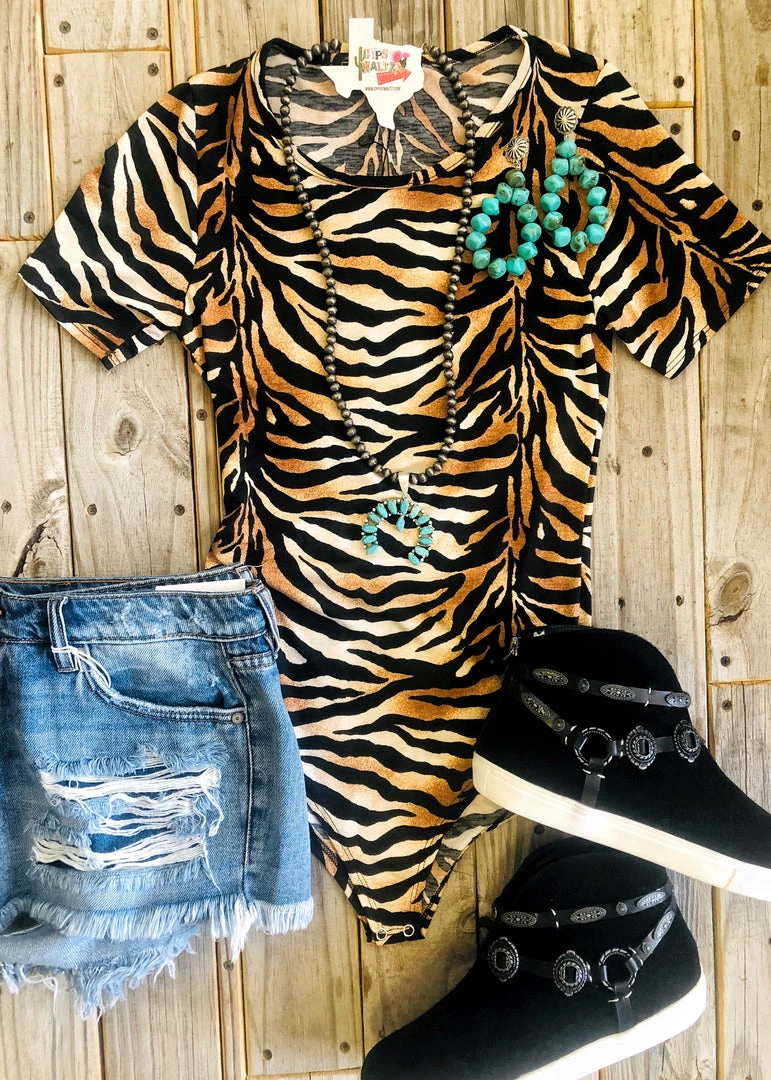 Tiger stripes short sleeve bodysuit is perfect for Summertime fun. Tiger stripe bodysuit features buttery soft material, short sleeves, and two button snap closure. Body suit is stretchy and light weight. SO comfortable! We love it pair with our Orchard Shorts or Blackwell Shorts for the perfect Summer look! Perfect for margs and lunch or a night out with the girls!