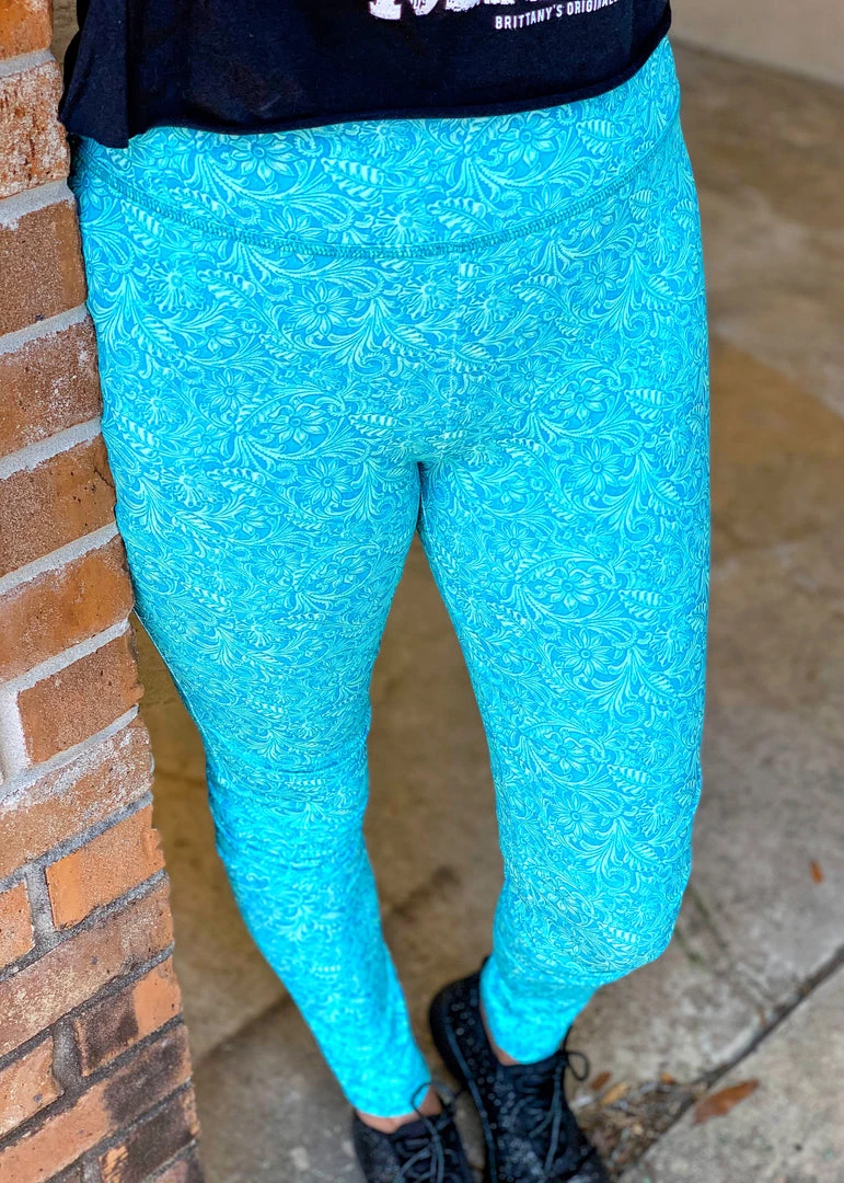 Turquoise tooled print leggings make for the cutest yet comfiest work out or lounge attire. Leggings are all over turquoise tooled print. Super stretchy, super soft, and NOT see through. Perfect to pair with a graphic tee, tank top, or sports bra!