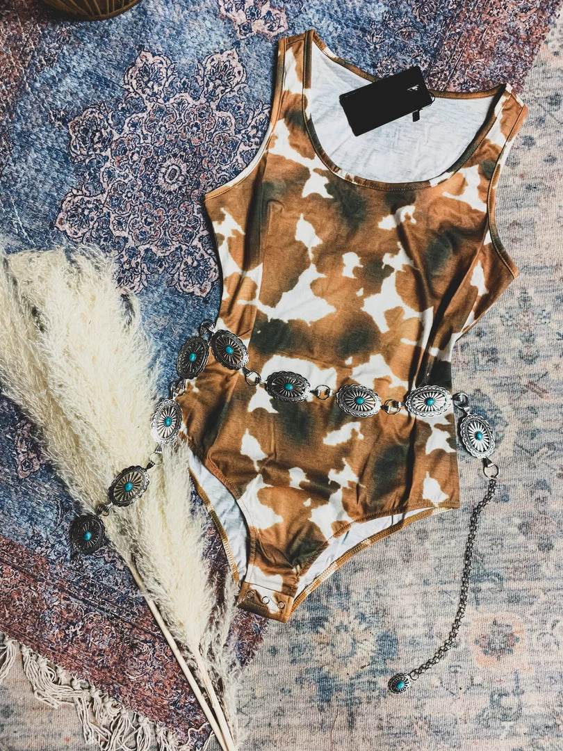 Brown cow print bodysuit is a year round must have! Features a brown cow print pattern, a round neckline, sleeveless style, and traditional bodysuit button closure. Pair with our Daily Deal Leather Tie Waist Shorts.