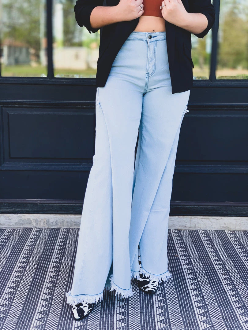 Light wash high waisted retro bell bottoms will easily become your new favorite! Bells feature a light wash, high waist, an open split extreme frayed flare, and a raw frayed hem. Jean features an open split that features fray all the way down to the bottom hem. Bells have the traditional front button and zipper closure, two front pockets, and two back pockets. SO fun SO CUTE!