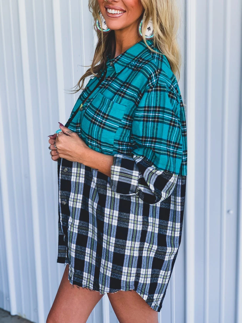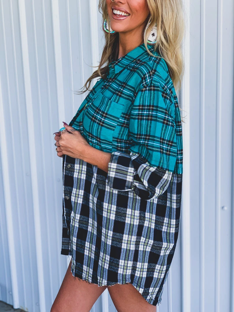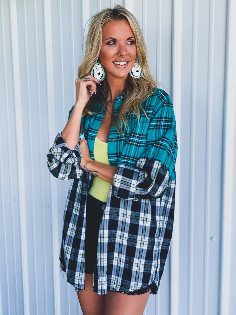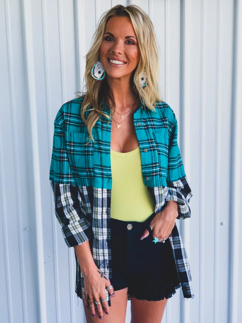 Jade Blue and black plaid two toned shacket making all your Fall outfits come true. Features a two toned style, blue plaid on top and black and white plaid on bottom with bright green details throughout, is collared, two open slip chest pockets, raw hem, button wrist cuffs, and button front closure. Shacket is perfect to pair over our favorite Van Body Suit in Avocado and our Diboll Earrings for the completed look.