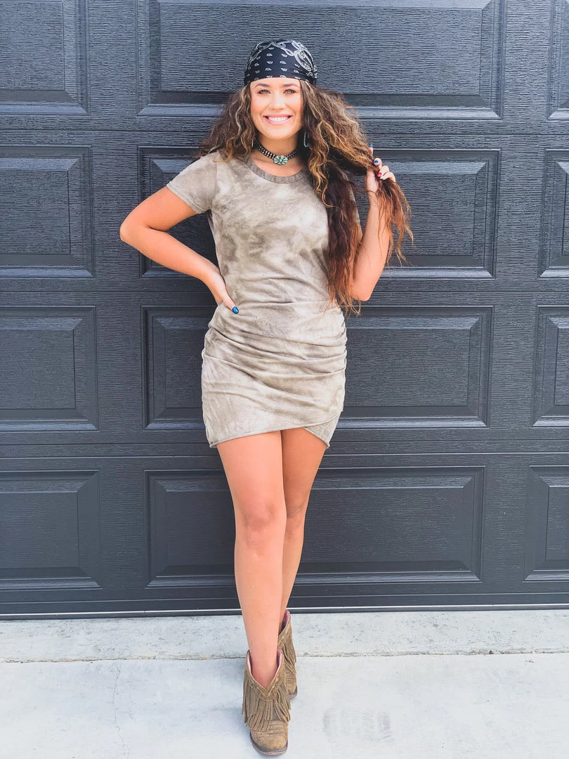 Mocha brown tie dye print dress to keep up with the trends featuring soft lightweight breezy material, crew neckline, short sleeves, shirred front seam and a relaxed silhouette that falls into a mid-high length hemline. Dress is a wrap style with ruching detail on the side.Â