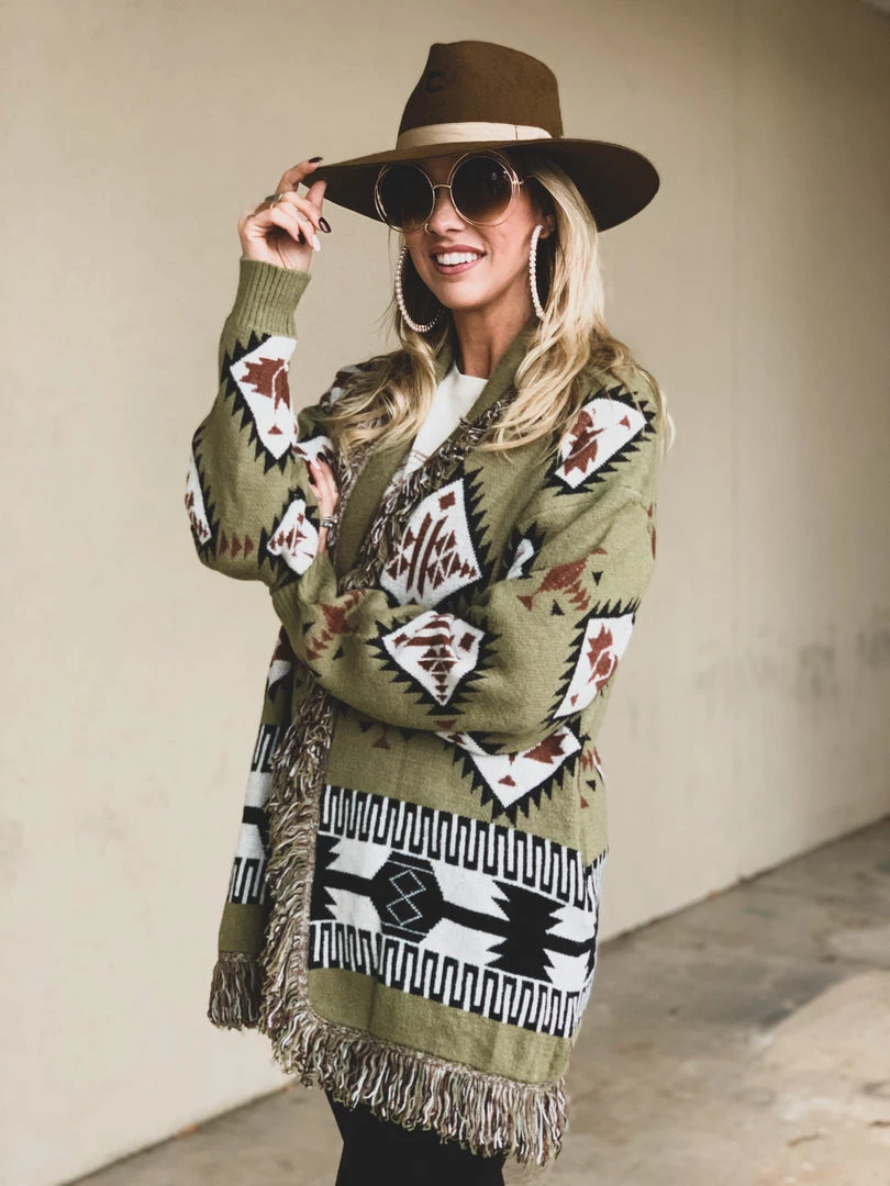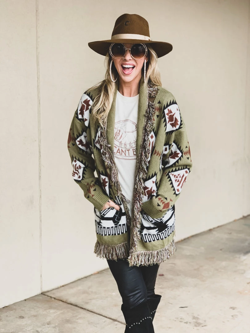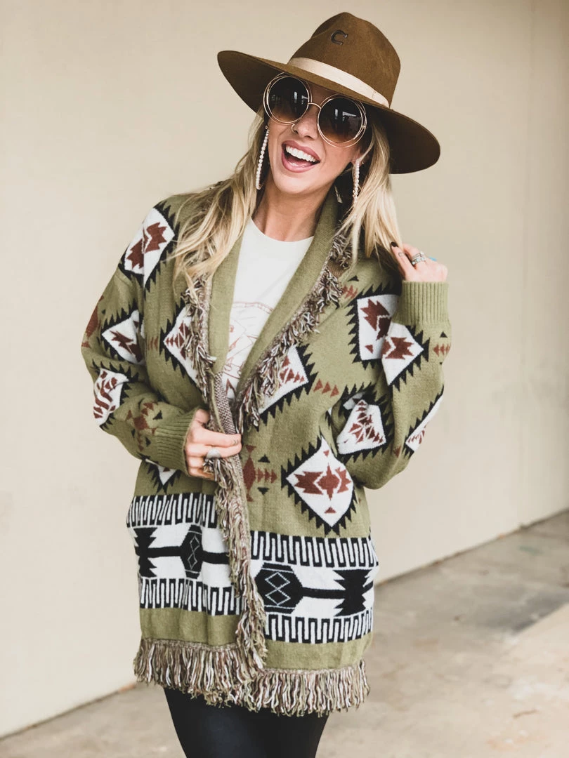 Olive aztec print cardigan features super buttery soft fabric, long sleeves, tassels along the bottom hemline, and a beautiful aztec print design. Kimono is thick, warm, and SO comfy! Pair over all your graphic tees, bodysuits, and dresses!