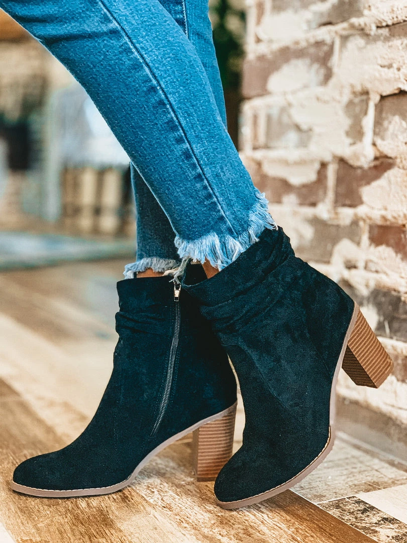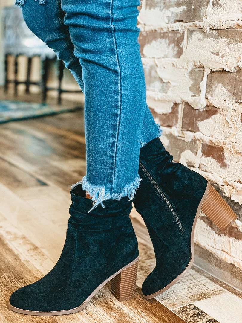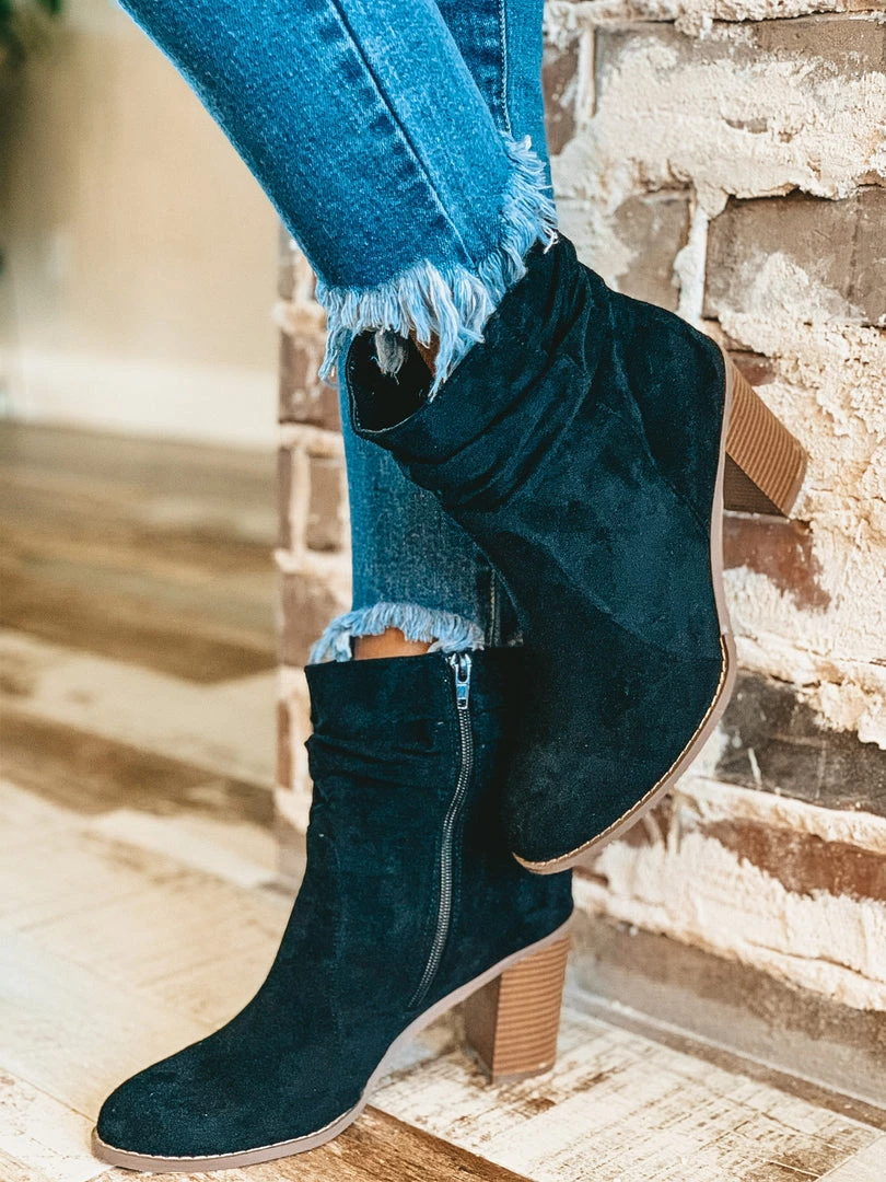The best GO TO black booties! Gorgeous black suede slouchy pull on ankle booties. Booties are all black suede, rounded toe, slouchy style, and comfy stacked heel. Get ready for ALL the BEST compliments. The outfit choices are endless!