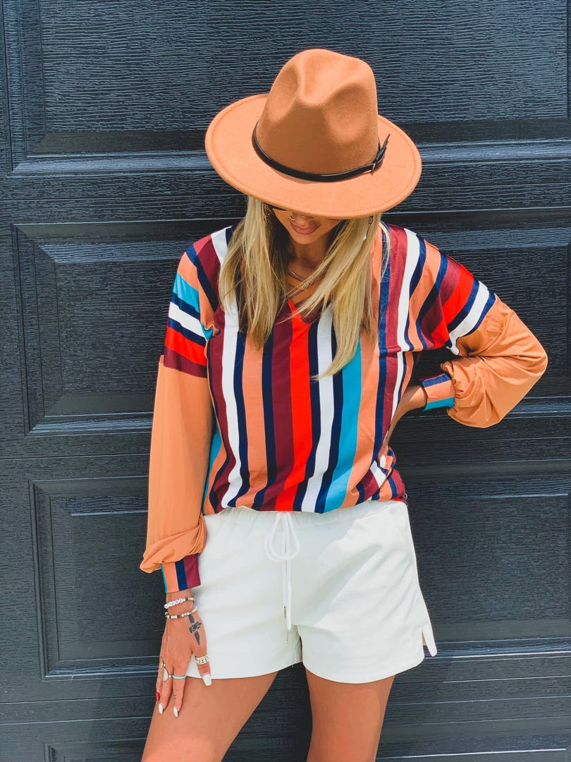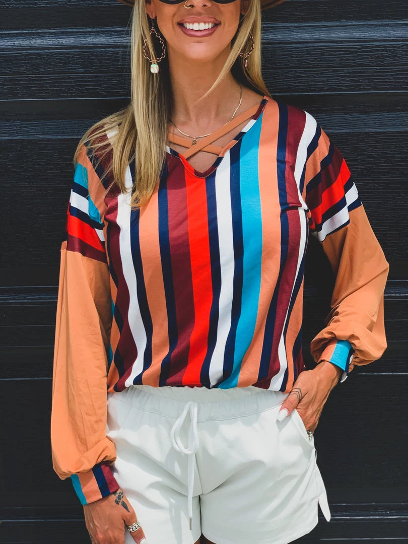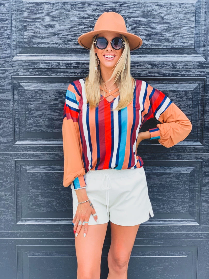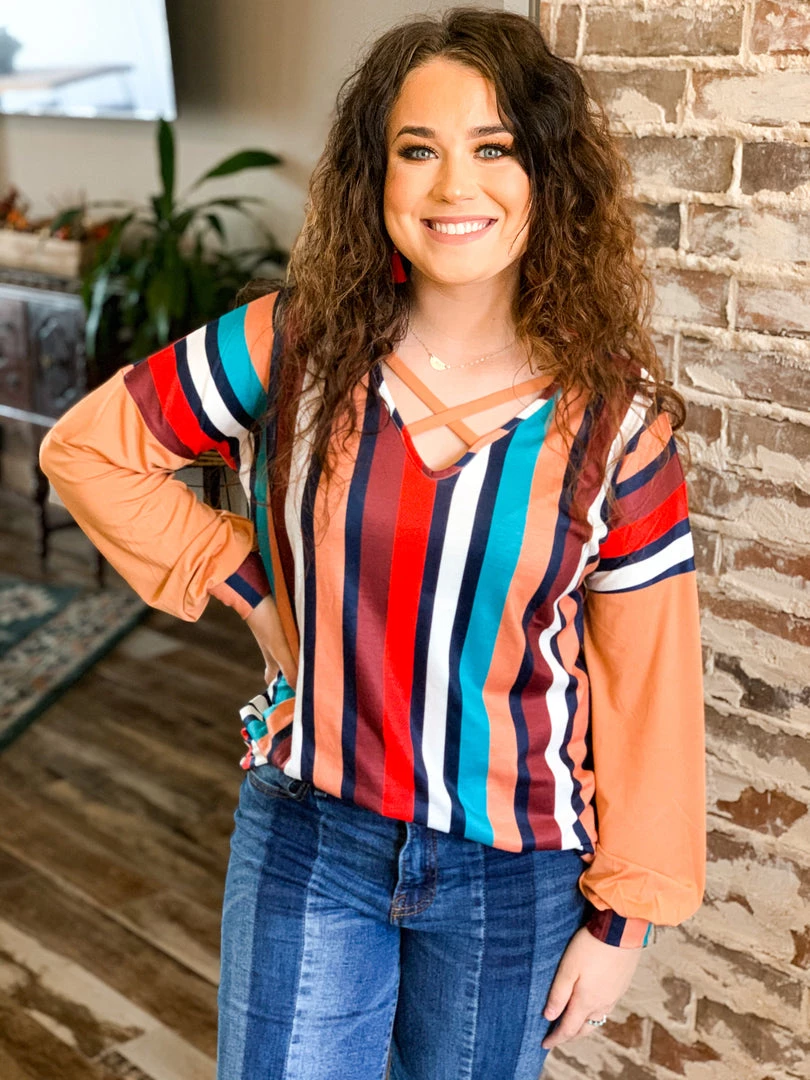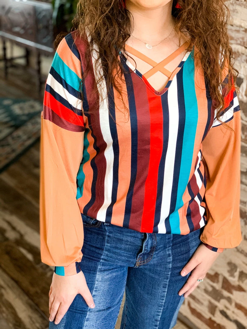 Tan multi color vertical stripe long sleeve top features tan long sleeves, multi color vertical stripes, and criss cross chest front detail. Top has bubble sleeves, striped multi color elastic wrist cuffs, and criss cross chest detail. Top is super soft, flattering, and classy. Looks perfect for FALL!