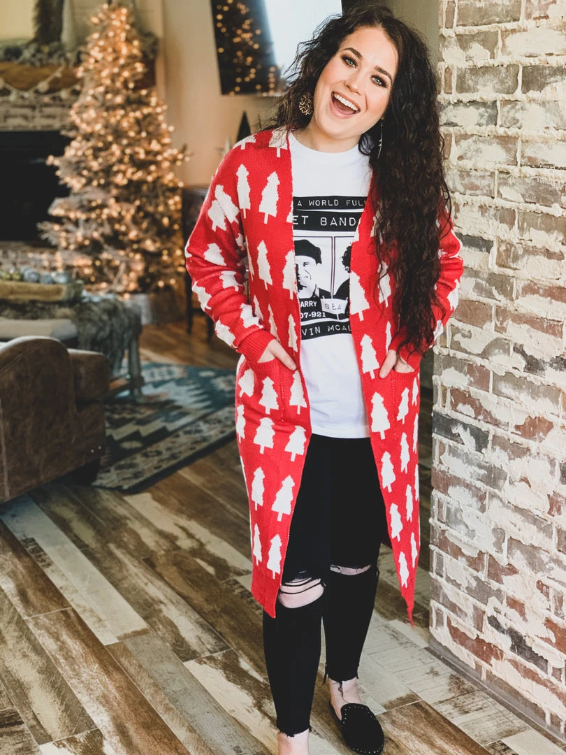 Red knit Christmas tree cardigan is cozy, comfy, and oh so cute! Cardigan is red knit with white Christmas tree print. Cardi features not only the merriest Christmas design but, long sleeves, a great length, and two front open slip pockets. So cozy! Pair with our Illinois Bend Tee for the merriest Christmas outfit!