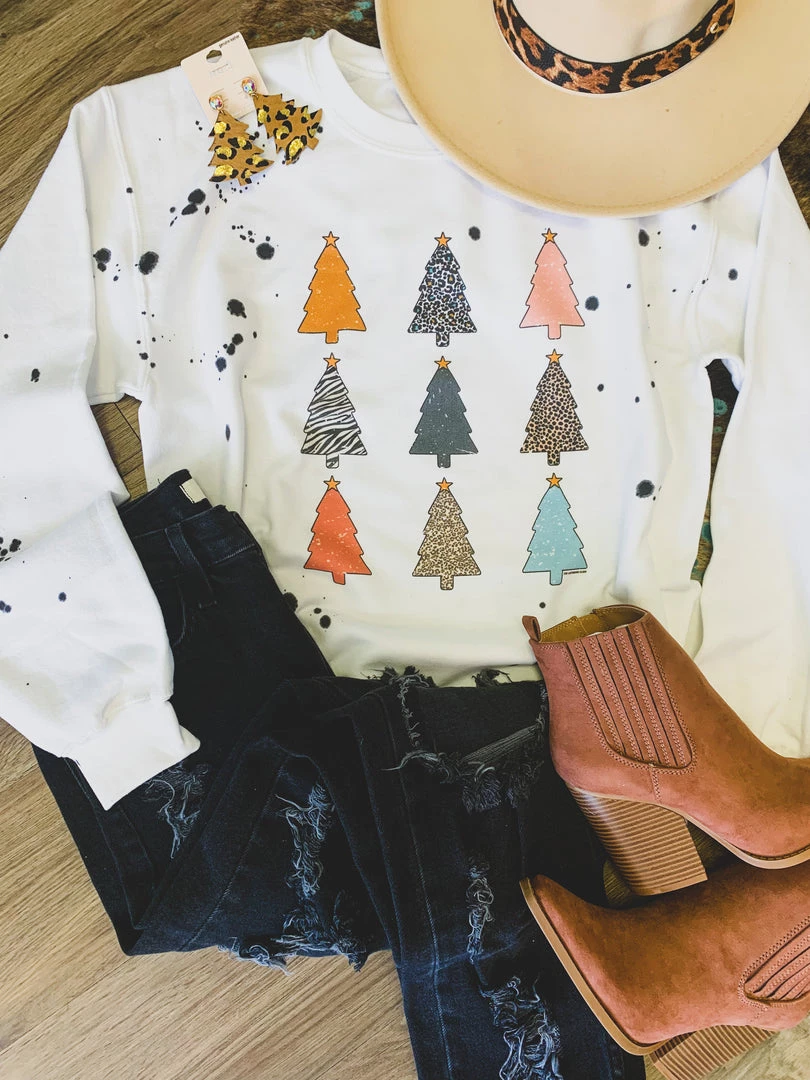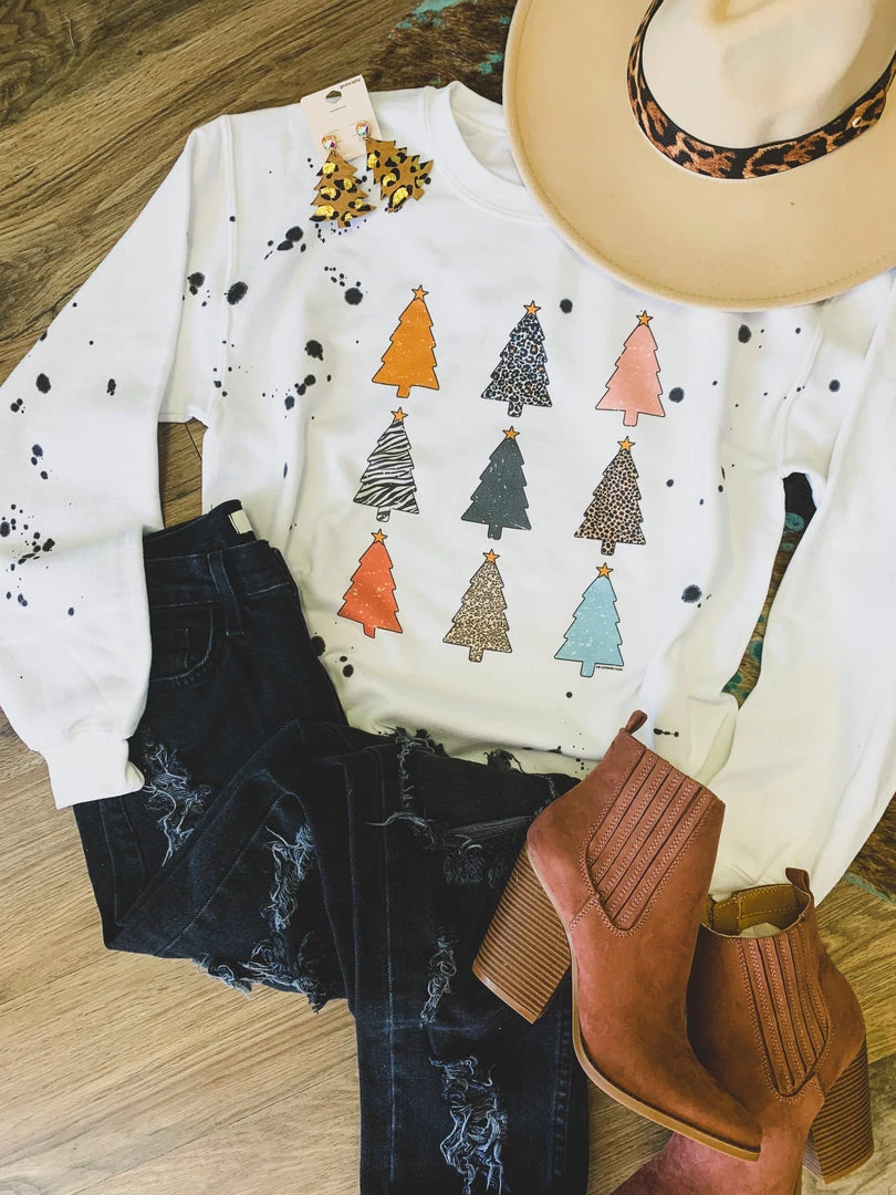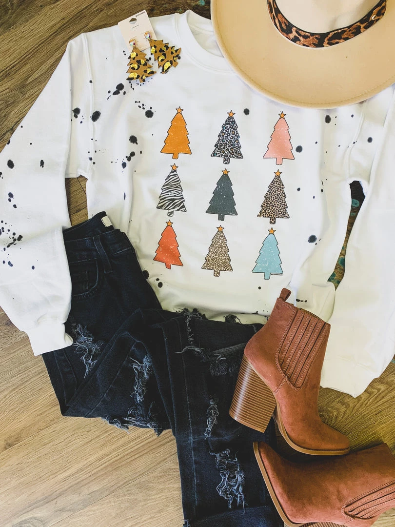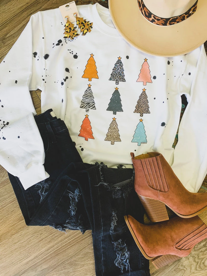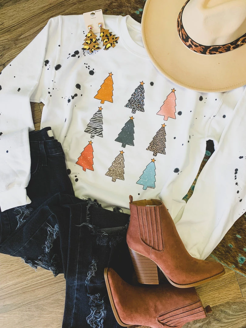 Christmas tree retro graphic on a white sweatshirt with black paint splatter is a new Gypsy Waltz FAV. Features three rows of the cutest vintage Christmas trees topped with gold stars – with colors of light mauve pink, mustard, charcoal, blue, zebra print, and three different leopard prints. Comfy classic long sleeve white sweatshirt in a traditional fit. Inside is SO soft, like BUTTER. Pair with our Garland Hat, Novice Earrings, Blanco Pants, and our Brundage Booties for the completed look!