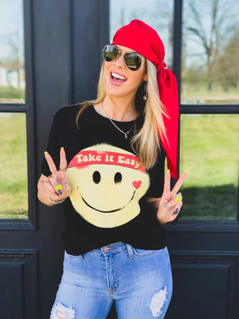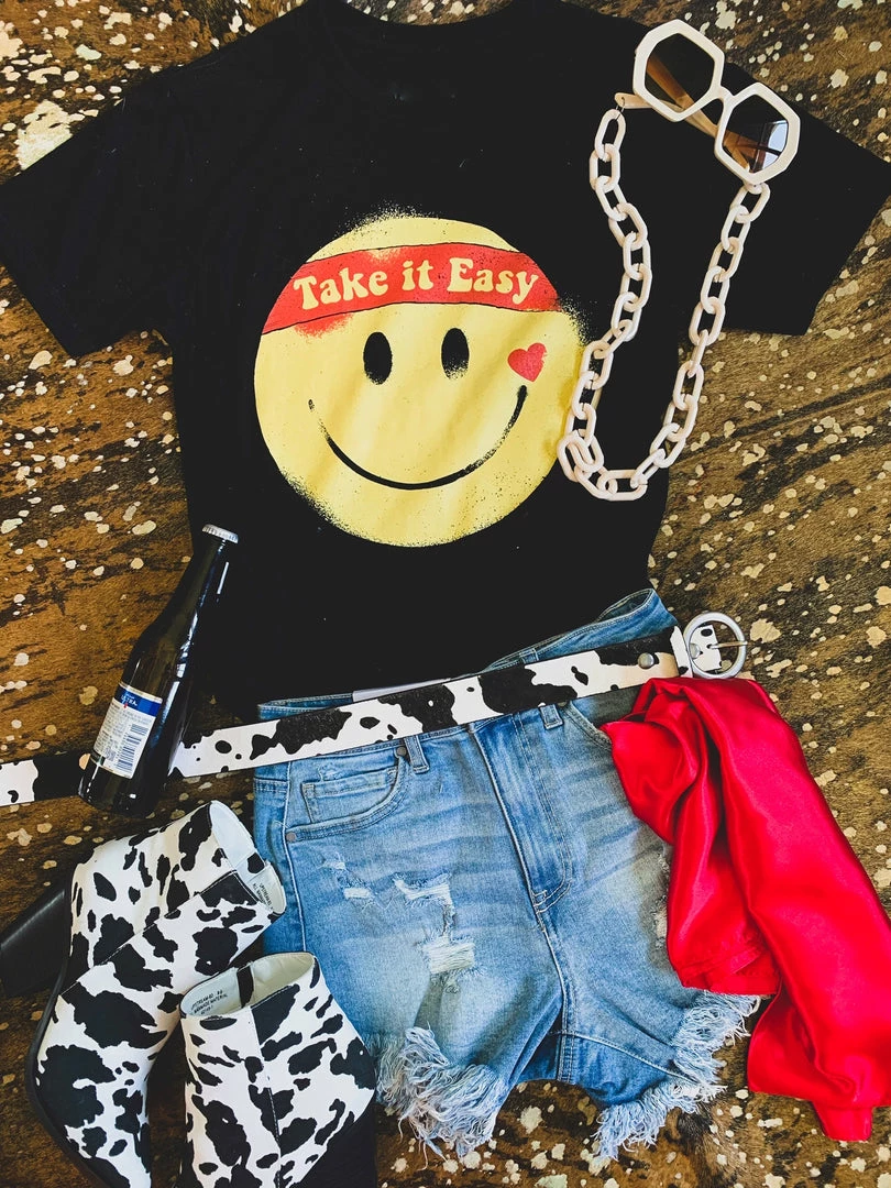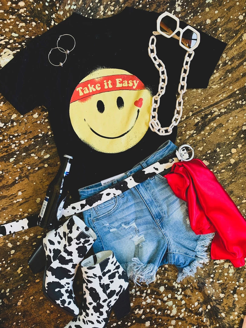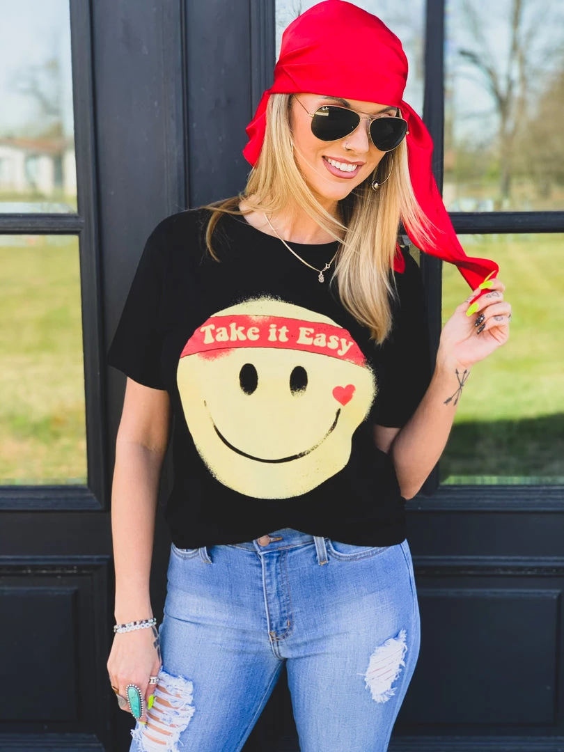 Black retro graphic tee features a big yellow smile face with the quote, “Take It Easy.” This tee is taking us all the way back to the 90s! Graphic is a yellow smile face, with a heart, and a red headband with the quotes, “take it easy.” Such a fun retro tee to pair with all your favorite denim!