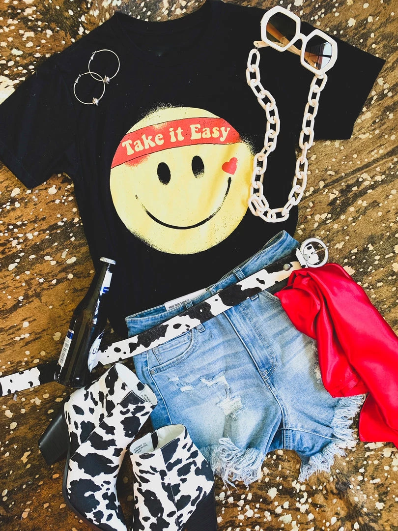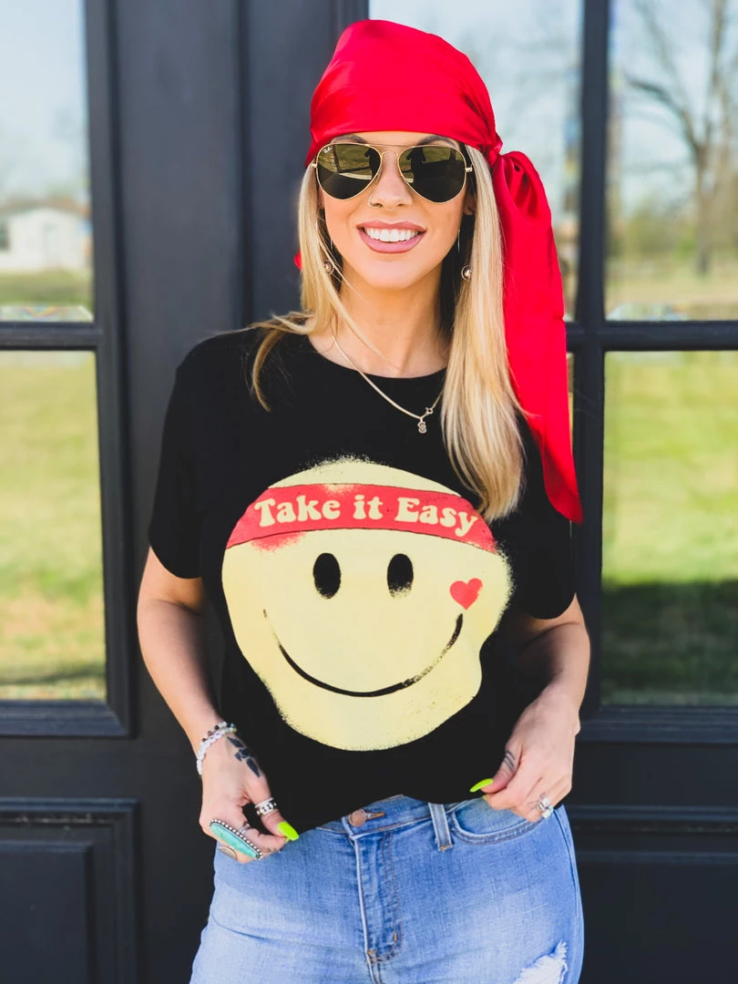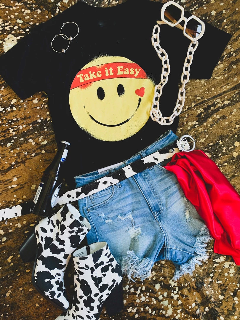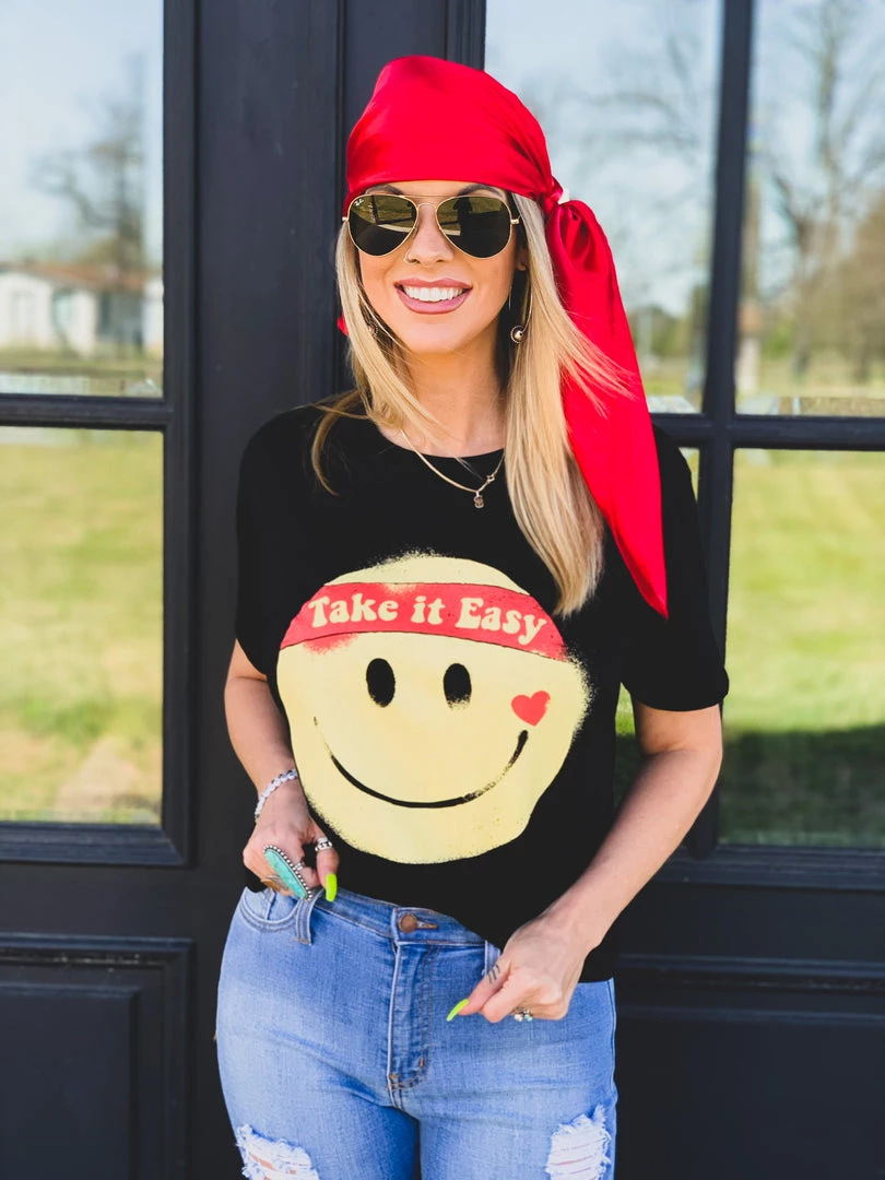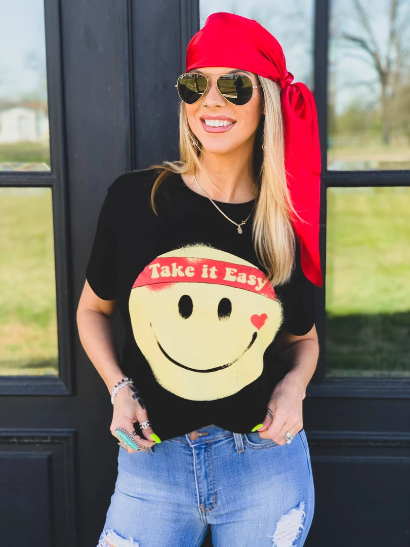 Black retro graphic tee features a big yellow smile face with the quote, “Take It Easy.” This tee is taking us all the way back to the 90s! Graphic is a yellow smile face, with a heart, and a red headband with the quotes, “take it easy.” Such a fun retro tee to pair with all your favorite denim!