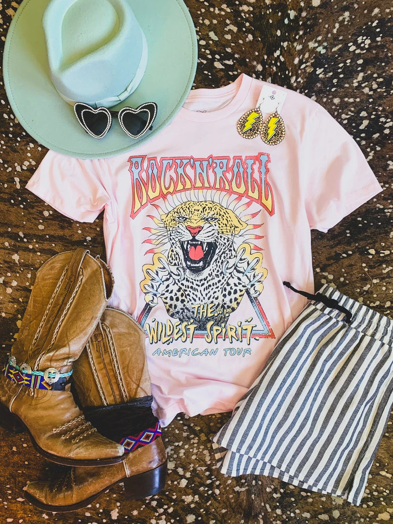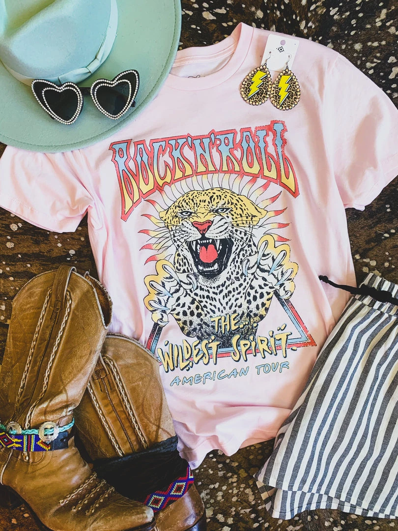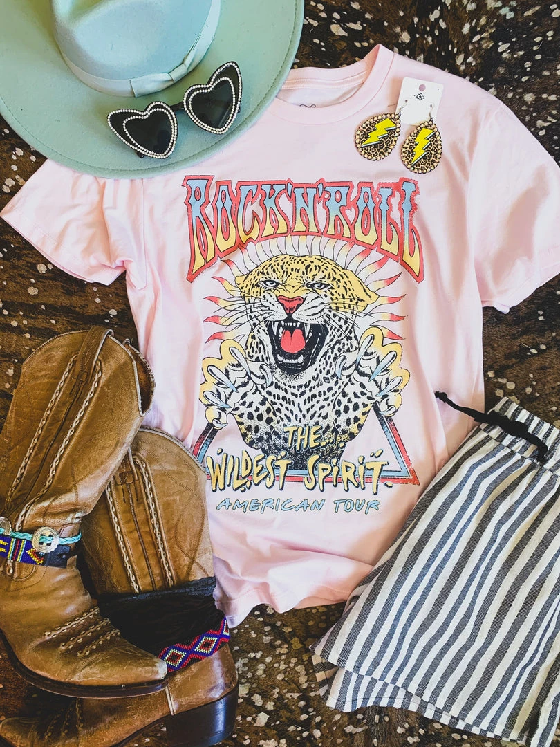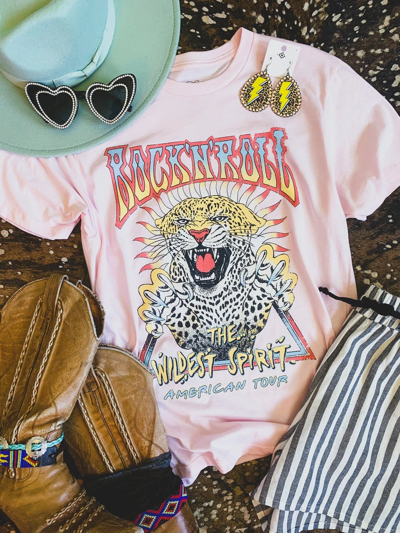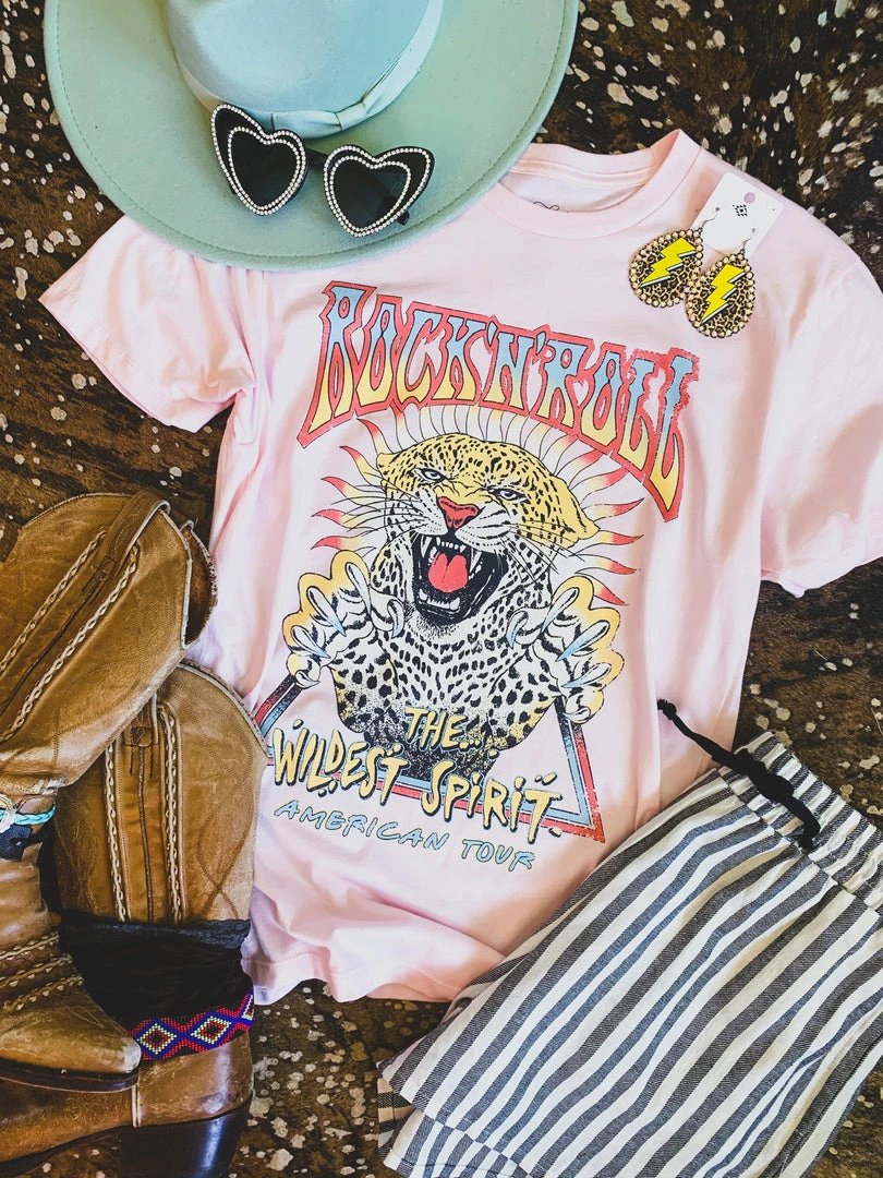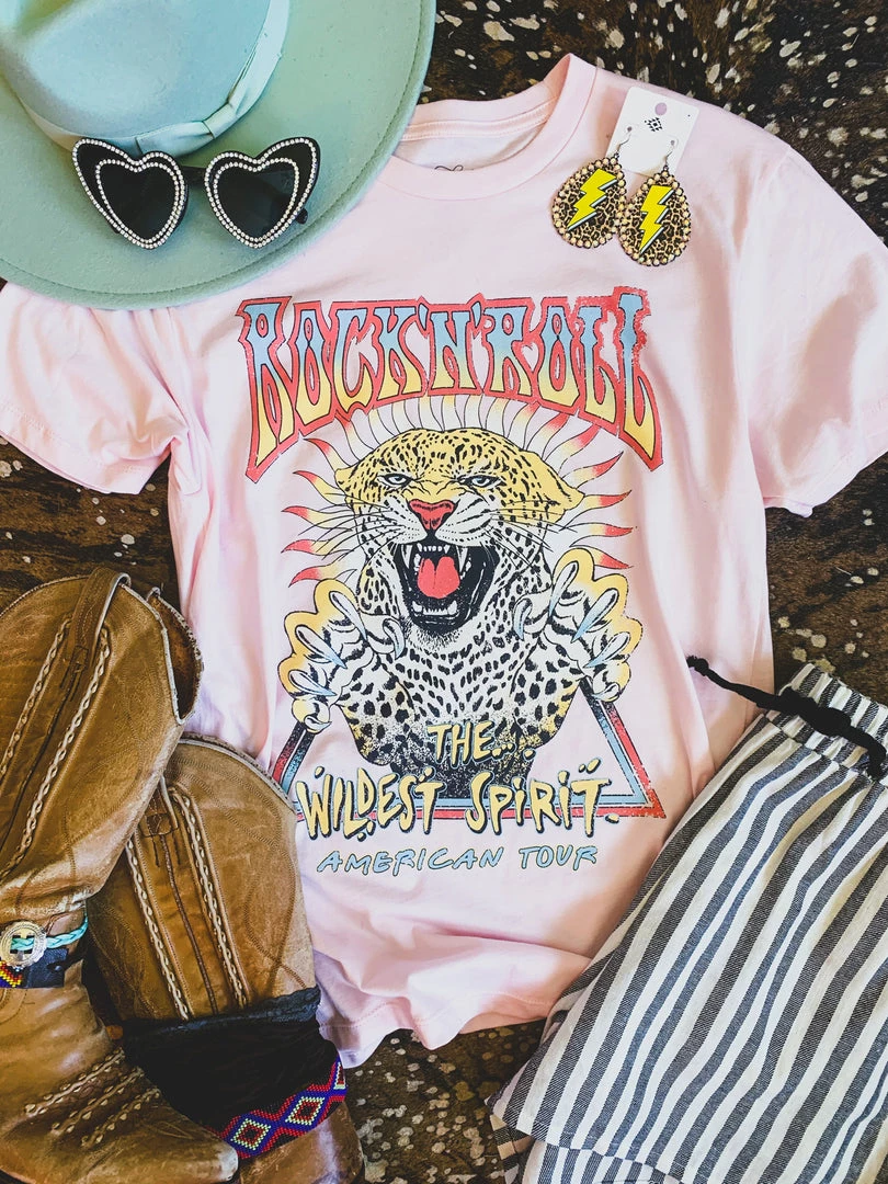 Pink rock n roll graphic tee is a must. Tee features the colorful quotes, “Rock ‘n’ Roll” “The wildest spirit” “American tour” and the color graphic of a wild leopard. Graphic is colorful and distressed! Such a cute tee to pair with your favorite denim and biker shorts.