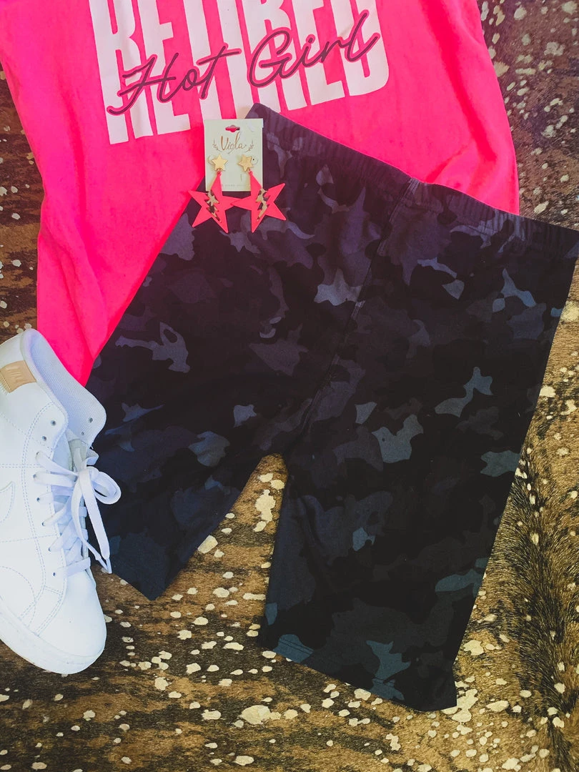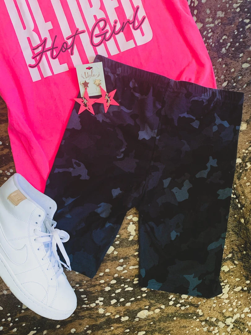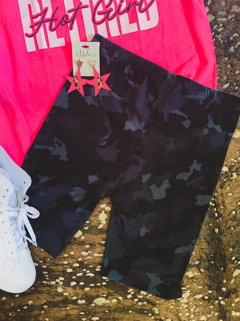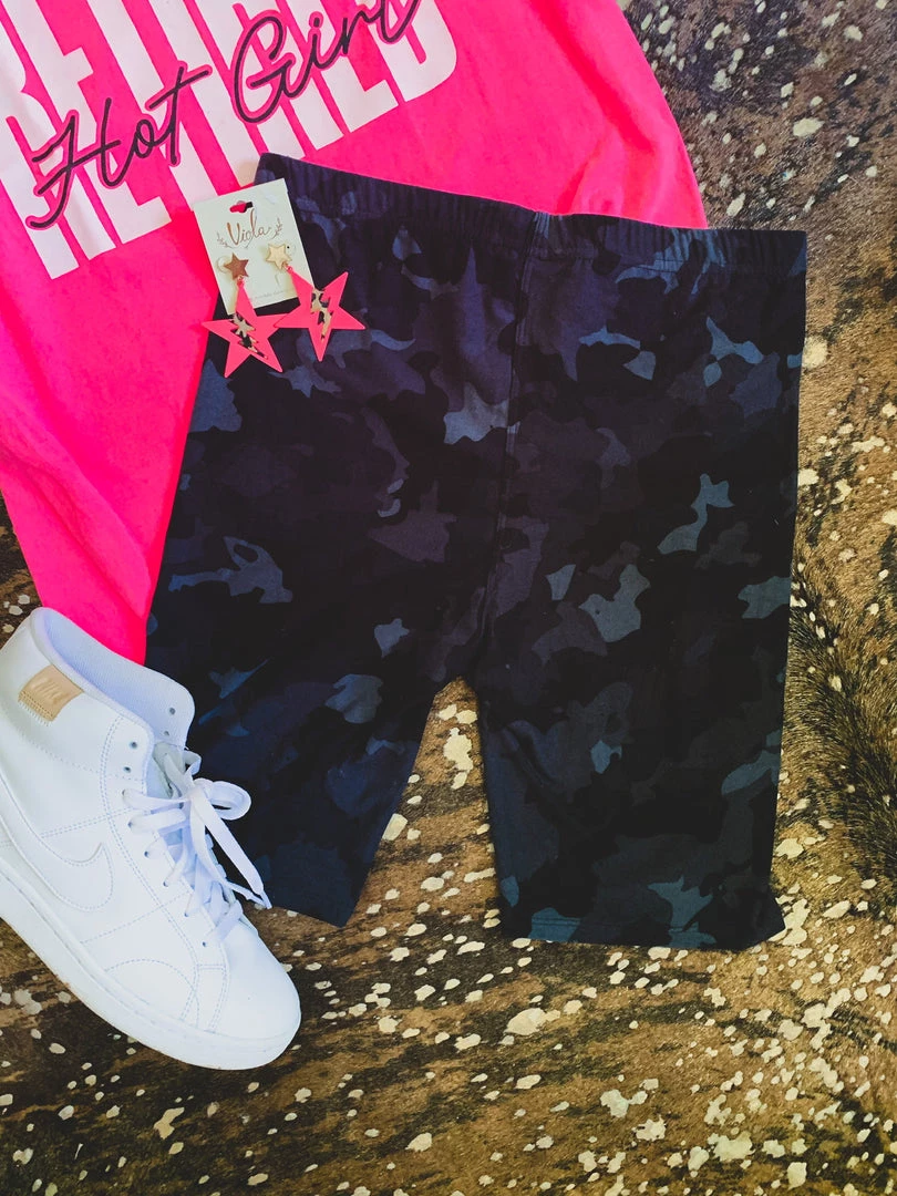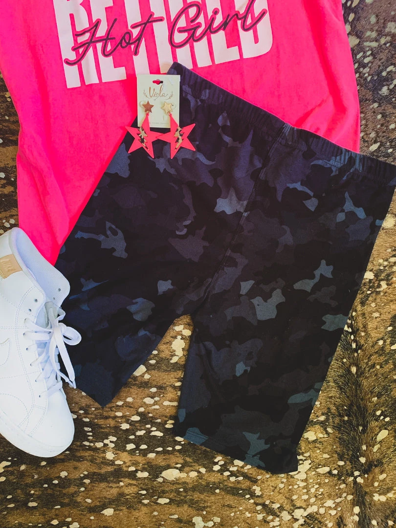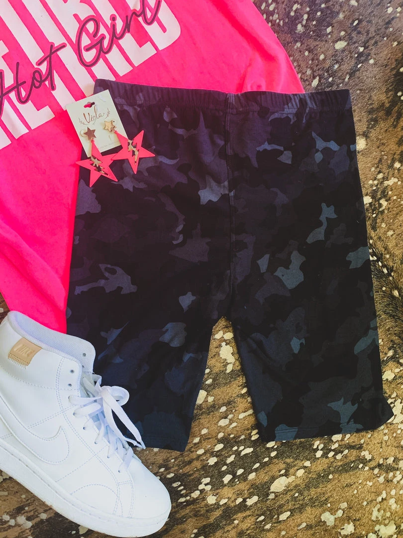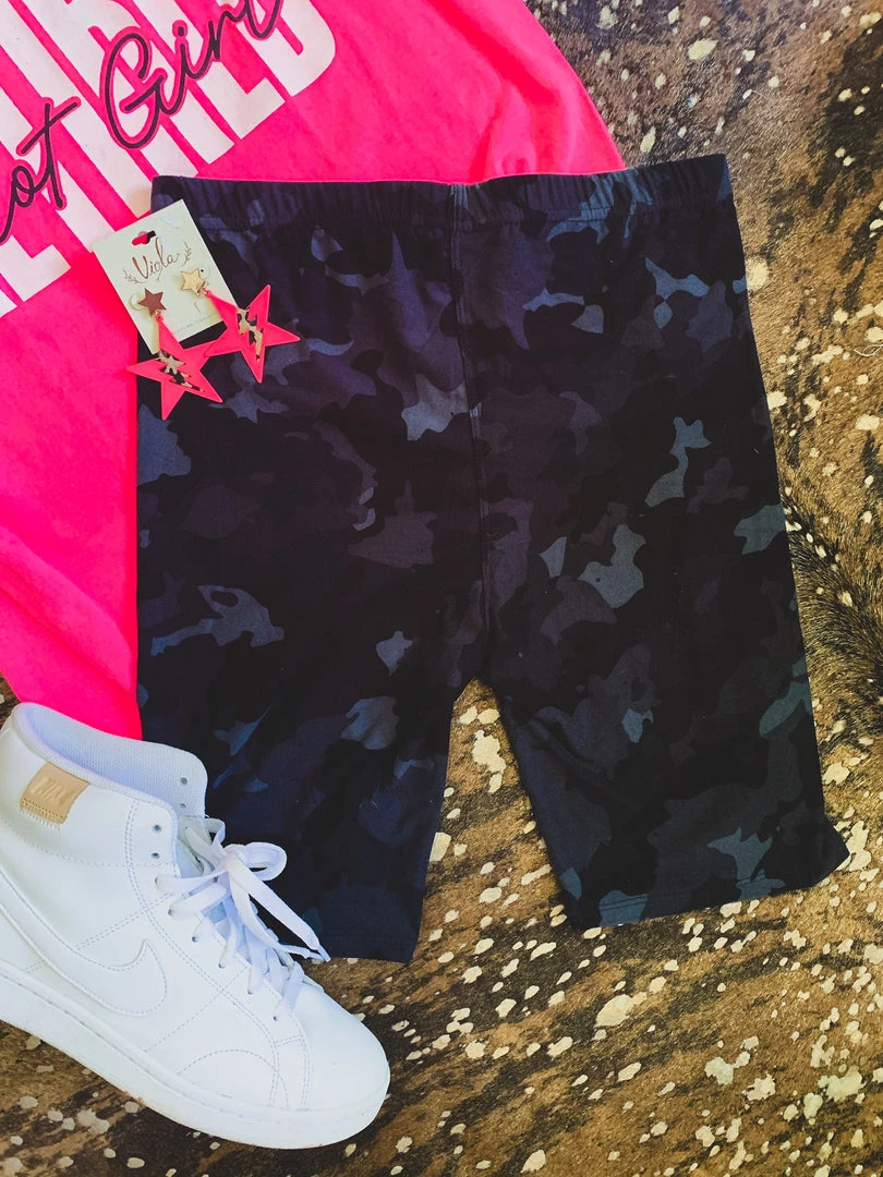 Grey camo print super soft and stretchy biker shorts. Shorts are made comfortably and the material is SUPER soft. Pair with your favorite graphic tees or tanks!
