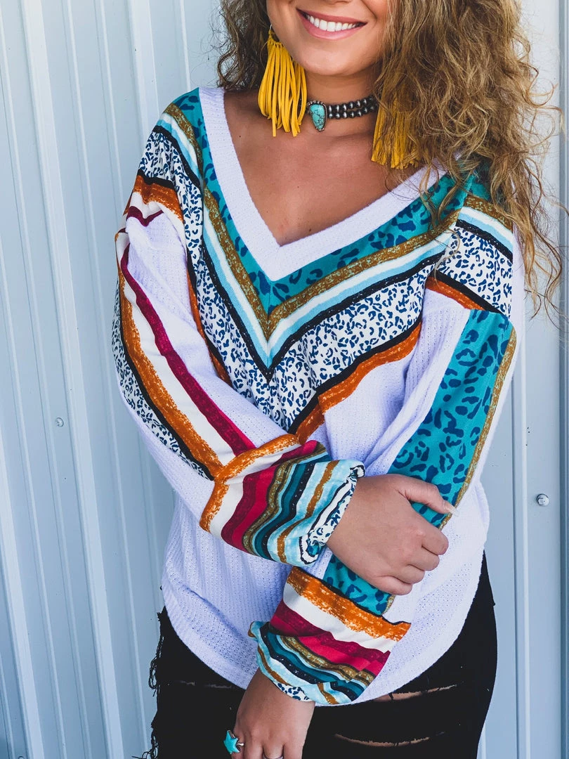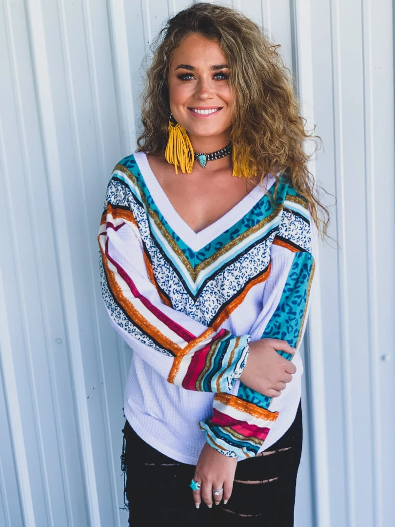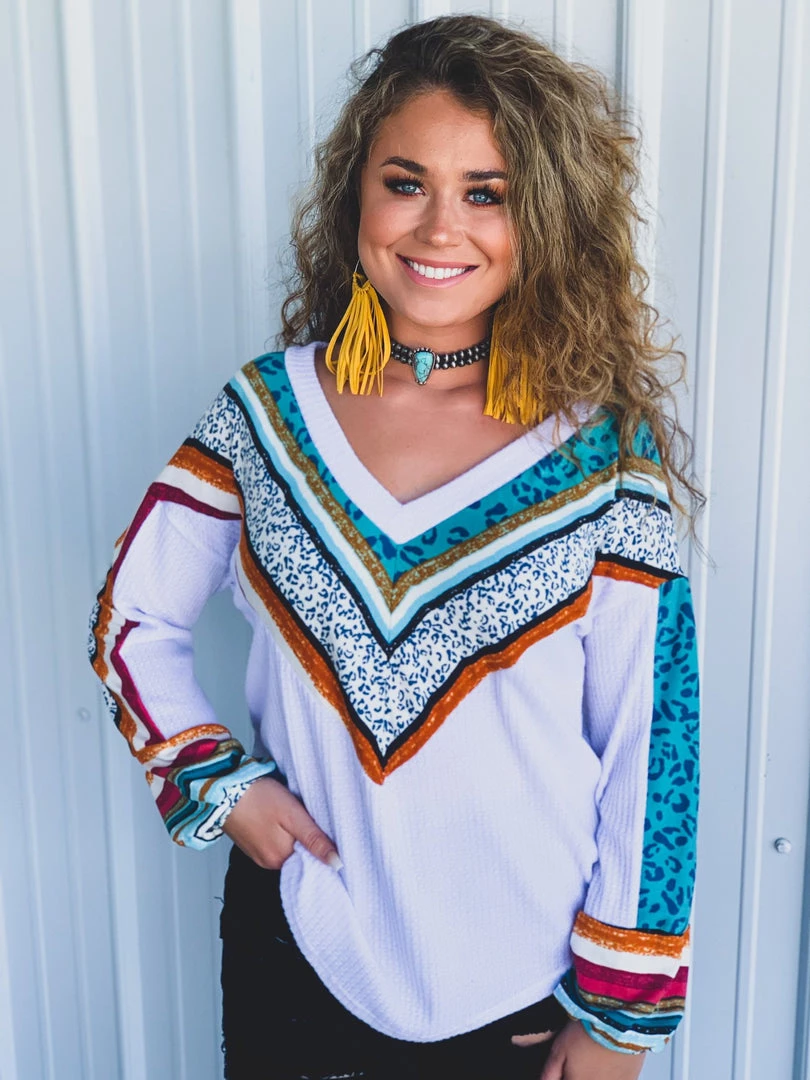 White waffle knit top with the cutest leopard print and colorful stripe pattern, perfect top for all your Fall looks. Features long sleeves with a white snow leopard pattern, jade blue leopard print pattern, distressed stripe pattern with colors of red, rust, and mustard, a v-neckline, snow leopard print wrist cuffs, and the top has a white snow leopard pattern, jade blue leopard print pattern, distressed stripe pattern with colors of red, rust, and mustard in a v-like pattern. Perfect to pair with our Weston Earrings in Mustard, The Diboll Choker, and our Annona Wide Leg Pants for the complete look.