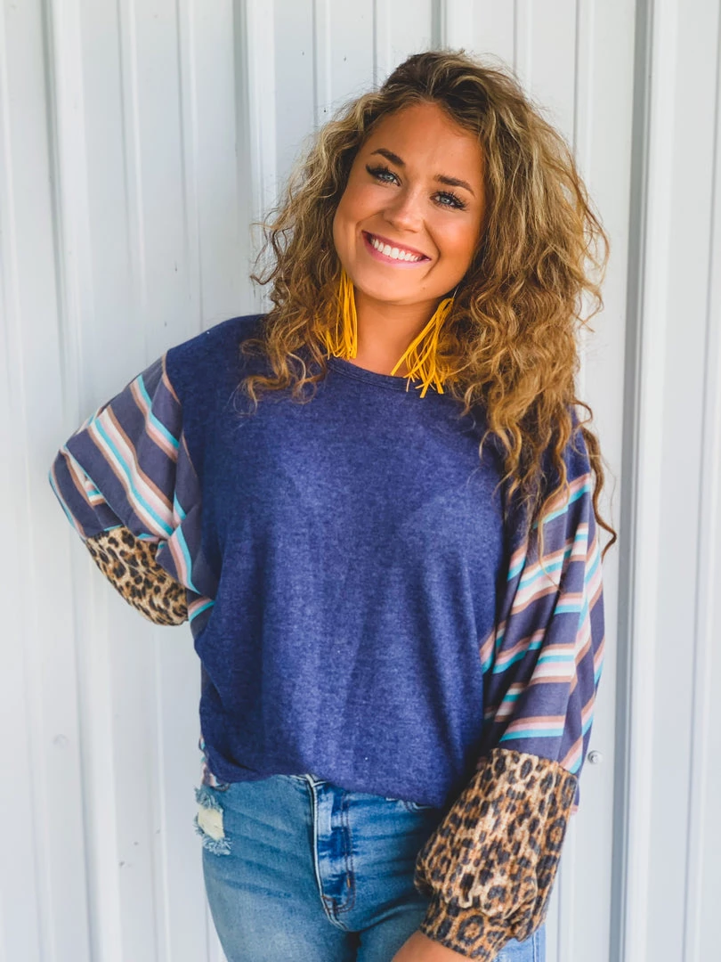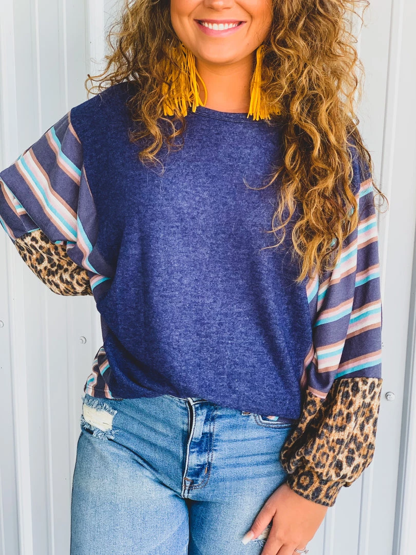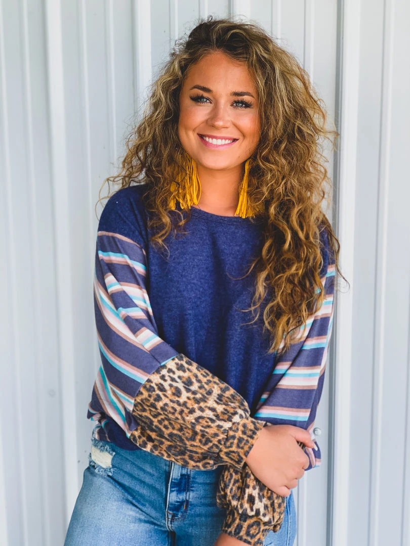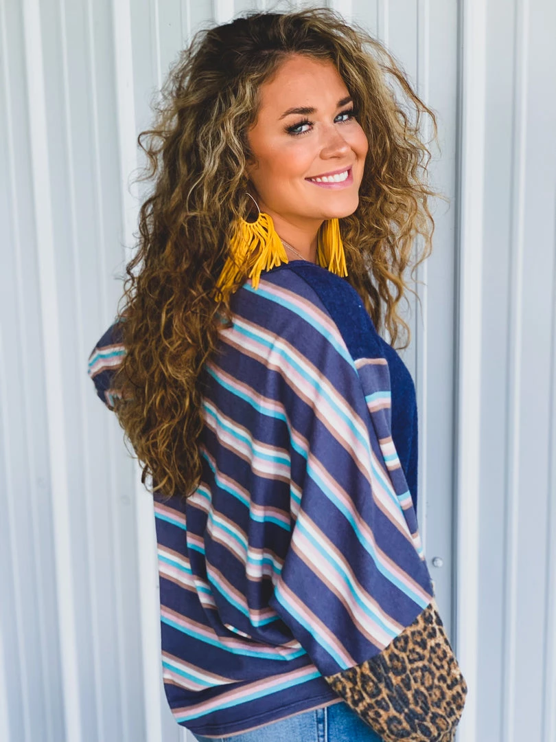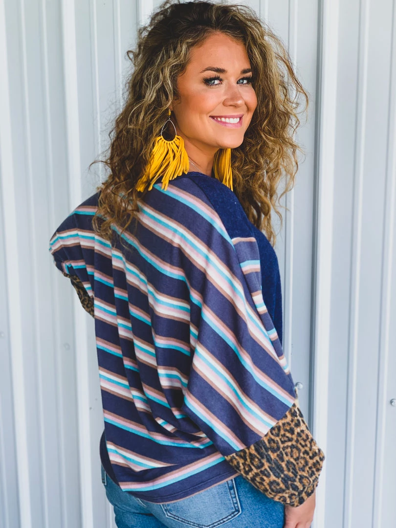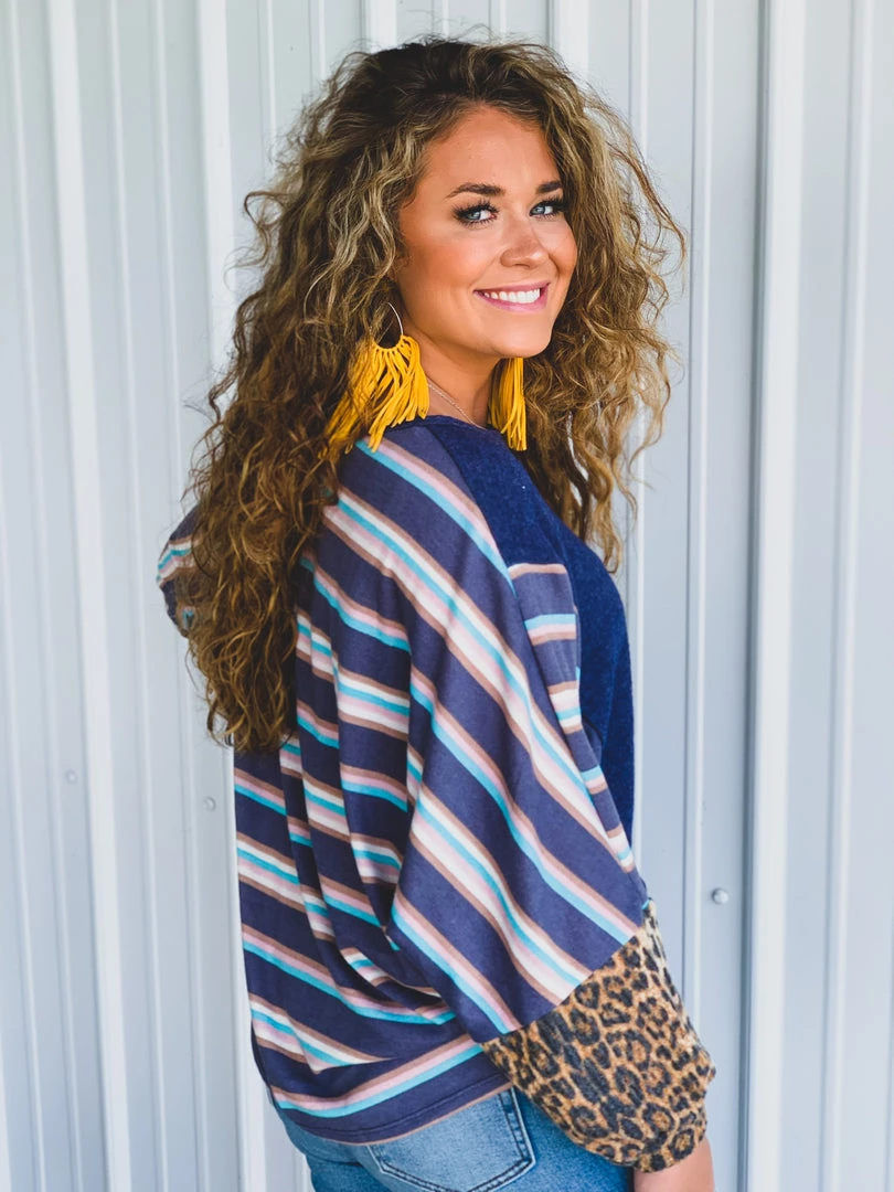 Navy blue pullover top is perfect for your Fall looks! Features a solid navy front, striped and leopard print bat wing style sleeves, a full striped pattern back, and leopard elastic wrist cuffs. Striped pattern has colors of tan, blue, white, and mauve. So cute to pair with leggings or pair with our Brundage Pants for the complete look!