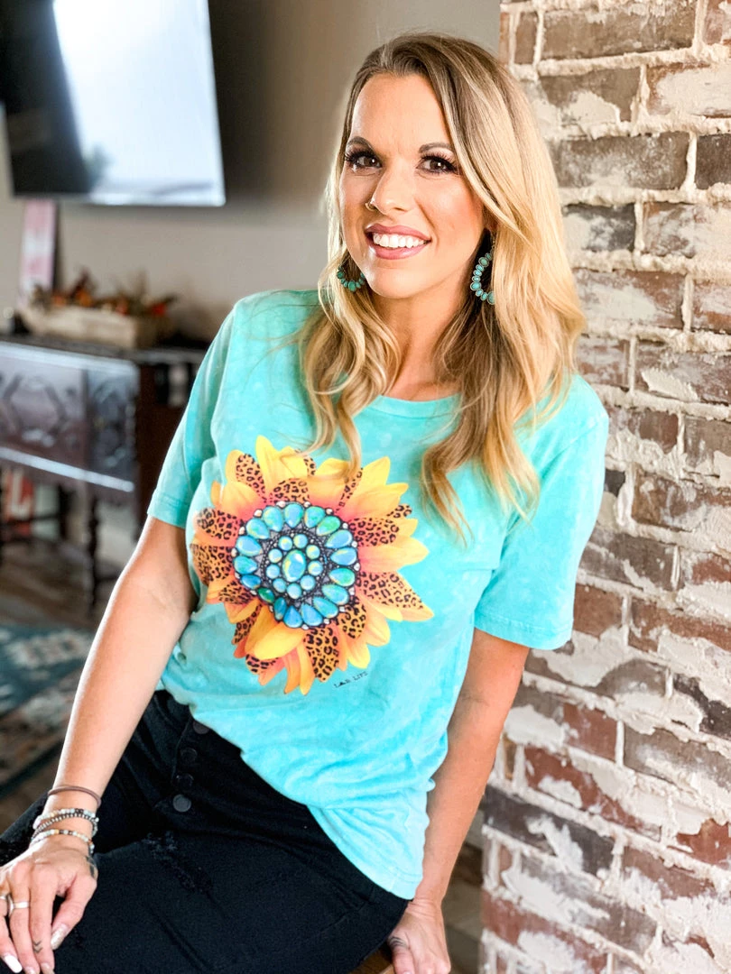Turquoise acid wash graphic tee with a mustard leopard print sunflower with a turquoise concho at the center. This turquoise sunflower tee is perfect for any and every occasion. Tee is super soft and the outfit and jewelry choices are endless!