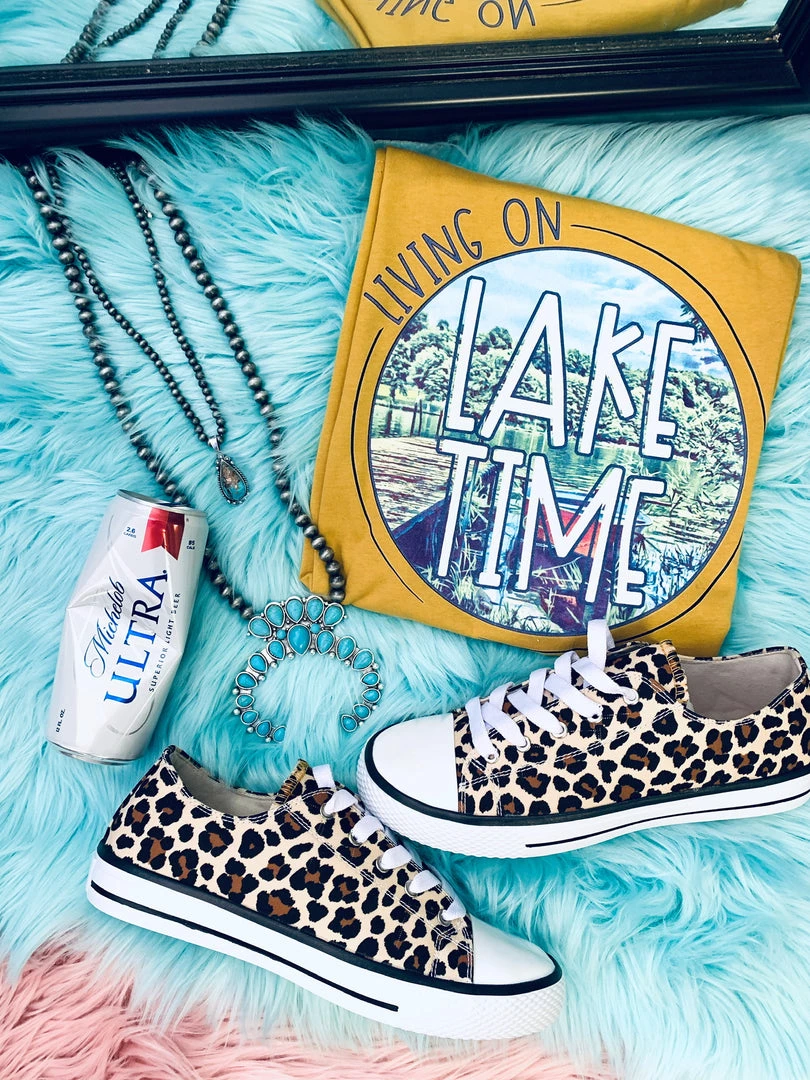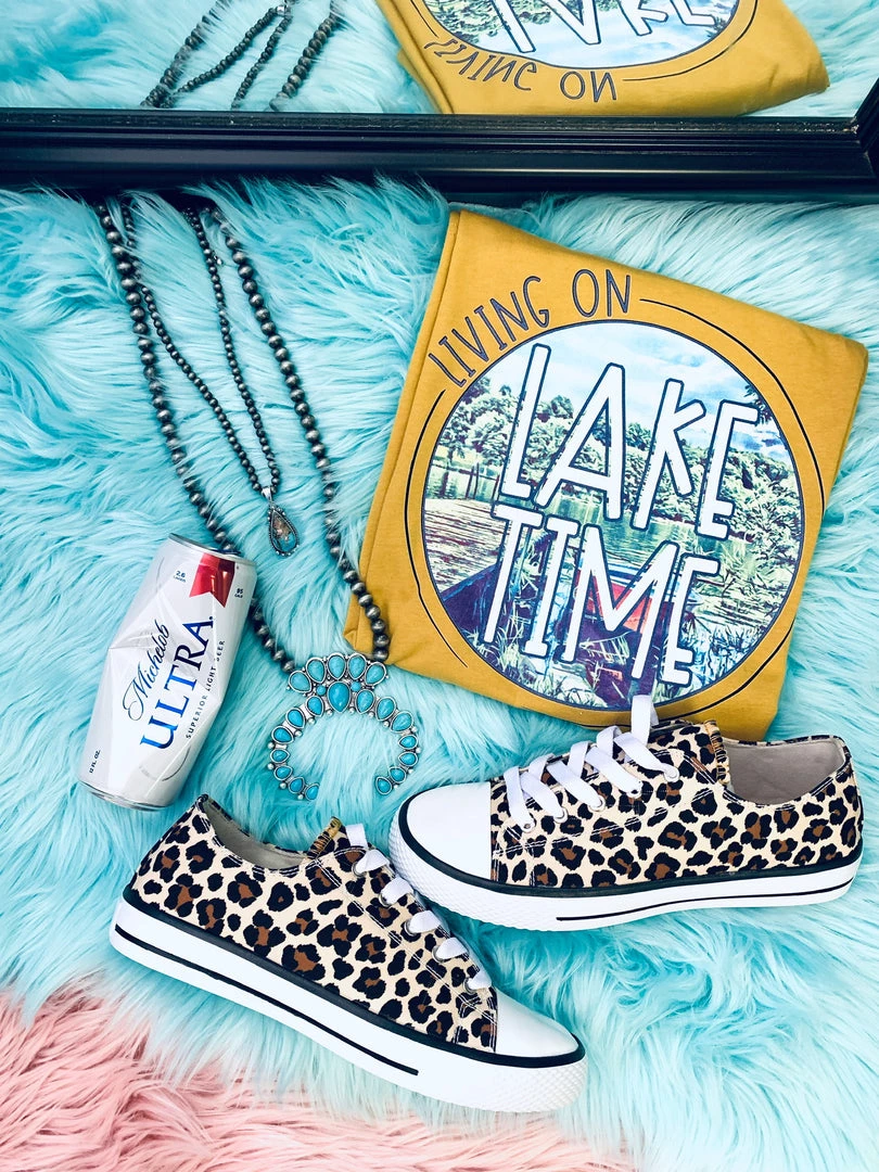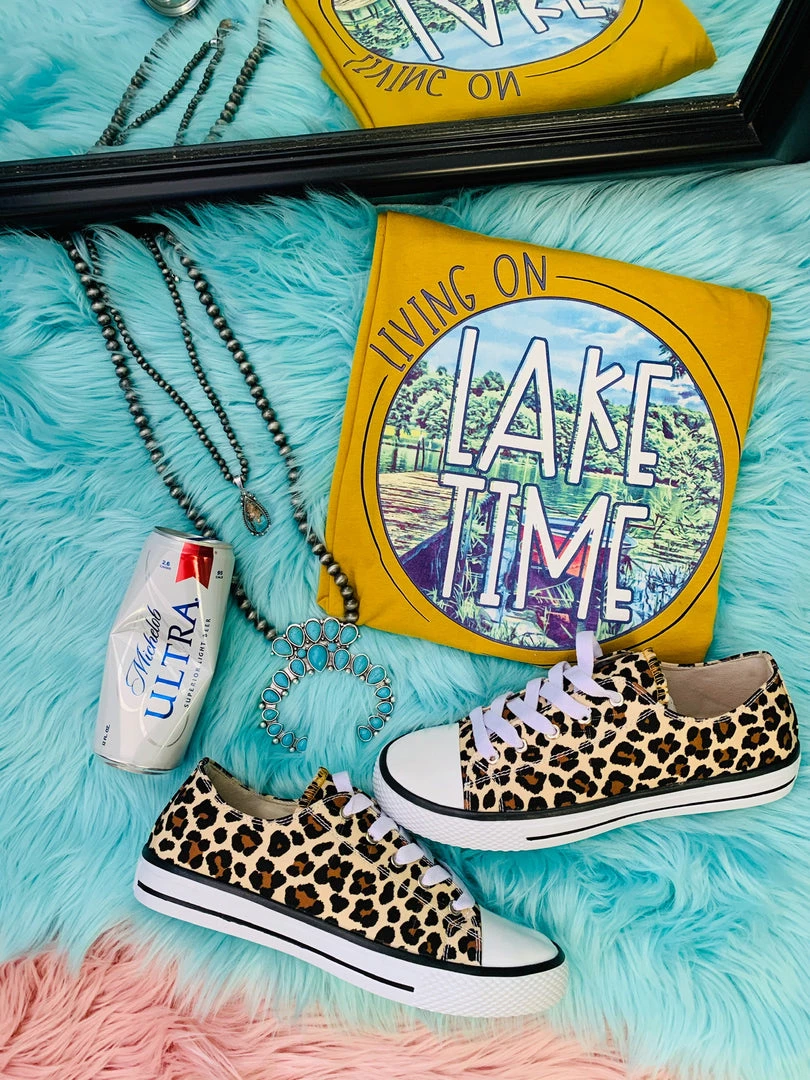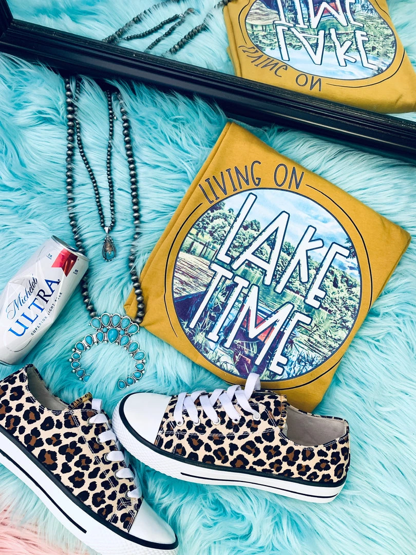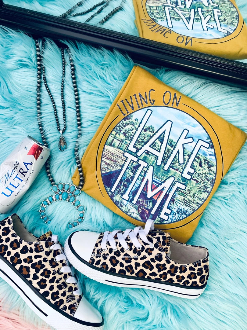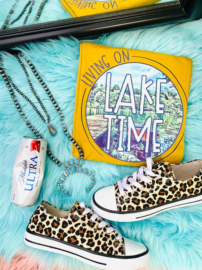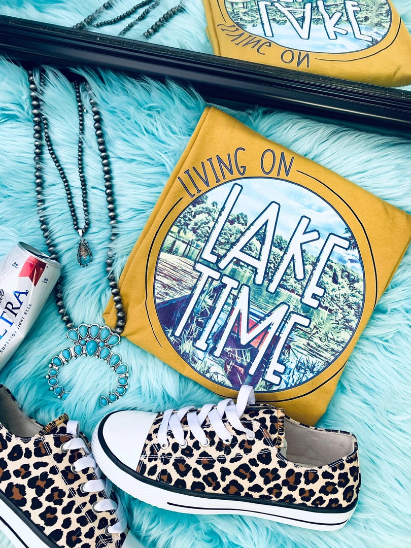 Mustard graphic tee, “Living on LAKE TIME” is the perfect tee for all your lake day fun! Tee features a round graphic of a lake, pier, boat, and the quote, “Living on lake time.” Pair with all your denim shorts for the Summer!