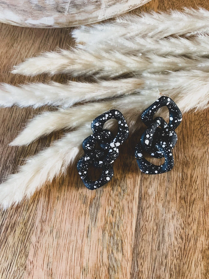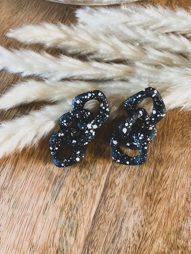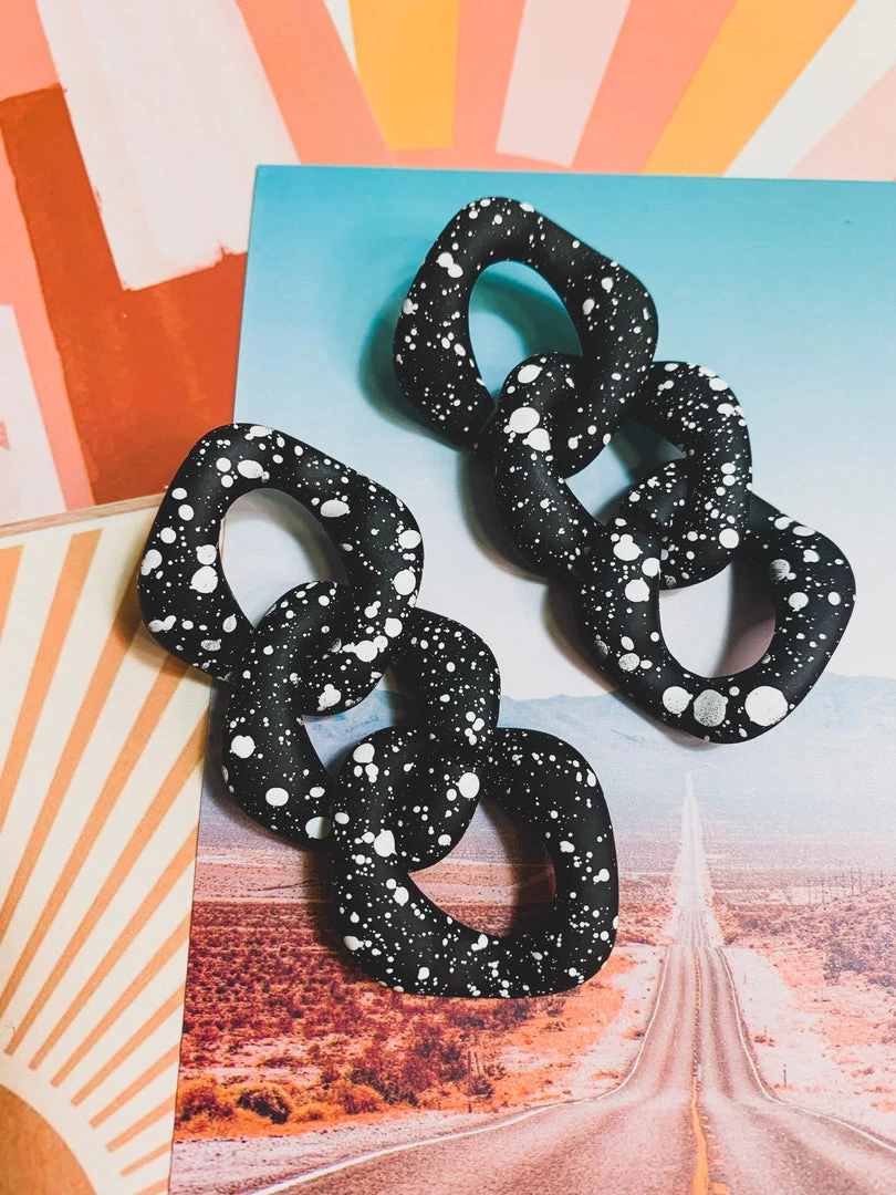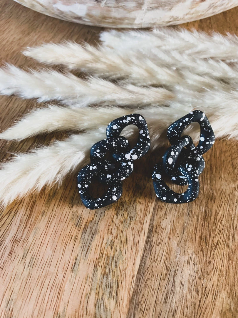 Black chain earrings are giving us all the fun edgy vibes! Features Three black chain links with a white paint splatter style pattern, and a push back post. Super light weight and so cute. We’re obsessed!