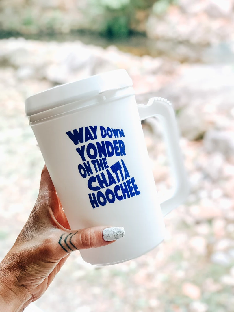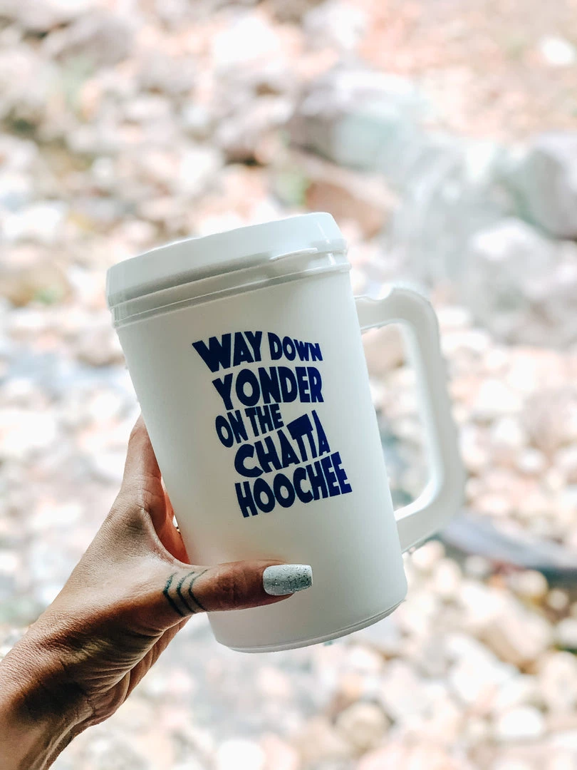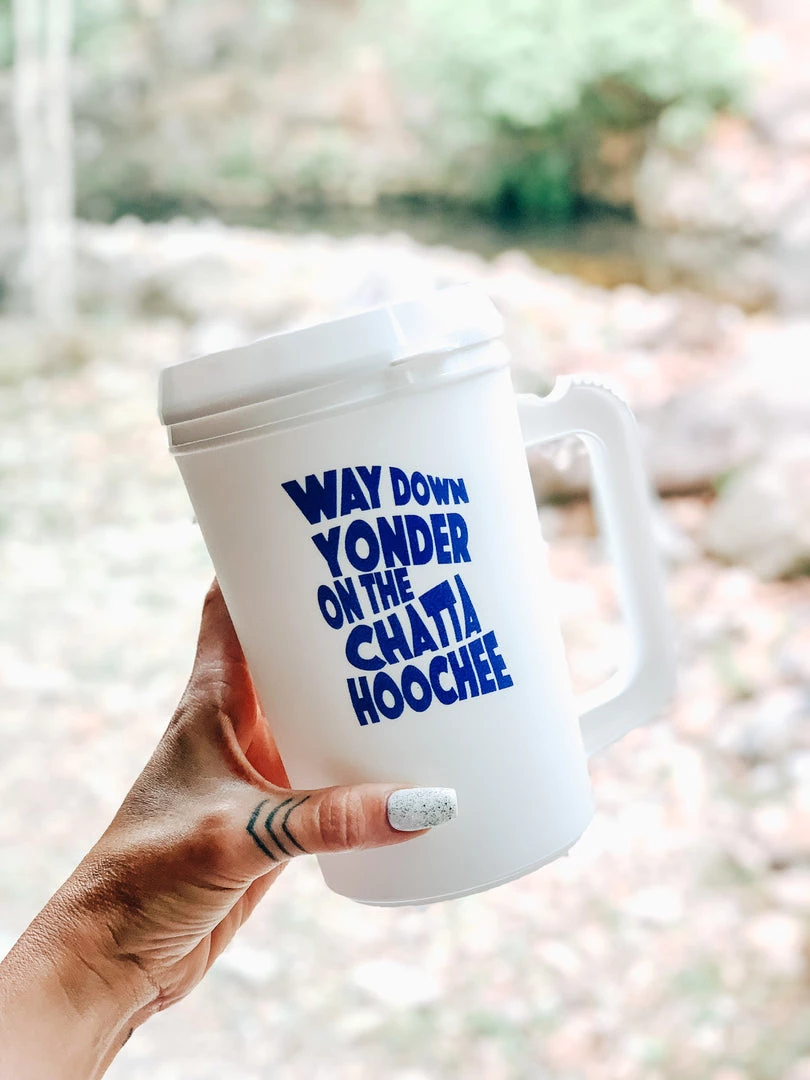 White 22oz “Way Down Yonder On The Chattahoochie” Alan Jackson lyric inspired cup is perfect for all your on the go drinks! Mug is perfect to take to ball games, work, lake days, and river trips. Cup features large handle with thumb grip, a push-on lid with drink opening, straw hole, and the cutest navy blue Alan Jackson inspired lyric quote, “Way Down Yonder On The Chattahoochie.”Â