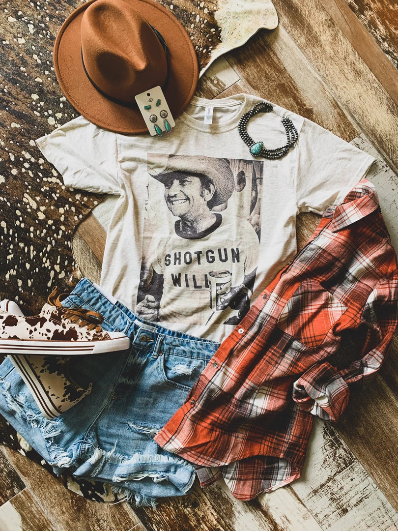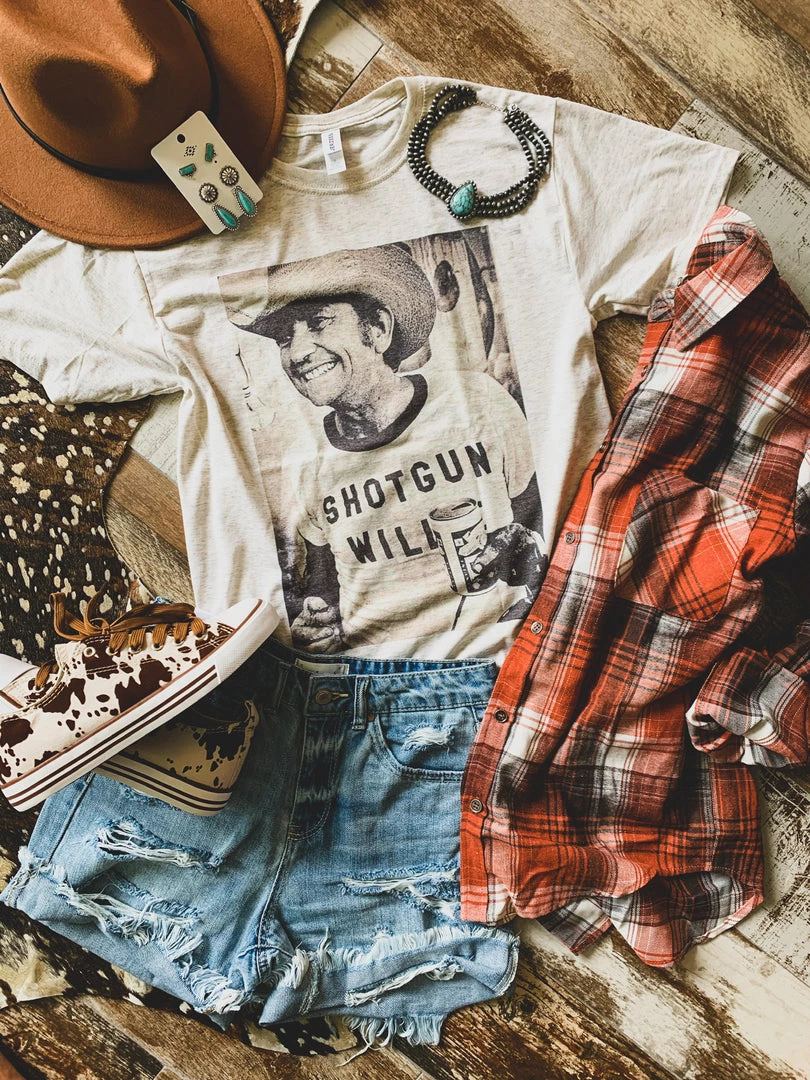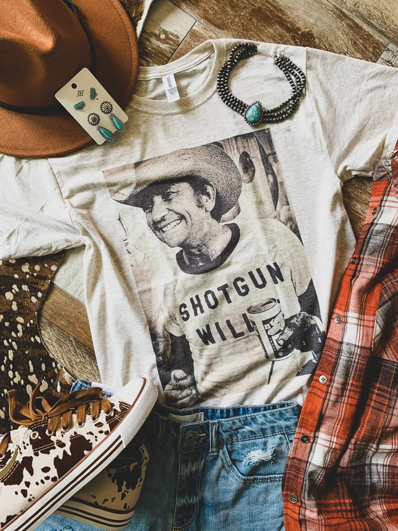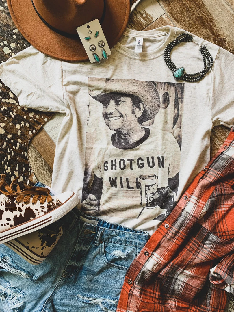 Heathered cream stone colored “Shotgun Willie” graphic tee is perfect for all our Willie Nelson fans! Tee features the vintage graphic of a young Willie Nelson wearing a “Shotgun Willie” tee holding a beer and smiling real big. Giving us all the cool western vibes.