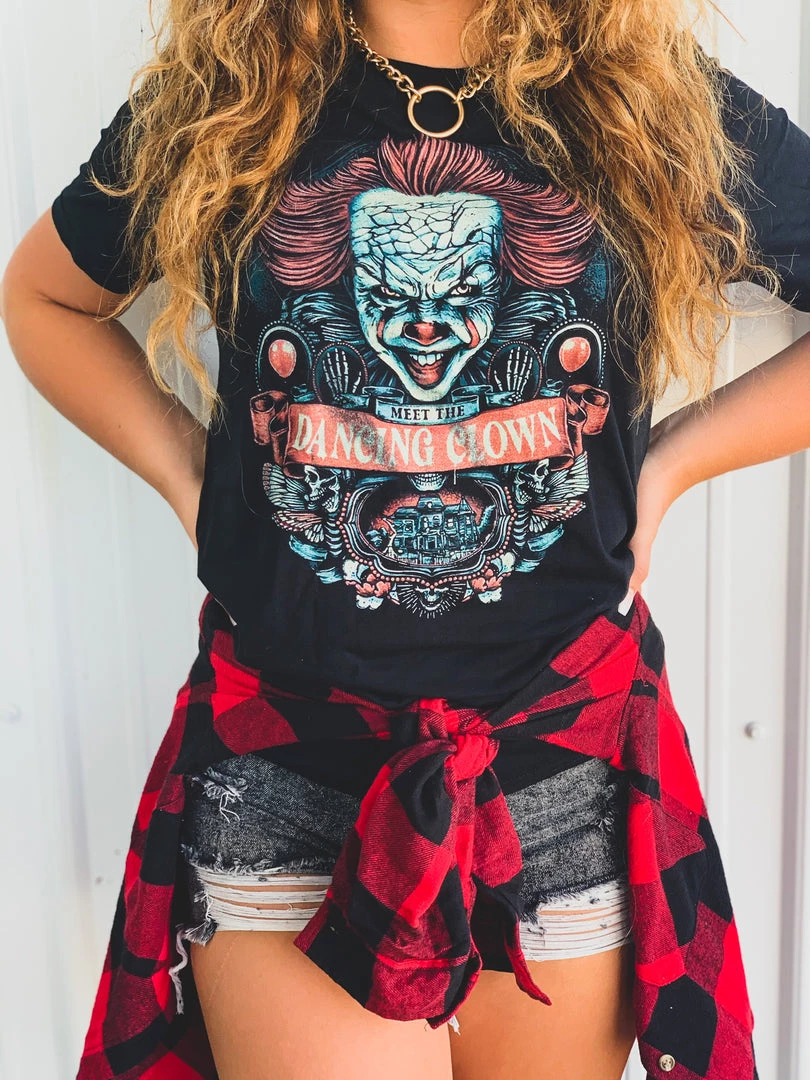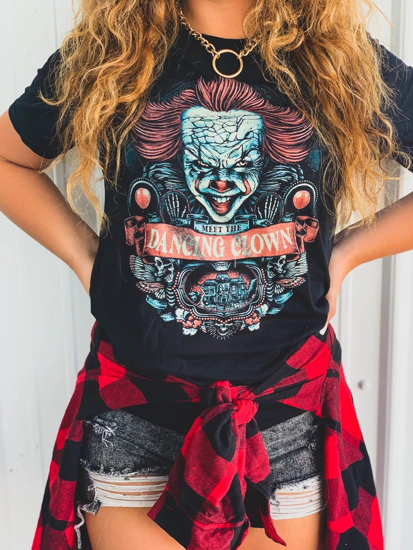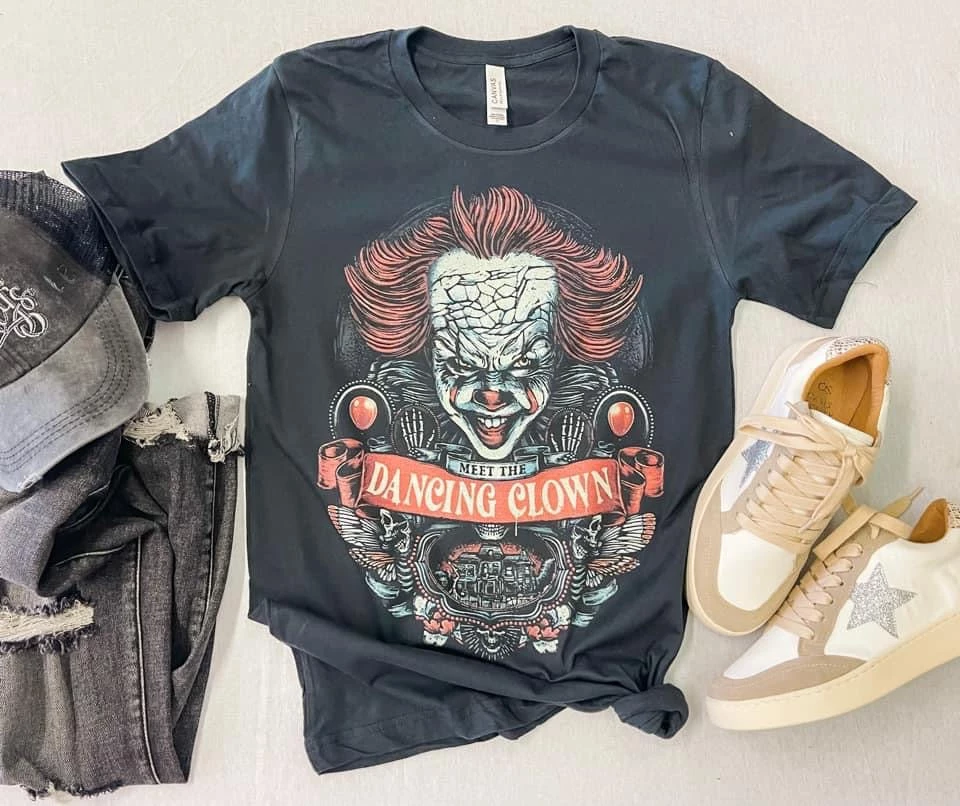 IT Halloween black graphic tee features Pennywise the clown, red balloons, butterfly wings, skulls, skeleton hands, and the quote, “Meet The Dancing Clown.” This horror movie classic a forever favorite and it’s the perfect tee for all your Halloween looks!