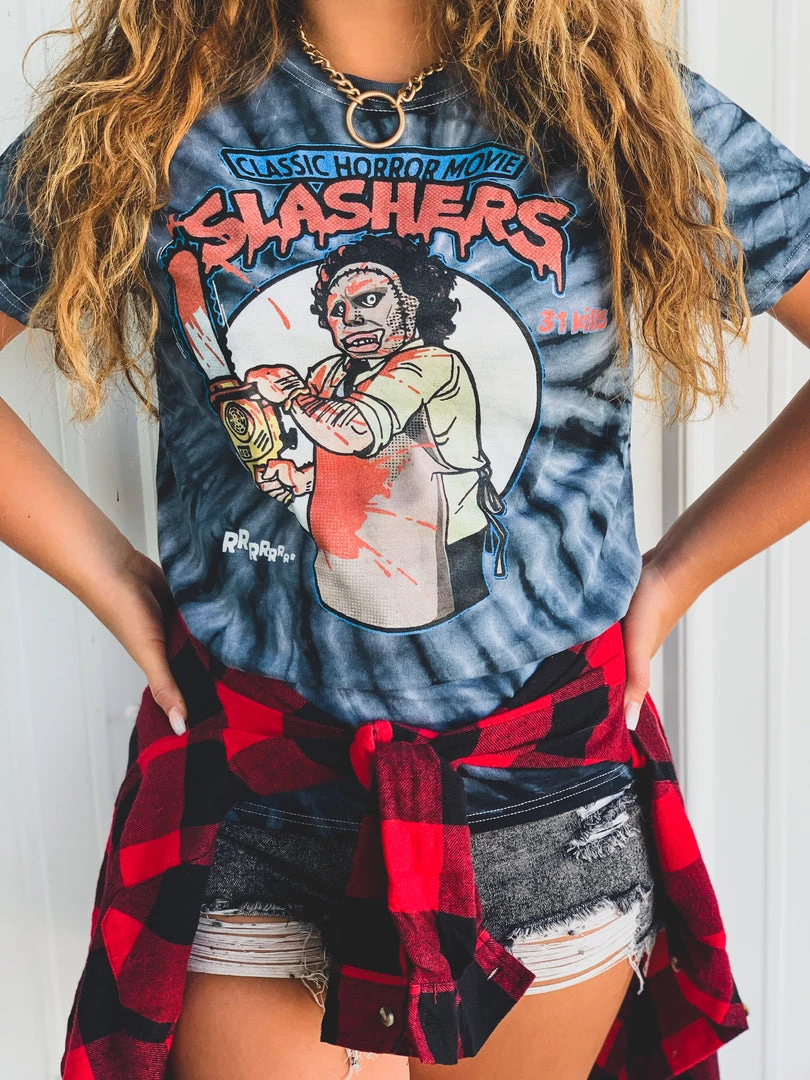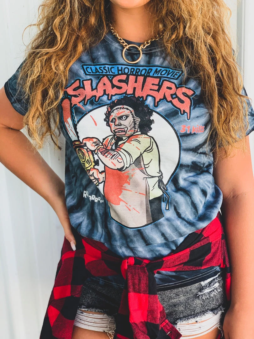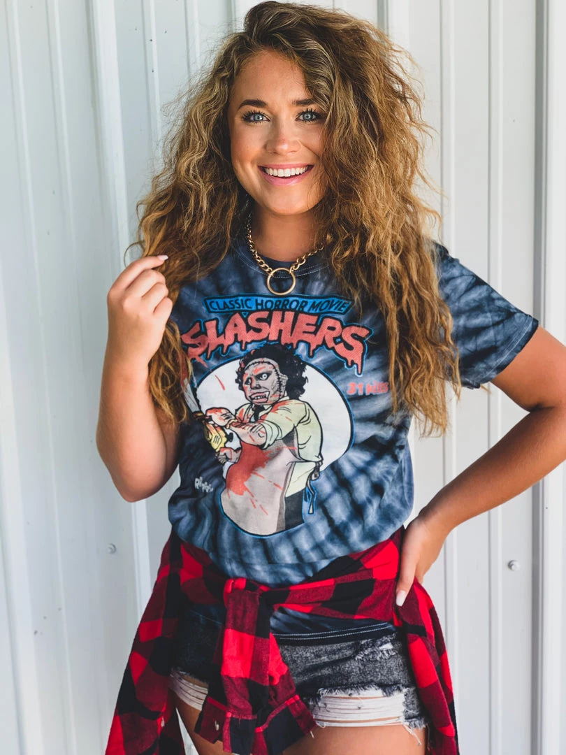 Blue tie dye “Classic Horror Movie SLASHERS” graphic tee is a must for all your Halloween looks! Tee features the quote, “Classic Horror Movie SLASHERS” “RrRrRrR” and “31 Kills” with the graphic of the slasher holding a chainsaw dripping with blood. So many cute details in this favorite classic!