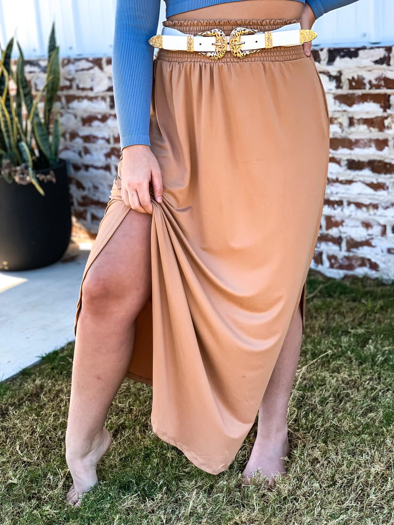 Super soft classic camel skirt will be your favorite year round outfit go to! Skirt features a super soft breathable material, high-waisted smocked elastic stretchy waistband, a maxi length with side slits. Such a good go to skirt for all your Spring, Summer, Fall, and Winter looks! And not to mention..SO fabulous!