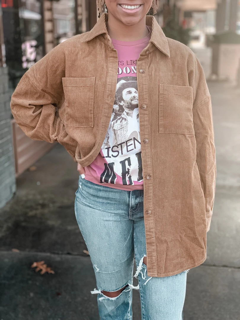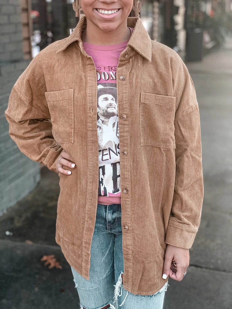 Our new beautiful camel corduroy shacket is the perfect finishing layer to pair over all your favorite Fall crop tops, bodysuits, and Christmas tees. Features a super soft camel corduroy, collar, button wrist cuffs and button front closure, and two oversized front open slip chest pockets. This one will be a forever favorite!