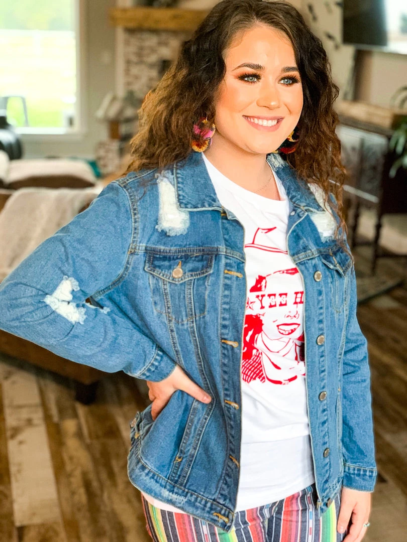Longline dark washed heavy distressed denim jacket features distressing on the collars, sleeves, front chest, and distressing on the back. Denim jacket is a full button up with two side pockets, button wrist cuffs, and two front button chest pockets. s!