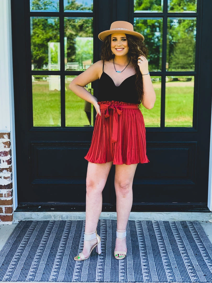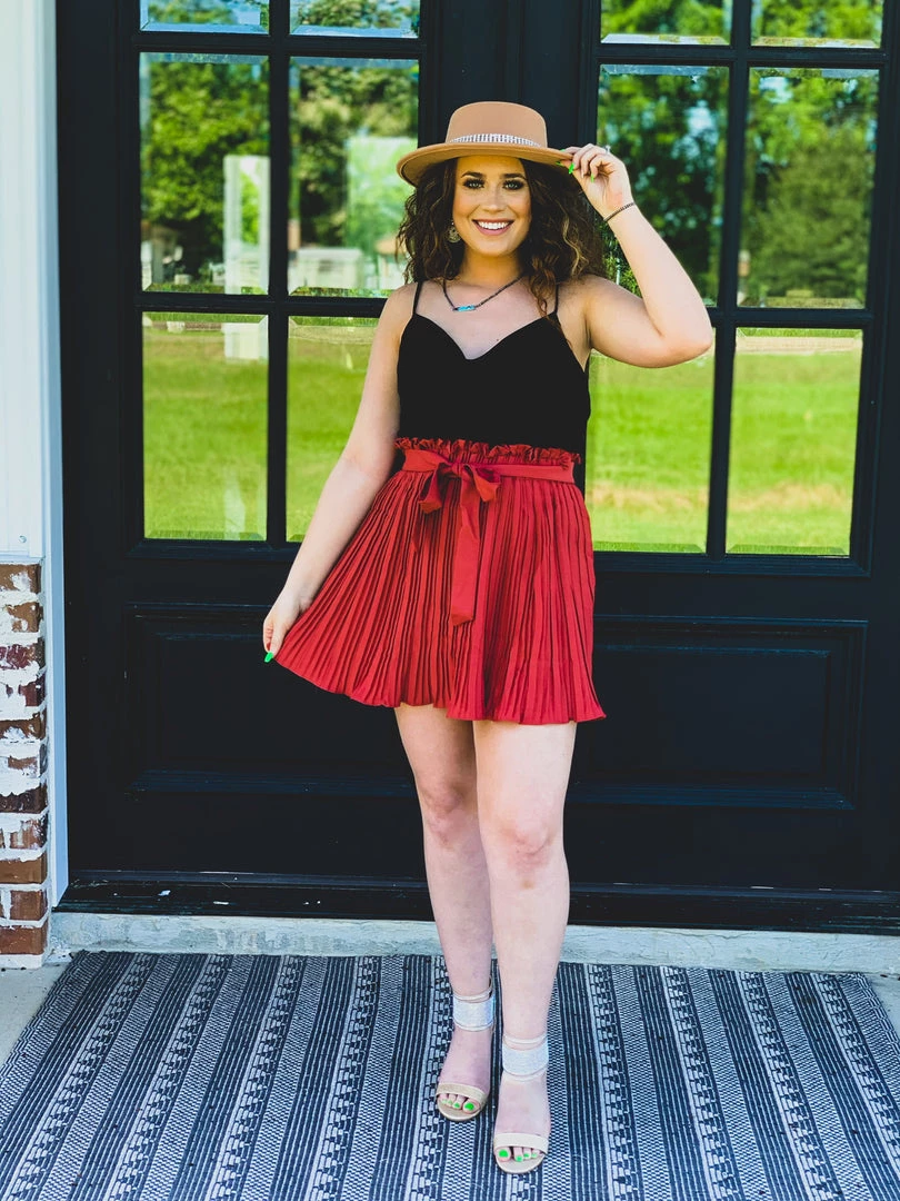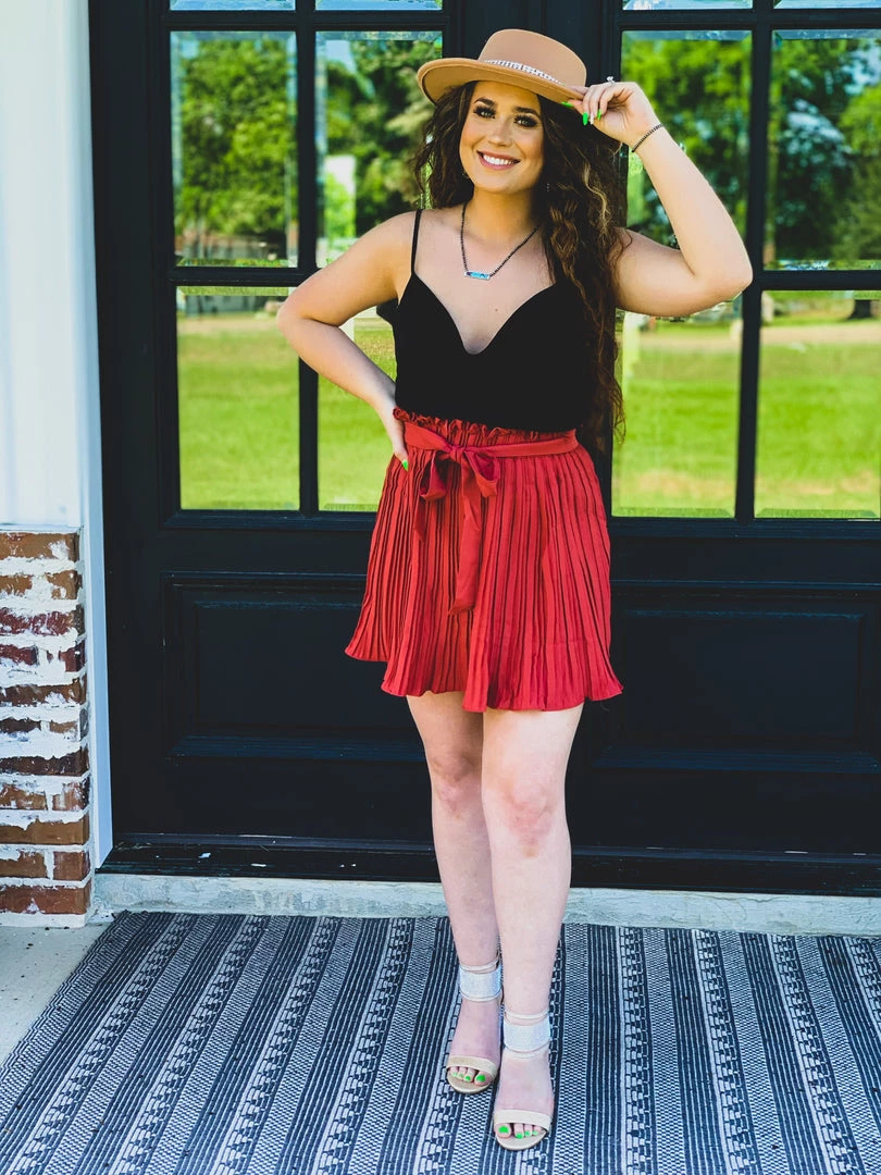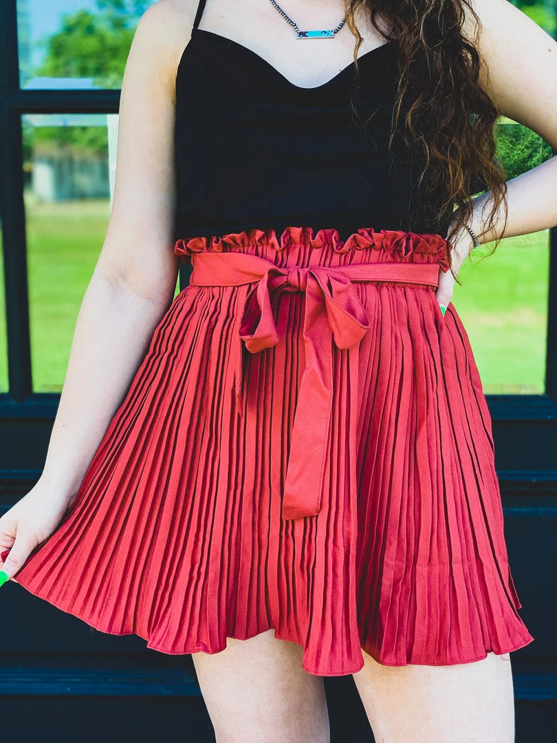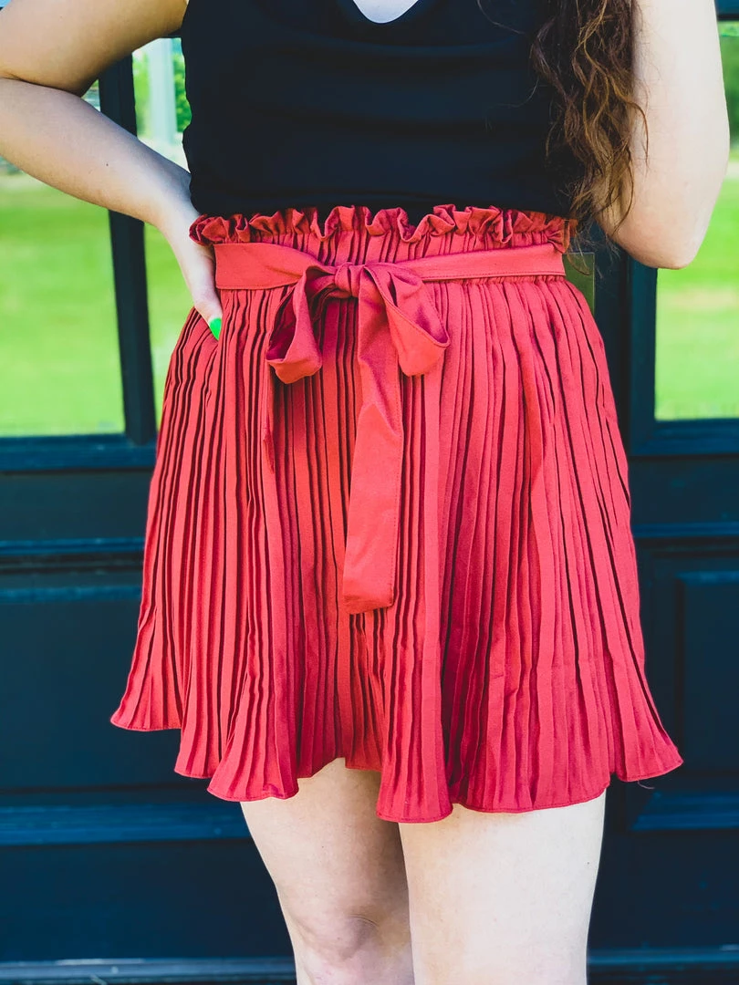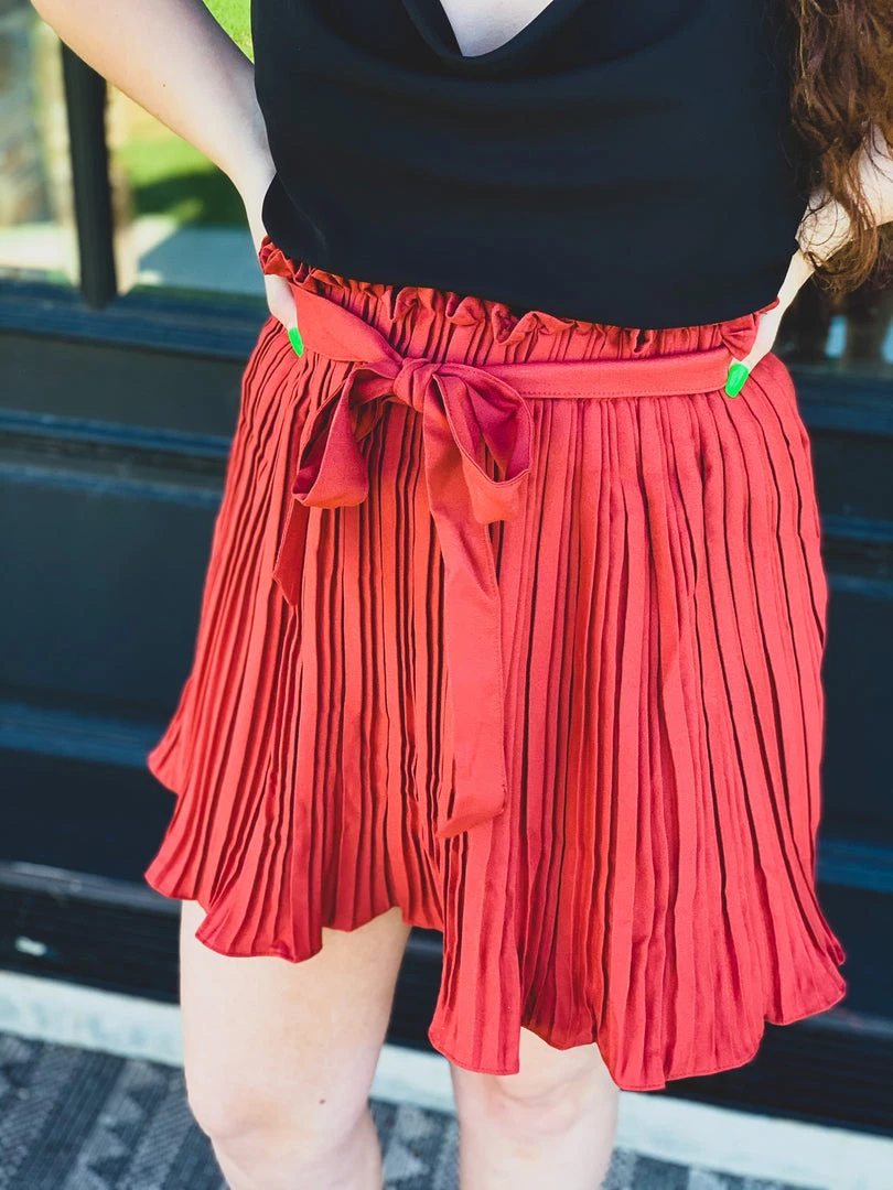 Rust pleated skirt is a Summer outfit MUST! Skirt features a deep beautiful rust color, is pleated, has a layering underneath, and a ruffled smocked waist with a cute self tie. Skirt has a super stretchy waist. Pair it with your favorite tank tops and bodysuits!