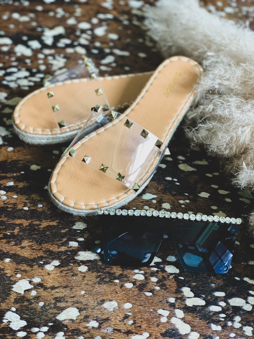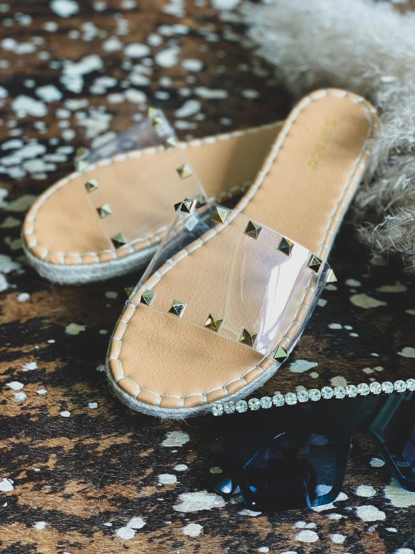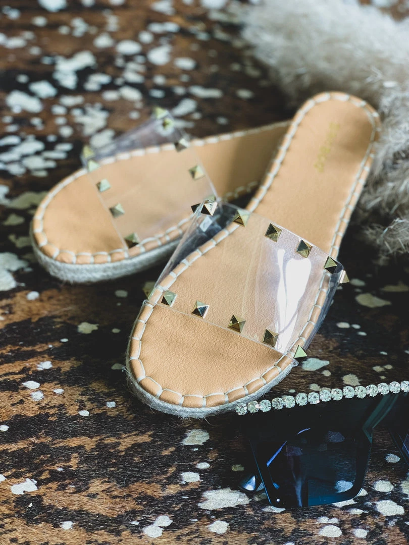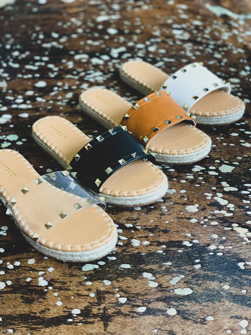 Sandals feature one wide clear foot strap with two rows of gold pyramid studs and espadrille detail siding. Shoes have a comfortable sole padding. Perfect Summer shoe to pair with all your denim shorts!