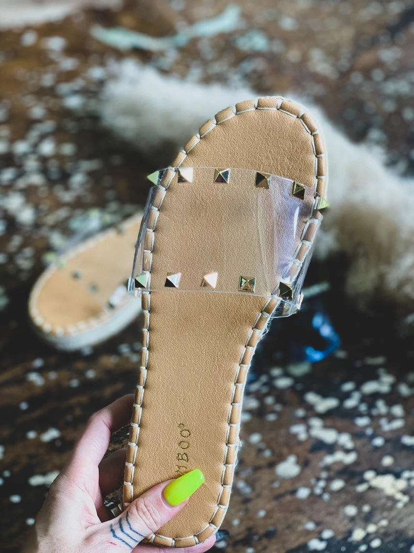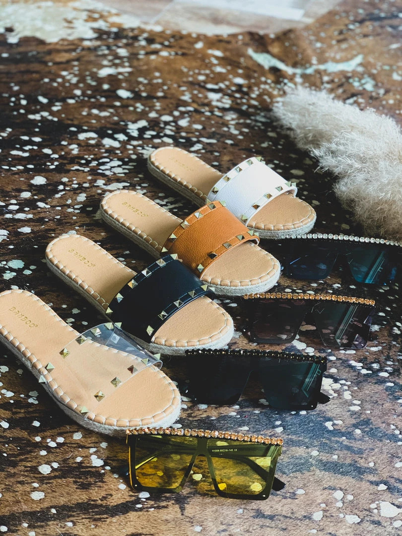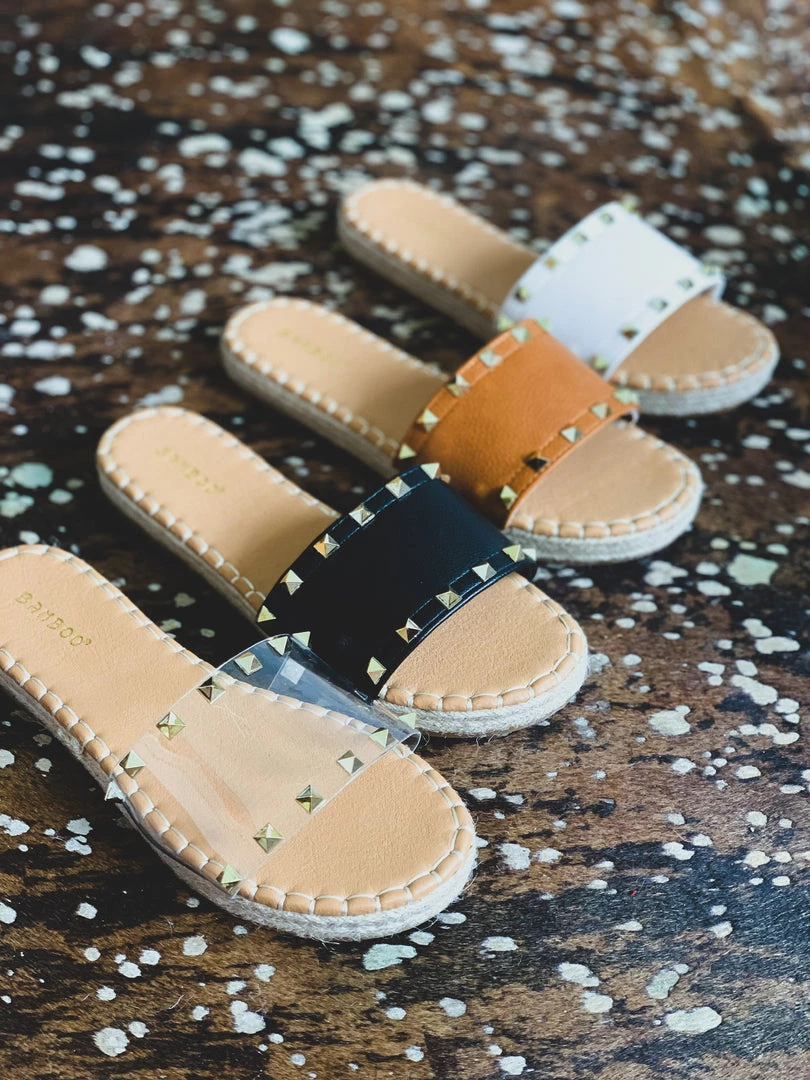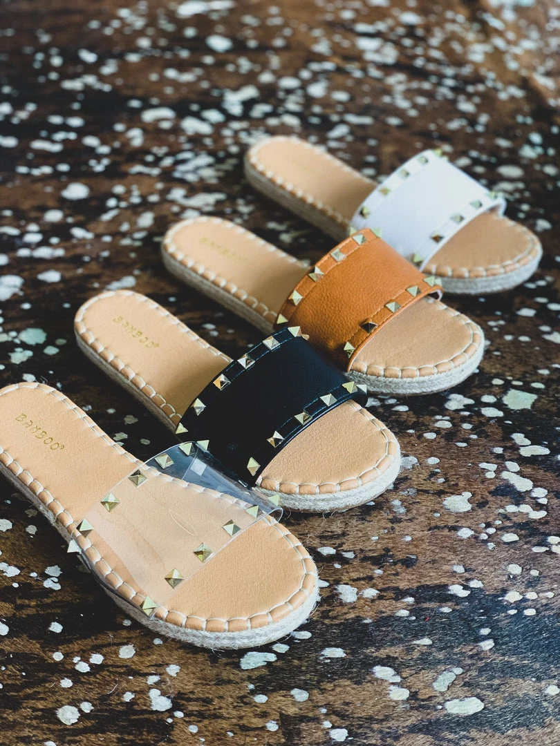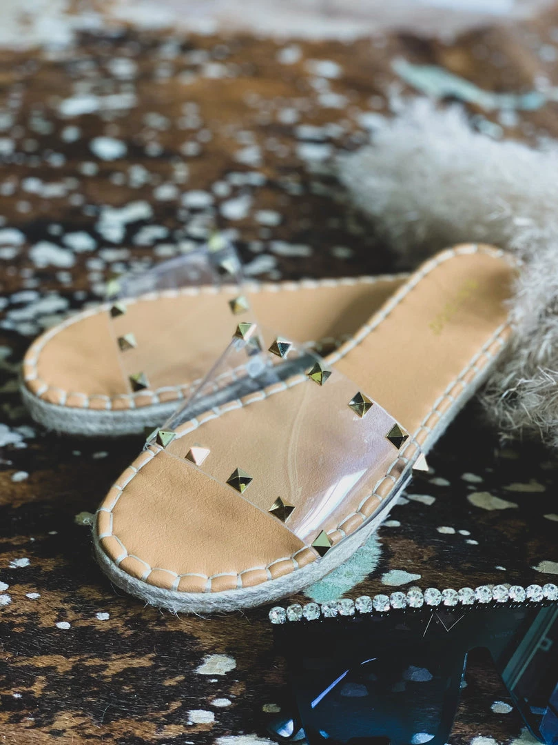 Sandals feature one wide clear foot strap with two rows of gold pyramid studs and espadrille detail siding. Shoes have a comfortable sole padding. Perfect Summer shoe to pair with all your denim shorts!