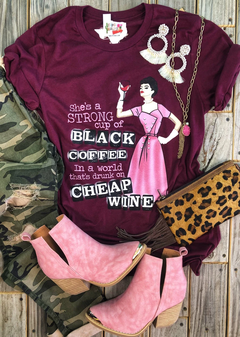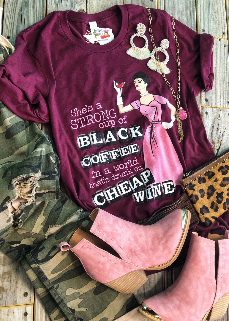 Maroon “She’s A Strong Cup Of Black Coffee In A World That’s Drunk On Cheap Wine” retro graphic tee. Glamour gal holding up her fav glass of red wine.Â