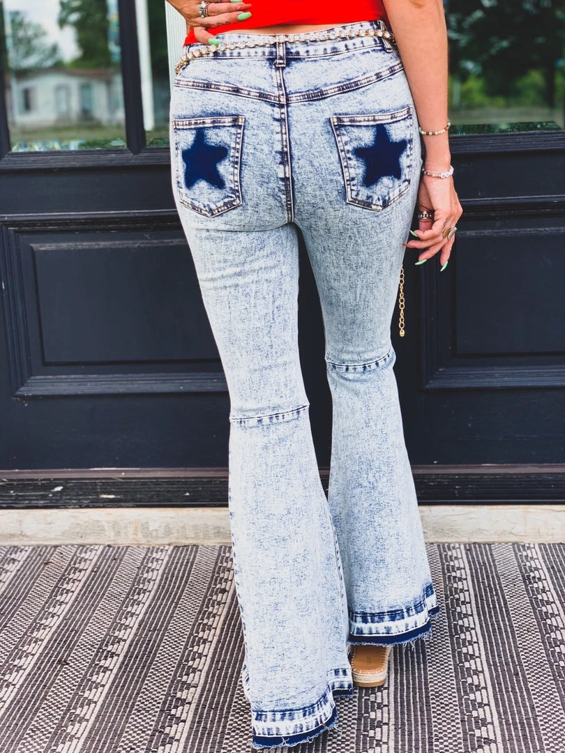 Vintage acid wash bell bottoms have our Gypsy Waltz hearts swooning! Bell bottoms feature a high rise waistband, button fly, vintage acid wash denim, a darker denim frayed hem, and the cutest star detail on the back pockets. Bells are stretchy and so perfect for all your 4th of July looks! Pair with our Austin Top in Red for the complete look!